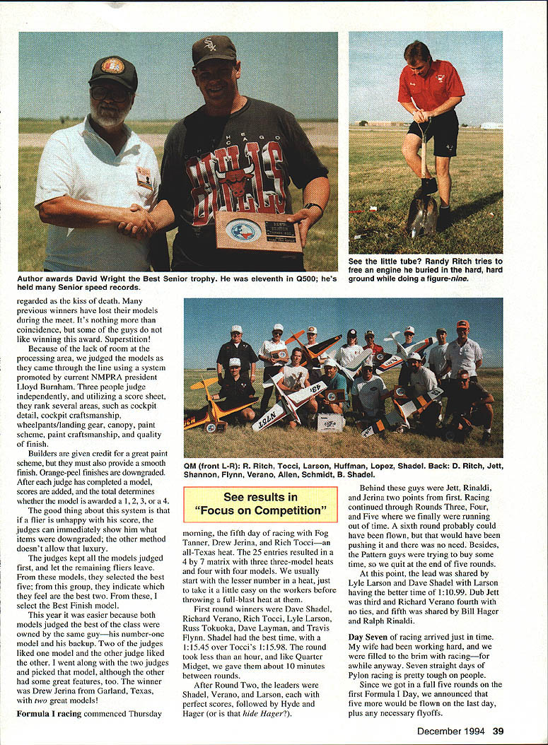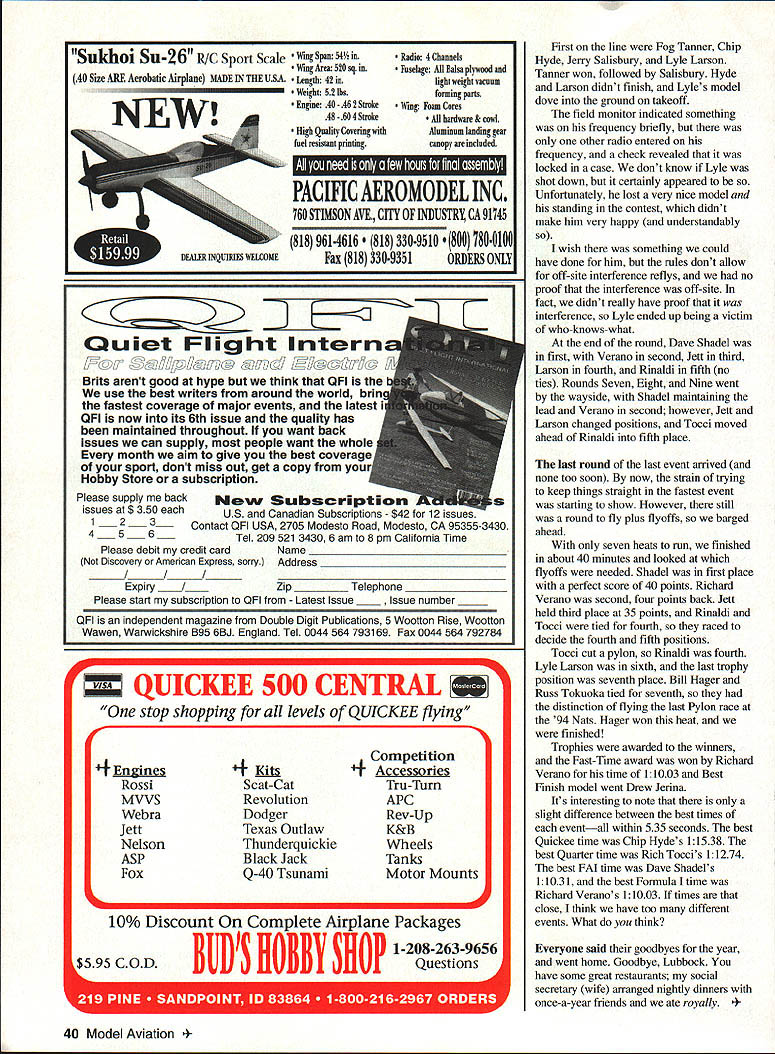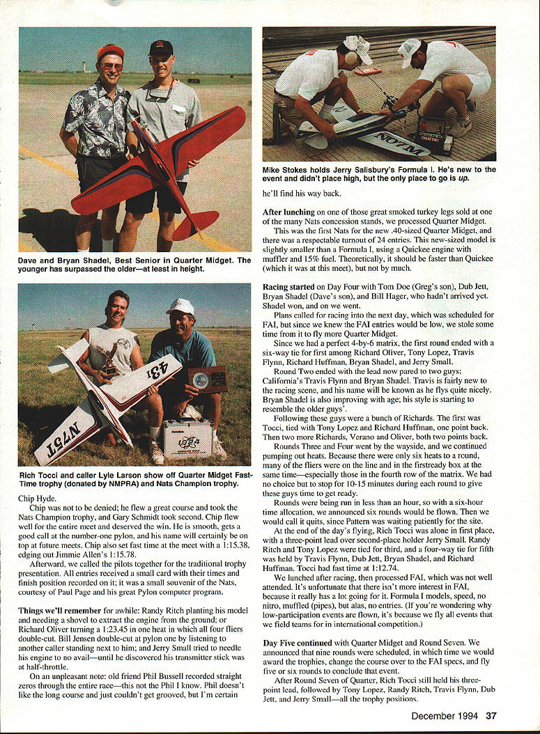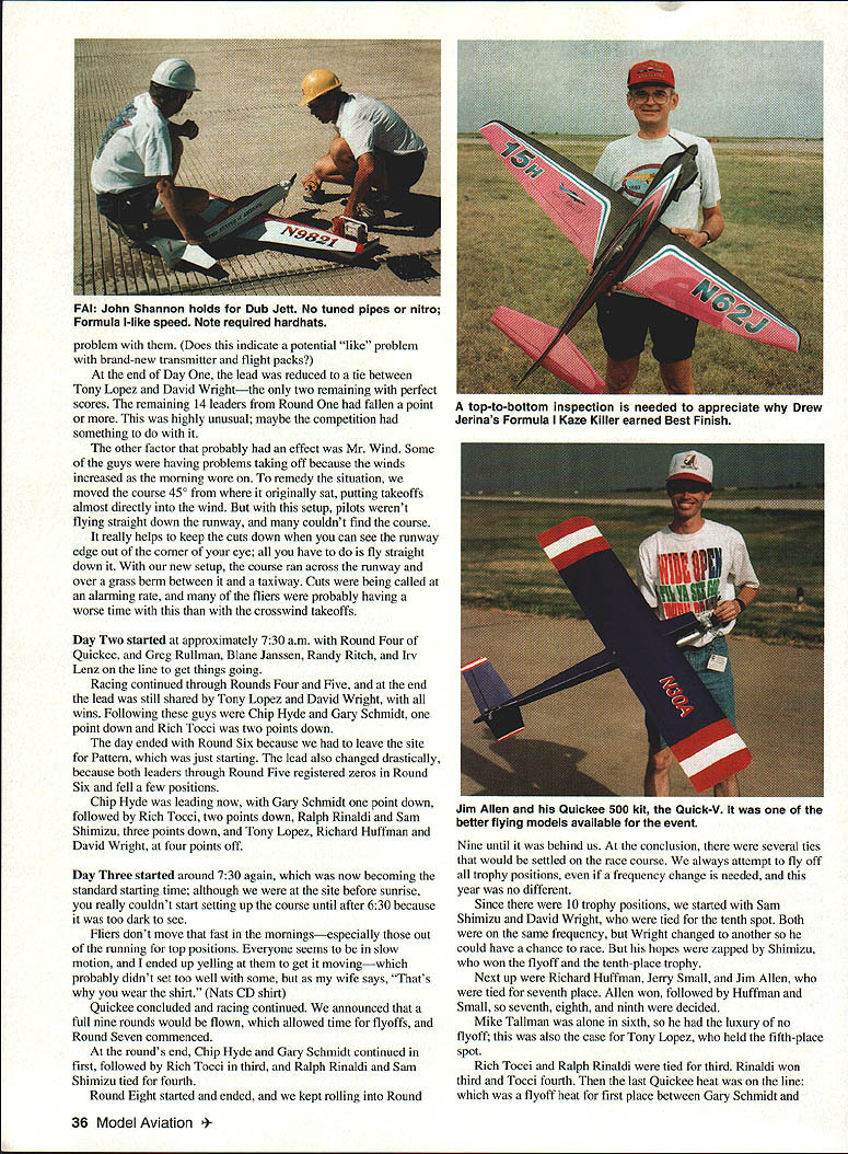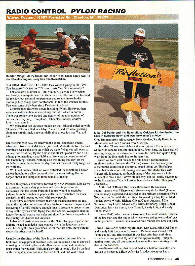 RADIO CONTROL PYLON RACING I' SEVERAL RACERS TOLD ME werent going 1994 Nats because its too hot its too dusty its too windy hate say told sobut guys blew weather lovely got quite warm afternoons after finished day mild temperatures steady breeze mornings kept things quite comfortable fact weather Nats some best since Ive involved Contestant entries down including Pylon However adequate numbers everything FAI normal somewhere around one-quarter total number entries eveiythingSailplane Helicopter Pattern Control Lineyou name processed 102 Quickee models 15th ended up 63 entries resulted 4-by-16 matrix guessing about ten rounds total since daily time allocation 7 am- 1 pm first race day removed cages flag poles chairs tables etc AIVIA truck couldnt before first morning because strip flying still open commercial aviation time set up 15minute pilot meeting 830 am hour-and-a-half late something abhor Nothing else flying day could have gone farther day makes really tough workers found Out later restricted something never gave thought radio communication batteries failing barged ahead completed three rounds racing Earlier year committee formed AMA President Don Lowe examine current safety practices make improvements announced longer Formula course would used judging number phone calls received before Nats decision did set too well some people Committee members decided Quickee become too fast due introduction several new high-performance engines average flier did have enough time prepare properly turn pylons flying short course agreed longer Formula course safer should flown everywhere country Quarter Quickee also heard positive comments Nats guy particular told attended local contest long course used thought great because first time no models buzzing over head Usually first heat Nats avoided because its first time equipment has used workers need time get used seeing dark pilots callers nervous starter must watch four models kids dont try home luck computer someone first heat year Mike Del Ponte Revolution Quickee kit dominated Nats numbers flown winners choice Greg Rullman Albuquerque New Mexico Randy Etken Minnesota Sam Shimizu Georgia Surprise Things went right no refly Etken first Shimizu second Rullman third heats started moving along slow pace because pilots quite long walk first ready box start line Since well outside rule books recommended minimum safety distance CD moved first ready line closer course attempt speed things up helped some heats still moving too slow starter wife Karen said appeared though guys little reluctant race Like drove way really have go line race Cant just sit watch other guys Jeeeeeze. end Round since 16 heats round. guess what sixteen-way tie first know really surprised amazed brilliant deduction Rich Tocci first best time followed Chip Hyde Mark Parker David Wright Richard Oliver Chuck Andraka Mike Tallman Tony Lopez Mike Lewis Kurt Stromberg Ralph Rinaldi Don Luce Jerry Salisbury Rick Trissell Randy Hitt Randy Etken Phew 1045 meant two-hour 15-minute round Because late start rate going couldnt get planned 10 rounds revised nine rounds now goal Round Two started Greg Rullman Don Luce Mike Del Ponte Randy Hitt Luce winner Rullman second Del Ponte cut out Hitt crashed heat after heat until three rounds completed now approximately 130 pm getting warm communication radios starting fail due low batteries discovered later new batteries installed needed cycled little After first day never December 1994 35 Quarter Midget Jerry Small caller Rich Tocci cooly wait start Smalls engine Jerry kits Kaze Killer problem Does indicate potential like problem brand-new transmitter flight packs end Day lead reduced tie between Tony Lopez David Wrightthe two remaining perfect scores remaining 14 leaders Round fallen point highly unusual maybe competition something other factor probably effect Mr Wind Some guys having problems taking off because winds increased morning wore remedy situation moved course 450 originally sat putting takeoffs almost directly wind setup pilots werent flying straight down runway couldnt find course really helps keep cuts down can see runway edge out corner eye have fly straight down new setup course ran across runway over grass berm between taxiway Cuts being called alarming rate fliers probably having worse time with crosswind takeoffs Day Two started approximately 730 am Round Four Quickee Greg Rullman Blane Janssen Randy Ritch Irv Lenz line get things going Racing continued through Rounds Four Five end lead still shared Tony Lopez David Wright wins Following guys Chip Hyde Gary Schmidt point down Rich Tocci two points down day ended Round Six because leave site Pattern just starting lead also changed drastically because both leaders through Round Five registered zeros Round Six fell few positions Chip Hyde leading now Gary Schmidt point down followed Rich Tocci two points down Ralph Rinaldi Sam Shimizu three points down Tony Lopez Richard Huffman David Wright four points off Day Three started around 730 again now becoming standard starting time although site before sunrise really couldnt start setting up course until after 630 because too dark see Fliers dont move fast morningsespecially out running top positions Everyone seems slow motion ended up yelling get movingwhich probably didnt set too well some wife says Thats wear shirt Nats CD shirt Quickee concluded racing continued announced full nine rounds would flown allowed time flyoffs Round Seven commenced rounds end Chip Hyde Gary Schmidt continued first followed Rich Tocci third Ralph Rinaldi Sam Shimizu tied fourth Round Eight started ended kept rolling Round Nine until behind us conclusion several ties would settled race course always attempt fly off trophy positions frequency change needed year no different Since 10 trophy positions started Sam Shimizu David Wright tied tenth spot Both same frequency Wright changed another could have chance race hopes zapped Shimizu won flyoff tenth-place trophy 