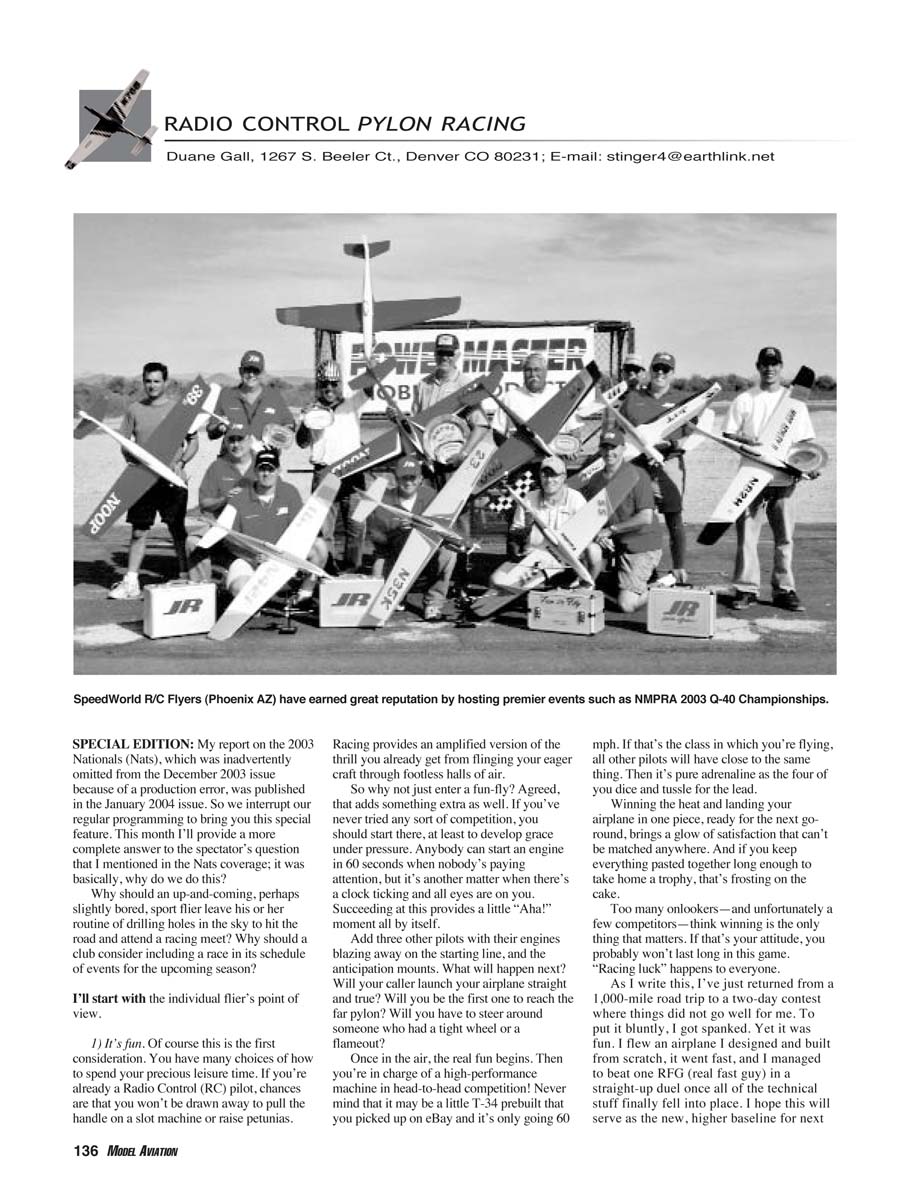 SpeedWorld R/C Flyers (Phoenix AZ) have earned great reputation by hosting premier events such as NMPRA 2003 Q-40 Championships.