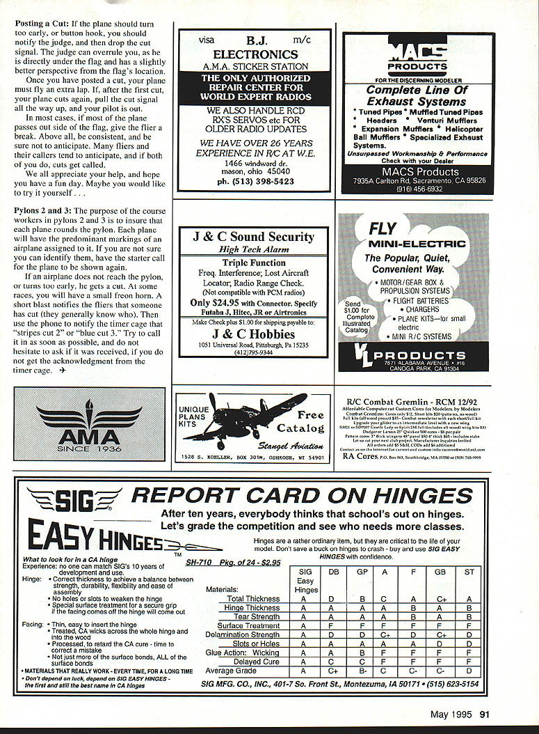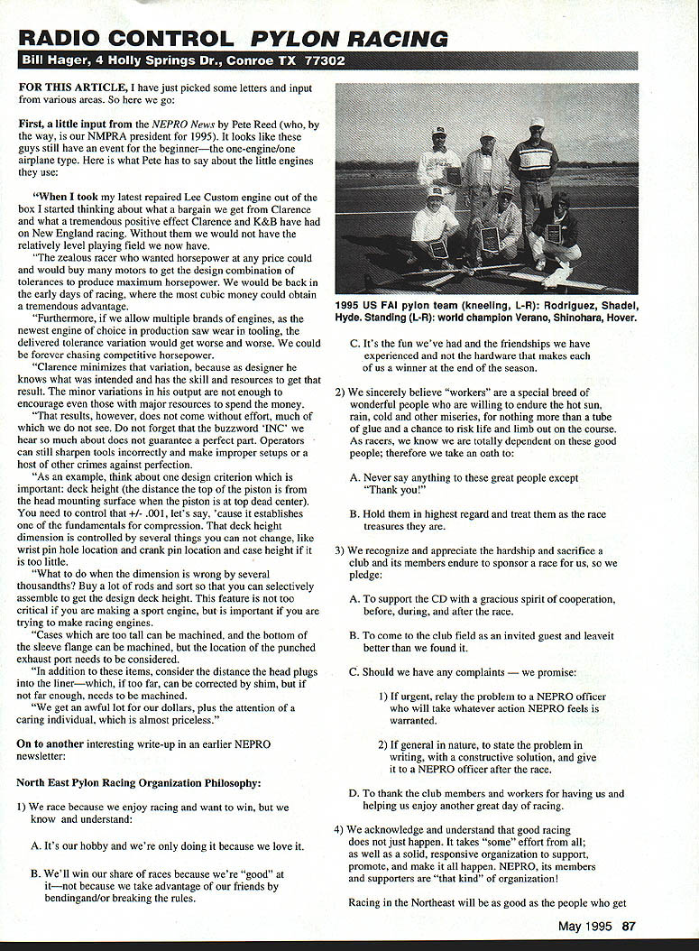 RADIO CONTROL PYLON RACING fl HE FOR THIS ARTICLE have just picked some letters input various areas So go First little input NEPRO News Pete Reed way NMPRA president 1995 looks like guys still have event beginnerthe one-engine/one airplane type what Pete has say about little engines use took latest repaired Lee Custom engine out box started thinking about what bargain get Clarence what tremendous positive effect Clarence K&B have New England racing Without would have relatively level playing field now have zealous racer wanted horsepower price could would buy motors get design combination tolerances produce maximum horsepower would back early days racing cubic money could obtain tremendous advantage Furthermore allow multiple brands engines newest engine choice production saw wear tooling delivered tolerance variation would get worse worse could forever chasing competitive horsepower Clarence minimizes variation because designer knows what intended has skill resources get result minor variations output enough encourage major resources spend money results however does come effort much see forget buzzword INC hear much about does guarantee perfect part Operators can still sharpen tools incorrectly make improper setups host other crimes against perfection As example think about design criterion important deck height distance top piston head mounting surface piston top dead center need control 1- 001 lets say cause establishes fundamentals compression deck height dimension controlled several things can change like wrist pin hole location crank pin location case height too little What dimension wrong several thousandths Buy lot rods sort can selectively assemble get design deck height feature too critical making sport engine important trying make racing engines Cases too tall can machined bottom sleeve flange can machined location punched exhaust port needs considered addition items consider distance head plugs linerwhich too far can corrected shim far enough needs machined get awful lot dollars plus attention caring individual almost priceless another interesting write-up earlier NEPRO newsletter North East Pylon Racing Organization Philosophy 1 race because enjoy racing want win know understand A Its hobby doing because love B Well win share races because good itnot because take advantage friends bendingand/or breaking rules C Its fun weve friendships have experienced hardware makes us winner end season 2 We sincerely believe workers special breed wonderful people willing endure hot sun rain cold other miseries nothing tube glue chance risk life limb out course As racers know totally dependent good people therefore take oath A Never say anything great people except Thank B Hold highest regard treat race treasures 3 We recognize appreciate hardship sacrifice club its members endure sponsor race us pledge A To support CD gracious spirit cooperation before during after race B To come club field invited guest leaveit better found C Should have complaints ise 1 If urgent relay problem NEPRO officer will take whatever action NEPRO feels warranted 2 If general nature state problem writing constructive solution give NEPRO officer after race D To thank club members workers having us helping us enjoy another great day racing 4 We acknowledge understand good racing does just happen takes some effort well solid responsive organization support promote make happen NEPRO its members supporters kind organization Racing Northeast will good people get May 1995 87 1995 US FAI pylon team kneeling L-R Rodriguez Shadel Hyde Standing L-R world champion Verano Shinohara Hover SERVO M*TE Size. 175 x 275 x 130 Drives ANY modem servo 0 0 Use favourite connector Available kit built-up REVERSE M*TE Servo reversing module installed between Rx Servo Adjusts/sets netutral reverses dirction servo Supplied wires add connectors match system Assembled tested $1995 SERVICE SAE catalog Ace Alrtronlcs Aristo-Craft Cirrus Futaba HIoc Hobby Shack J R K-Lkie K 0 Propo Krar Novek Pro-Une RCD Tower Hobbles etc. *FACTORY TRAINED AUTHORIZED WARRANTY Hows 800 am- 500pm EST mwkda% call fin Saturday involved takes insure growing improving racing program accept philosophy NEPRO make part racing activity personally contribute whatever can yourself make NEPRO work better Also same newsletter some helpful hints CDs workers NEPRO worker training etc CDs Planning Contact suppliers two three months advance handouts Approximately month before race CD line up workers plan positions give workers job sheet line up alternates possible week before check workers remind mail job sheet needed Contact local CAP Air Scouts etc spectators future course workers Training Easy understand duties sheet person course Day before set up cages opportunity locals practice opportunity workers get used cages simulate two- three-man races race pilots help workers through simulated race Use time prior race test flights workers cages let workers try real Pilot Assistance Racers offer spell workers especially out competition leave fellow racers stuck cages Answer loudspeaker calls assistance Racers encourage fun excitement Up Close Personal vantage point working Racers encourage reward systems established CD NEPRO Publicly thank workers club meetings contest award meeting Contest Director options offer reduction entry fee racers bringing workers races include extra dollar entry fee worker prizes Suggestions Raffle tickets workers race collect keep tickets until season ends Raffle end year suggestions banquet radio cash prizes etc Include workers NEPRO News mailing Have separate mailing similar old PRO News Short write-up pictures workers NEPRO News No pilots receive worker raffle prizes workers registered CD including name address etc Sample instructions workers Pylon 1 purpose course workers pylon 1 ensure plane rounds pylon worker assigned lane lane will have predominant markings airplane assigned Such lane 1 blue lane 2 stripes etc Once lane has its color assigned notif