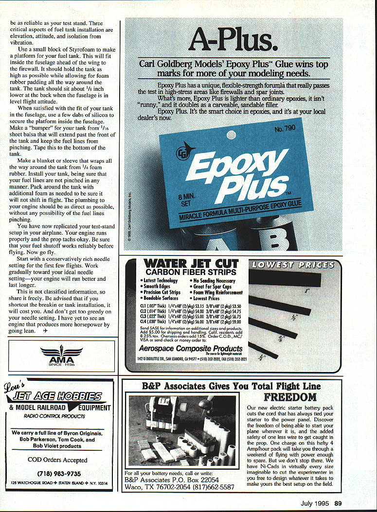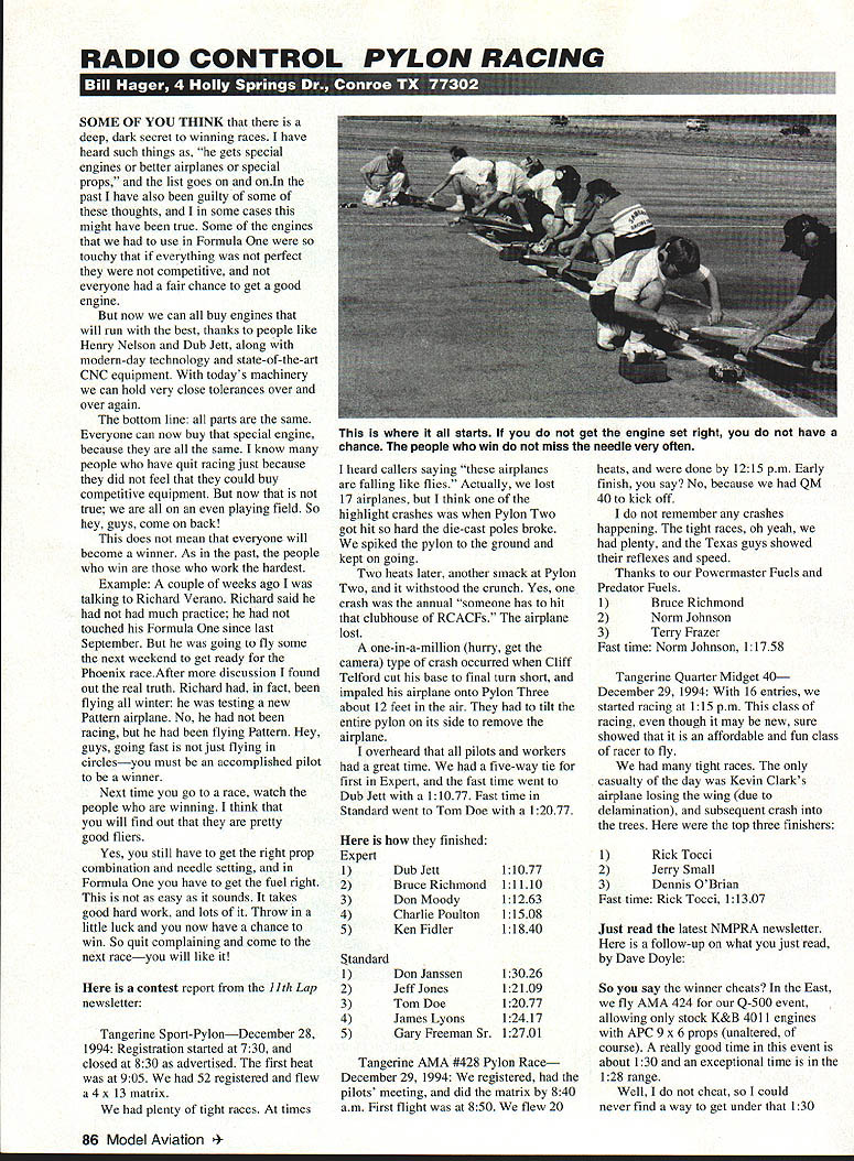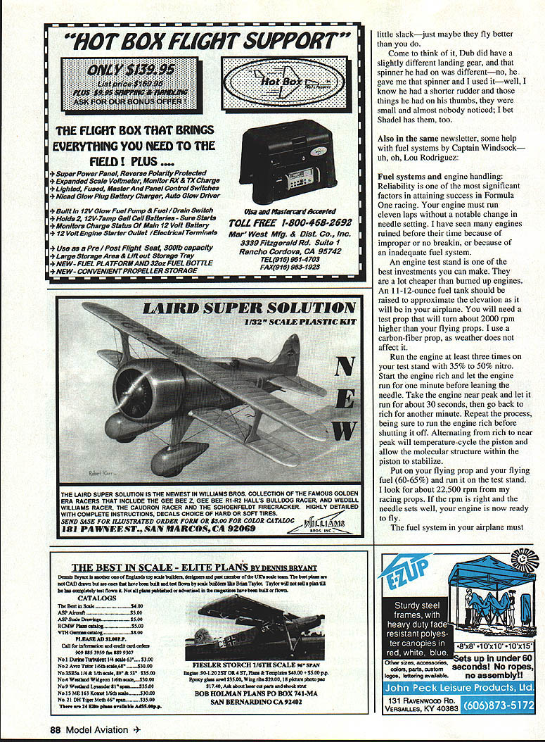 \deflang1033\pard\plain\f0\fs17 RADIO CONTROL PYLON RACING SOME OF YOU THINK deep dark secret winning races have heard such things gets special engines better airplanes special props list goes onIn past have also guilty some thoughts some cases might have true Some engines use Formula touchy everything perfect competitive everyone fair chance get good engine now can buy engines will run best thanks people like Henry Nelson Dub Jett along modern-day technology state-of-the-art CNC equipment todays machinery can hold very close tolerances over over again bottom line parts same Everyone can now buy special engine because same know people have quit racing just because did feel could buy competitive equipment now true playing field So hey guys come back does mean everyone will become winner As past people win work hardest Example couple weeks ago talking Richard Verano Richard said much practice touched Formula since last September going fly some next weekend get ready Phoenix raceAfter discussion found out real truth Richard fact flying winter testing new Pattern airplane No racing flying Pattern Hey guys going fast just flying circlesyou must accomplished pilot winner Next time go race watch people winning think will find out pretty good fliers Yes still have get right prop combination needle setting Formula have get fuel right easy sounds takes good hard work lots Throw little luck now have chance win So quit complaining come next raceyou will like contest report 11th Lap newsletter Tangerine Sport-PylonDecember 28 1994 Registration started 730 closed 830 advertised first heat 905 52 registered flew 4 x 13 matrix plenty tight races times heard callers saying airplanes falling like flies Actually lost 17 airplanes think highlight crashes Pylon Two got hit hard die-cast poles broke spiked pylon ground kept going Two heats later another smack Pylon Two withstood crunch Yes crash annual someone has hit clubhouse RCACFs airplane lost one-in-a-million hurry get camera type crash occurred Cliff Telford cut base final turn short impaled airplane onto Pylon Three about 12 feet air tilt entire pylon its side remove airplane overheard pilots workers great time five-way tie first Expert fast time went Dub Jett 11077 Fast time Standard went Tom Doe 12077 finished Expert 1Dub Jett 2Bruce Richmond 3Don Moody 4Charlie Poulton 5Ken Fidler Standard 1 2 3 4 5 Don Janssen Jeff Jones Tom Doe James Lyons Gary Freeman Sr 11077 11110 11263 1 15 08 1 1840 13026 12109 12077 12417 12701 Tangerine AMA #428 Pylon Race December 29 1994 registered pilots meeting did matrix 840 am First flight 850 flew 20 heats done 1215 pm Early finish say No because QM 40 kick off remember crashes happening tight races oh yeah plenty Texas guys showed reflexes speed Thanks Powermaster Fuels Predator Fuels 1 Bruce Richmond 2\tab Norm Johnson 3\tab Terry Frazer Fast time Norm Johnson 11758 Tangerine Quarter Midget 40 December 29 1994 16 entries started racing 115 pm class racing though may new sure showed affordable fun class racer fly tight races casualty day Kevin Clarks airplane losing wing due delamination subsequent crash trees top three finishers 1\tab Rick Tocci 2\tab Jerry Small 3\tab Dennis OBrian Fast time Rick Tocci 11307 Just read latest NMPRA newsletter follow-up what just read Dave Doyle So say winner cheats East fly AMA 424 Q-500 event allowing stock K&B 4011 engines APC 9 x 6 props unaltered course really good time event about 130 exceptional time 128 range Well cheat could never find way get under 130 86 Model Aviation ts get engine set right have chance people win miss needle very often mark although did manage hit few times know engine prop August have grand two-day race Ellington just about everybody comes out race Dub Jett going town convinced him should try form Q-500 ran separate 428 version convinced Dub needed bring old AMA-legal Q-500 airframe would supply him engine propa good naturally Dub naturally trouble adjusting blazing speed event cut out times just could seem get things togetherthe first day heard him remark Boy just have got fly right poles get good time event seems got together second day because nothing good timesone set new course record Before Dub headed back Texas gave engine prop back said very quietly powerhouse back Davenow have no excuses know used engine prop rest season still did break 130 mark used same brand airplane ReVlution So next time think fast guys cheating give July1995 87 little slackjust maybe fly better Come think Dub did have slightly different landing gear spinner differentno gave spinner used itwell know shorter rudder things thumbs small almost nobody noticed bet Shadel has too Also same newsletter some help fuel systems Captain Windsock uh oh Lou Rodriguez Fuel systems engine handling Reliability significant factors attaining success Formula racing engine must run eleven laps notable change needle setting have seen engines mined before time because improper no breakin because inadequate fuel system An engine test stand best investments can make lot cheaper burned up engines An 11-12-ounce fuel tank should raised approximate elevation will airplane will need test prop will turn about 2000 rpm higher flying props use carbon-fiber prop weather does affect Run engine least three times test stand 35% 50% nitro Start engine rich let engine run minute before leaning needle Take engine near peak let run about 30 seconds go back rich another minute Repeat process being sure run engine rich before shutting off Alternating rich near peak will temperature-cycle piston allow molecular structure within piston stabilize Put flying prop flying fuel 60-65% run test stand look about 22500 rpm racing props rpm right needle sets well engine now ready fly fuel system airplane must 88 Model Aviation BOX FLIGHT SUPPORT THE FLIGHT BOX THAT BRINGS EVERYTHING YOU NEED TO THE FIELD PLUS * Super Po war Panel Reverse Polarity Protected * Expanded Scale Voltmeter Monitor IIX& TX Charge * Lighted Fused M