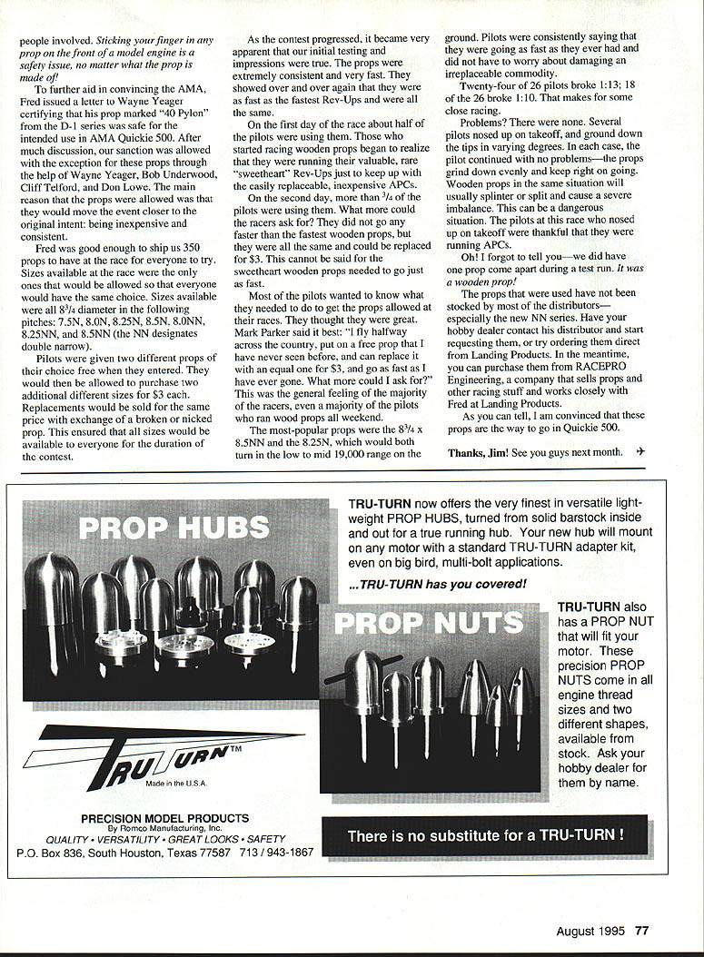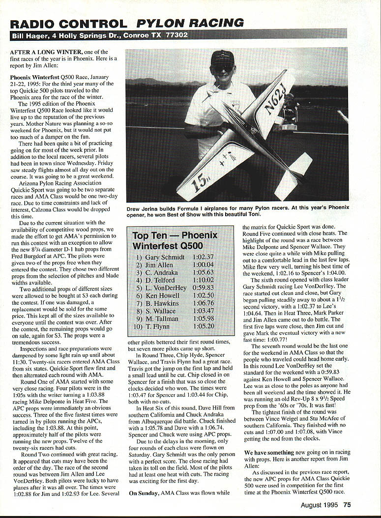 RADIO CONTROL PYLON RACING 111E AFTER LONG WINTER first races year Phoenix report Jim Allen Phoenix Winterfest Q500 Race January 21-22 1995 third year top Quickie 500 pilots traveled Phoenix area race winter 1995 edition Phoenix Winterfest Q500 Race looked like would live up reputation previous years Mother Nature planning so-so weekend Phoenix would pot too much damper fun quite bit practicing going week prior addition local racers several pilots town since Wednesday Friday saw steady flights almost day out course going great weekend Arizona Pylon Racing Association Quickie Sport going two separate races AMA Class would two-day race Due time constraints lack interest Calzona Class would dropped time Due current situation availability competitive wood props made effort get AMA s permission run contest exception allow new 8I4 diameter D- 1 hub props Fred Burgdorf APC pilots given two props free entered contest chose two different props selection pitches blade widths available Two additional props different sizes allowed bought $3 during contest damaged replacement would sold same price kept sizes available everyone until contest over After contest remaining props would go sale again $3 props tremendous success Inspections race preparations dampened some light rain up until about 1130 Twenty-six racers entered AMA Class six states Quickie Sport flew first alternated round AMA Round AMA started some very close racing Four pilots 1 05s writer turning 10388 racing Mike Delponte Heat Five APC props immediately obvious success Three five fastest times turned pilots running APCs including 10388 point approximately half pilots running new props Twelve twenty-six racers cuts Round Two continued great racing appeared cuts may have order day race second round between Jim Allen Lee VonDerHey Both pilots lucky have planes after over times 10288 Jim 10293 Lee Several 1 1 1 1 other pilots bettered first round times seven pilots came up short Round Three Chip Hyde Spencer Wallace Travis Flynn great race Travis got jump first lap held small lead until cut Chip closed Spencer finish close clocks decided won times 10347 Spencer 10344 Chip both no cuts Heat Six round Dave Hill southern California Chuck Andraka Albuquerque did battle Chuck finished 10578 Dave 10674 Spencer Chuck using APC props Due delays morning four rounds class flown Saturday Gary Schmidt person perfect score close racing taken its toll field Most pilots least heat cuts racing exciting first day Sunday AMA Class flown matrix Quickie Sport done Round Five continued close heats highlight round race between Mike Delponte Spencer Wallace close quite Mike pulling out comfortable lead last few laps Mike flew very well turning best time weekend 10216 Spencers 10400 sixth round opened class leader Gary Schmidt racing Lee VonDerHey race started out clean close Gary began pulling steadily away about 11/2 second victory 10237 Lees 10464 Heat Three Mark Parker Jim Allen came out battle first five laps close Jim cut gave Mark eventual victory new fast time 10077 seventh round would last weekend AMA Class people traveled could head home early round Lee VonDerHey set standard weekend 05983 against Ken Howell Spencer Wallace Lee close poles anyone weekend time showed running old Rev-Up 8 x 91/2 Speed prop 60s 70s fast tightest finish round between Vince Weigel Stu McAfee southern California finished no cuts 10700 10708 Vince getting nod clocks have something new going racing props another report Jim Allen As discussed previous race report new APC props AMA Class Quickie 500 used competition first time Phoenix Winterfest Q500 race August1995 75 Drew Jerina builds Formula airplanes Pylon racers years Phoenix opener won Best Show beautiful Toni Fred Burgdorf father APC props has worked very hard develop test props ensure will withstand rigors level racing safe efficient way article written explain history props use situation allowed used January 21-22 race Phoenix blessing AMA Everyone flies involved Quickie racing aware lack availability competitive props Rev-Ups far best wooden prop have available least 1112 years couple other brands props have tried have proven substantially slower Rev-Ups especially rare sweethearts massaged props some pilots seem getting away flying first introduced new APC props late September 94 Mike Delponte showed race held Pro-Flyers immediately impressed stiffness prop substantially thicker blade toward hub sport APC props used seeing Mike stated flown prop very impressed its smoothness peiformance success APC props almost other model airplane events props need investigation Shortly thereafter made phone call Landing Products produces APC props under leadership Fred Burgdorf Fred very willing explain props designed made tests ensure safety Fred explained props designed computer first software developed brother Otto analytically calculates stresses blades design can adjusted distribute loads evenly Once design finalized sent CNC mill cuts molds props amazing accuracy result perfect mold amazingly short time Fred stated starts design relatively small existing prop line does minor adjustments such pitch change can molding props new design new molds same day result consistency accuracy can achieved anyone else market especially true wood props test new props Quickie Fred bolted OS 90 ducted fan engine pipe setup allowed 24000 static rpm depending diameter pitch No failures intact props occurred Fred bent props until made severe stress mark would cause failure 91 test engine prop stressed same amount run Nelson-powered Quickie No problems experienced shows amount safety margin props just have some props test ordered three appropriate sizes available time 8I4 diameter 8ON 825N 85N pitch N designates narrow blade After receiving props couple days later anxious fly headed local club flying field somewhat tired Nelson 8I4 x 825N turned about 19200 Gary Schmidt help after launching made comment plane felt smooth Nelson-powered Quickie ever 