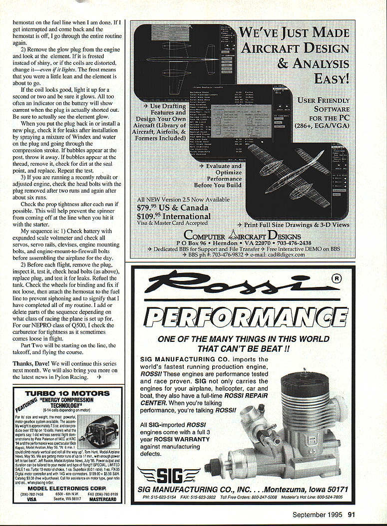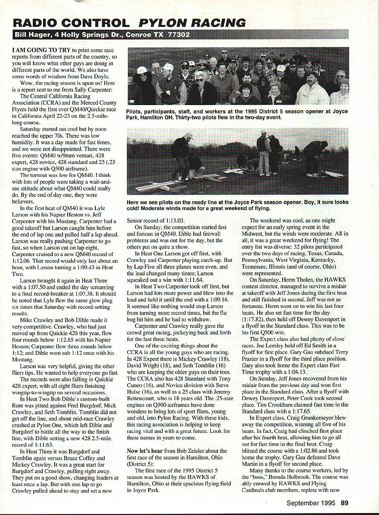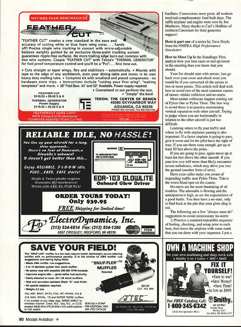 RADIO CONTROL PYLON RACING fl L [ IL]] dlii I-U 1 AM GOING TO TRY print some race reports different parts country will know what other guys doing different parts world also have some words wisdom Dave Doyle Wow racing season upon us report sent Sally Carpenter Central California Racing Association CCRA Merced County Flyers held first ever QM40/Quickie race California April 22-23 25-milelong course Saturday started out cool noon reached upper 70s low humidity day made fast times disappointed five events QM40 wl9mm venturi 428 expert 428 novice 428 standard 25 25 size engine Q500 airframe turnout low QM4O think lots people taking walt-andsee attitude about what QM4O could really end day believers first heat QM4O Lyle Larson Napier Heston vs Jeff Carpenter Mustang Carpenter good takeoff Larson caught him before end lap pulled half lap ahead Larson really pushing Carpenter go fast Larson cut lap eight Carpenter cruised new QM40 record 11206 record would last about hour Larson turning 10943 Heat Two Larson brought again Heat Three 10750 ended day screaming final record-breaker 10738 should noted Lyle flew same glow plug six times Saturday record-setting results Mike Crawley Bob Dible made very competitive Crawley just moved up Quickie 428 year flew four rounds below 11265 Napier Heston Carpenter flew three rounds below 112 Dible went sub 112 once Mustang Larson very helpful giving other fliers tips wanted help everyone go fast records also falling Quickie 428 expert eight fliers finishing wingtip-to-wingtip several occasions Heat Two Bob Dibles custom-built Runt pitted against Fred Burgdorf Mick Crawley Seth Tomblin Tomblin did get off line about mid-race Crawley crashed Pylon left Dible Burgdorf battle way finish line Dible setting new 428 25-mile record 11163 Heat Three Burgdorf Tomblin again versus Bruce Coffey Mickey Crawley great start Burgdorf Crawley pulling right away put good show changing leaders least once lap lap go Crawley pulled ahead stay set new Senior record 11303 Sunday competition started fast furious QM4O Dible firewall problems out day others put quite show Heat Larson got off first Crawley Carpenter playing catch-up Lap Five three planes lead changed times Larson squeaked out win 11164 Heat Two Carpenter took off first Larson lots power blew lead held until end 10916 seemed like nothing would stop Larson turning record times flu bug hit him withdraw Carpenter Crawley really gave crowd great racing jockeying back forth last three heats exciting things about CCRA young guys racing 428 Expert Mickey Crawley 18 David Wright 18 Seth Tomblin 16 keeping older guys toes CCRA also has 428 Standard Tony Cuneo 16 Novice division Steve Hulse 16 well 25 class Jeremy Bettencourt 18 years old 25-size engines Q500 airframes have done wonders bring lots sport fliers young old Pylon Racing kids racing association helping keep racing vital great future Look names years come Now lets hear Bob Zeisler about first race season Hamilton Ohio District 5 first race 1995 District 5 season hosted HAWKS Hamilton Ohio spacious flying field Joyce Park weekend cool might expect early spring event Midwest winds moderate great weekend flying entry list diverse 32 pilots participated over two days racing Texas Canada Pennsylvania West Virgmia Kentucky Tennessee Illinois course Ohio represented Saturday Herm Tholen HAWKS contest director managed survive midair takeoff Jeff Jones during first heat still finished second Jeff fortunate Herm went win last four heats also set fast time day 11782 held off Dewey Davenport flyoff Standard class first Q500 win Expert class also plenty close races Joe Lemiey held off Ed Smith flyoff first place Gary Gau subdued Terry Frazier flyoff third place position Gary also took home Expert class Fast Time trophy 10413 Sunday Jeff Jones recovered midair previous day won first place Standard class After flyoff Dewey Davenport Peter Cook took second place Tim Crookham claimed fast time Standard class 11765 Expert class Craig Grnnkemeyer blew away competition winning five heats fact Craig clinched first place after fourth heat allowing him go out fast time final heat Craig blitzed course 10286 took home trophy Gary Gau defeated Dave Martin flyoff second place thanks course workers led boss Brenda Holbrook course ably crewed HAWKS Flying Cardinals club members replete new September 1995 89 Pilots participants staff workers 1995 District 5 season opener Joyce Park Hamilton OH Thirty-two pilots flew two-day event see pilots ready line Joyce Park season opener Boy sure looks cold Moderate winds made great weekend flying FEATHER CUT creates new standard ease accuracy cutting white blue foam wing cores ds off Precise single wire tracking concert micro-adjustable balance weights guided exclusive three-point tracking system guarantees ripple-free surfaces No trailing edge burn-out common two wire systems Couple FEATHER CUT Tekoas THERMAL GENERATOR fool proof temperature control youll Pro. first time out Cuts straight taper wings fins stabilizers matically ts tape edge workbench dining table stores its own heavy duty mailing tube lete kit anodized plated components no hardware store trips ructions include cutting first wing making templates old Bow 40 52 Available Power supply required Guaranteed out perform rest Simply best TEKOA THE CENTER OF DESIGN 49380 SKYHARBOR WAY EmAGUANGA CA 92536 FEATHER CUT $14950 S & H THERMAL GENERATOR Power Supply $11950 S & H r SAVE YOUR FIELD SNUF-LER muffler low cost easy install lightweight sound reducing muffler no performance penalty answer AMA muffler rule suggestions saving flying fielda Meets AMA muffler rule suggestions 3 10 decibels quieter stock muffler No power loss possible 300-500 RPM increase Improves engine idle s better fuel economy -Easily attached 25-108 stock mufflers Heat corrosion resistant Black E cost finish No special adapters required Weighs 35 oza Fits ASP BRAT ENYA FOX HP IRVINE K & B OS MAX ROYAL YS SUPER TIGRE mufflers fbi avail