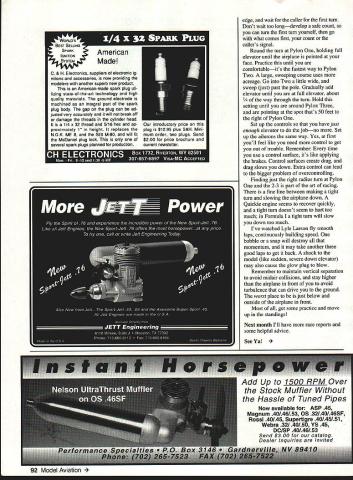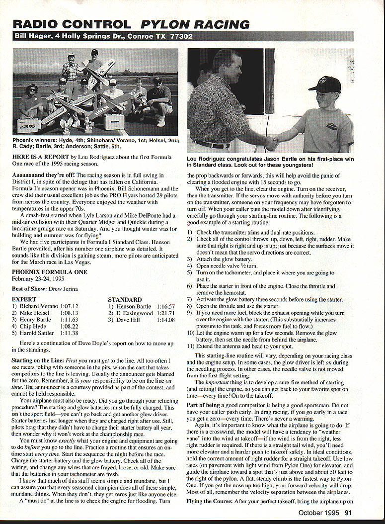 RADIO CONTROL PYLON RACING fl J LII laT LU] MI 1 HERE IS REPORT Lou Rodriguez about first Formula race 1995 racing season Aaaaaaaand theyre offi racing season full swing District spite deluge has fallen California Formula s season opener Phoenix Bill Schonemann crew did usual excellent job PRO flyers hosted 29 pilots across country Everyone enjoyed weather temperatures upper 70s crash-fest started Lyle Larson Mike DelPonte mid-air collision Quarter Midget Quickie during lunchtime grudge race Saturday thought winter building summer flying five participants Formula Standard Class Henson Bartle prevailed after number airplane detailed sounds like division gaining steam pilots anticipated March race Las Vegas PHOENIX FORMULA ONE February 23-24 1995 Best Show Drew Jerina EXPERT 1 Richard Verano 10712 2Mike Helsel10813 3Henry Bartle11163 4Chip Hyde10822 5Harold Sattler11138 STANDARD 1HensonBartle11657 2B Easingwood12171 3Dave Hill11408 Heres continuation Dave Doyles report move up standings Starting Line First must get line too often see racers joking someone pits cart takes competitors line leaving Usually announcer gets blamed zero Remember responsibility line time announcer courtesy provided part contest cannot held responsible airplane must also ready Did go through refueling procedure starting glow batteries must fully charged isnt sport fieldyou cant go back get another glow driver Starter batteries last longer charged right after use Still pilots brag didnt have charge starter battery year wonder wont work championship race must know exactly what engine equipment going before go line Practice routine ensures ontime start time Start sequence night before race Charge starter battery glow battery Check wiring change wires frayed loose old Make sure batteries tachometer fresh know much stuff seems simple mundane can assure seasoned champion does simple mundane things dont get zeros just like anyone else must line check engine flooding Turn prop backwards forwards will help avoid panic clearing flooded engine 15 seconds go get line clear engine Turn receiver transmitter servos move authority before turn transmitter someone frequency may have forgotten turn off caller puts model down after identifying carefully go through starting-line routine following good example starting routine 1 Check transmitter trims dual-rate positions 2 Check control throws up down left right rudder Make sure right right up up just because surfaces move doesnt mean servo directions correct 3 Attach glow battery 4 Open needle valve /2 turn 5 Turn tachometer place going use 6 Place starter front engine Close throttle remove hemostat 7 Activate glow battery three seconds before using starter 8 Open throttle use starter 9 If need fuel block exhaust opening turn over engine starter substantially increases pressure tank forces fuel flow 10 Let engine warm up few seconds Remove glow battery set needle behind airplane 11 Extend antenna head spot starting-line routine will vary depending racing class engine setup some cases glow driver left during needling process other cases needle valve moved first flight setting important thing develop sure-fire method starting setting engine can get back favorite spot timeevery time takeoff Part being good competitor being good sportsman have caller push early drag racing go early race get zeroevery time Theres never warning Again its important know what airplane going crosswind model will have tendency weather vane wind takeoffif wind right less right rudder required straight tail wind youll need elevator harder push takeoff safely ideal conditions hold correct amount right rudder straight takeoff Use low rates pavement light wind Pylon elevator guide airplane toward spot thats just above about 50 feet right pylon flat steady climb fastest way Pylon get nose up too high forward velocity will drop Most remember velocity separation between airplanes Flying Course After perfect takeoff bring airplane up October 1995 91 Phoenix winners Hyde 4th Shinonarai verano isv nelsel dna R Cady Bartle 3rd Anderson Sattle 5th Lou Rodriguez congratulates Jason Bartle first-place win Standard class Look Qut youngsters 92 Model Aviation edge wait caller first turn Dont wait too longdevelop safe count can turn first turn yourself go what comes first count callers signal Round turn Pylon holding full elevator until airplane pointed face Practice until comfortableits fastest way Pylon Two large sweeping course uses acreage Go Two little wide sweep just past pole Gradually add elevator until full elevator about way through turn Hold setting until around Pylon Three pointing spot thats 50 feet right Pylon Set up controls have just enough elevator jobno Set up ailerons same way Yes first youll feel like need control get out trouble Remember time use control surface its like applying brakes Control surfaces create drag drag slows down Extra control can lead bigger problem overcontrolling Finding just right radius turn Pylon 2-3 part art racing fine line between making tight turn slowing airplane down Quickie engine seems recover quickly tight turn doesnt seem hurt too much Formula tight turn will slow down too much Ive watched Lyle Larson fly smooth laps continuously building speed bobble snap will destroy momentum may take another three good laps get back shock model like sudden severe down elevator may also cause glow plug blow Remember maintain vertical separation avoid midair collisions stay higher airplane front avoid turbulence can drive ground worst place just below outside airplane front Most get some practice move up standings Next month Ill have race reports some helpful advice See Va Up 1500 RPM Over Stock Muffler Without Hassle Tuned Pipes Now available ASP 45 Magnum 40/46/53 OS 3 21 40146SF Rossi 40145 Supertigre 40/45/51 Webra 32/ 40150 YS 45 DCISP 40/46/53 Send $300 catalog Dealer Inquiries Invited C & H Electronics suppliers electronic ig nions accessones now providing modelers another superb new