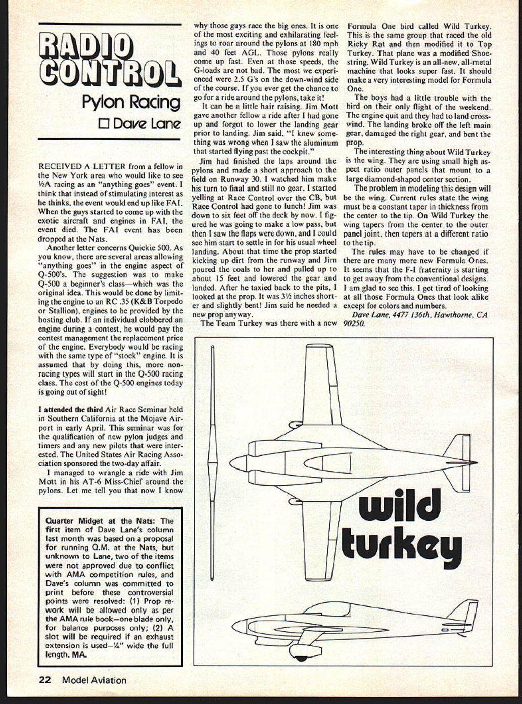 I Pylon Racing 0 Dave Lane RECEIVED LETTER fellow New York area would like see racing anything goes event think instead stimulating interest thinks event would end up like FAI guys started come up exotic aircraft engines FAI event died FAI event has dropped Nats Another letter concerns Quickie 500 As know several areas allowing anything goes engine aspect Q-500s suggestion make Q-500 beginners classwhich original idea would done limit ing engine RC 35 K&B Torpedo Stallion engines provided hosting club individual clobbered engine during contest would pay contest management replacement price engine Everybody would racing same type stock engine assumed doing nonracing types will start Q-500 racing class cost Q-500 engines today going out sight attended third Air Race Seminar held Southern California Mojave Air port early April seminar qualification new pylon judges timers new pilots inter ested United States Air Racing Asso ciation sponsored two-day affair managed wrangle ride Jim Mott AT-6 Miss-Chief around pylons Let tell now know guys race big ones exciting exhilarating feel ings roar around pylons 180 mph 40 feet AGL pylons really come up fast speeds G-loads bad experi enced 25 Gs down-wind side course ever get chance go ride around pylons take can little hair raising Jim Mott gave another fellow ride after gone up forgot lower landing gear prior landing Jim said knew some thing wrong saw aluminum started flying past cockpit Jim finished laps around pylons made short approach field Runway 30 watched him make turn final still no gear started yelling Race Control over CR Race Control gone lunch Jim down six feet off deck now fig ured going make low pass saw flaps down could see him start settle usual wheel landing About time prop started kicking up dirt runway Jim poured coals pulled up about 15 feet lowered gear landed After taxied back pits looked prop 3 inches short er slightly bent Jim said needed new prop anyway Team Turkey new Formula bird called Wild Turkey same group raced old Ricky Rat modified Top Turkey plane modified Shoe string Wild Turkey all-new all-metal machine looks super fast should make very interesting model Formula boys little trouble bird flight weekend engine quit land cross wind landing broke off left main gear damaged right gear bent prop interesting thing about Wild Turkey wing using small high pect ratio outer panels mount large diamond-shaped center section problem modeling design will wing Current rules state wing must constant taper thickness center tip Wild Turkey wing tapers center outer panel joint tapers different ratio tip rules may have changed new Formula Ones seems F-I fraternity starting get away conventional designs am glad see get tired looking Formula Ones look alike except colors numbers Dave Lane 4477 136th Hawthorne CA 90250 22 Model Aviation Quarter Midget Nats first item Dave Lanes column last month based proposal running QM Nats unknown Lane two items approved due conflict AMA competition rules Daves column committed print before controversial points resolved 1 Prop re work will allowed per AMA rule bcokone blade balance purposes 2 slot will required exhaust extension used1h wide full length MA