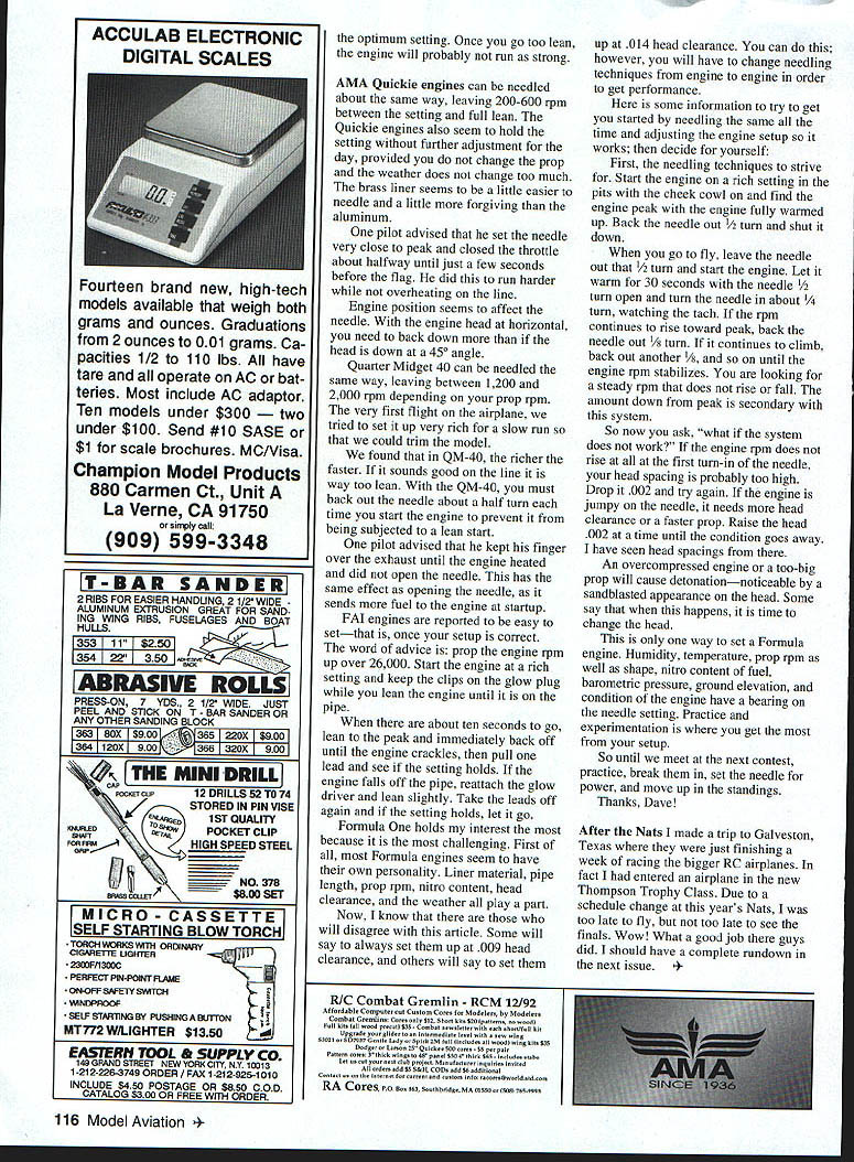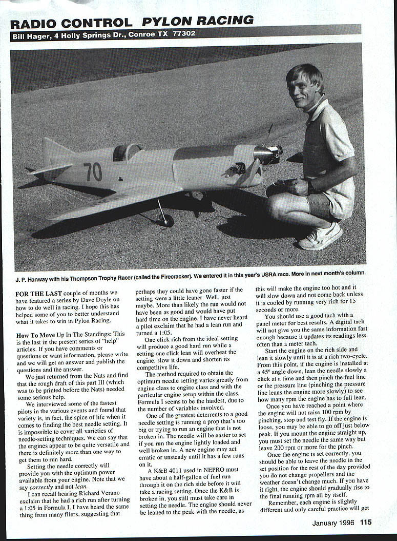 RADIO CONTROL PYLON RACING J P Hanway Thompson Trophy Racer called Firecracker entered years USRA race next months column FOR THE LAST couple months have featured series Dave Doyle well racing hope has helped some better understand what takes win Pylon Racing Move Up Standings last present series help articles have comments questions want information please write will get answer publish questions answer just returned Nats find rough draft part III printed before Nats needed some serious help interviewed some fastest pilots various events found variety fact spice life comes finding best needle setting impossible cover varieties needle-setting techniques can say engines appear quite versatile definitely way get run hard Setting needle correctly will provide optimum power available engine Note say correctly lean can recall hearing Richard Verano exclaim rich run after turning 105 Formula I have heard same thing fliers suggesting perhaps could have gone faster setting little leaner Well just maybe likely run would have good would have put hard time engine have never heard pilot exclaim lean run turned 105 click rich ideal setting will produce good hard run setting click lean will overheat engine slow down shorten its competitive life method required obtain optimum needle setting varies greatly engine class engine class particular engine setup within class Formula seems hardest due number variables involved greatest deterrents good needle setting running prop thats too big trying run engine broken needle will easier set run engine lightly loaded well broken new engine may act erratic unsteady until has few runs K&B 4011 used NEPRO must have about half-gallon fuel run through rich side before will take racing setting Once K&B broken still must take care setting needle engine should never leaned peak needle will make engine too hot will slow down come back unless cooled running very rich 15 seconds should use good tach panel meter best results digital tach will give same information fast enough because updates its readings less often meter tach Start engine rich side lean slowly until rich two-cycle point engine installed 450 angle down lean needle slowly click time pinch fuel line pressure line pinching pressure line leans engine slowly see rpm engine has full lean Once have reached point engine will raise 100 rpm pinching stop test fly engine loose may able go off just below peak mount engine straight up must set needle same way leave 200 rpm pinch Once engine set correctly should able leave needle set position rest day provided change propellers weather doesnt change much have right engine should gradually rise final running rpm itself Remember engine slightly different careful practice will get January1996 115 ACCULAB ELECTRONIC DIGITAL SCALES Fourteen brand new high-tech models available weigh both grams ounces Graduations 2 ounces 001 grams Ca pacities 1/2 110 lbs have tare operate AC bat teries Most include AC adaptor Ten models under $300 under $100 Send #10 SASE $1 scale brochures MC/Visa Champion Model Products 880 Carmen Ct Unit La Verne CA 91750 simply call 909 599-3348 optimum setting Once go too lean engine will probably run strong AMA Quickie engines can needled about same way leaving 200-600 rpm between setting full lean Quickie engines also seem bold setting further adjustment day provided change prop weather does change too much brass liner seems little easier needle little forgiving aluminum pilot advised set needle very close peak closed throttle about halfway until just few seconds before flag did run harder overheating line Engine position seems affect needle engine head horizontal need back down head down 450 angle Quarter Midget 40 can needled same way leaving between 1200 2000 rpm depending prop rpm very first flight airplane tried set up very rich slow run could trim model found QM-40 richer faster sounds good line way too lean QM-40 must back out needle about half turn time start engine prevent being subjected lean start pilot advised kept finger over exhaust until engine heated did open needle has same effect opening needle sends fuel engine startup FAI engines reported easy setthat once setup correct word advice prop engine rpm up over 26000 Start engine rich setting keep clips glow plug lean engine until pipe about ten seconds go lean peak immediately back off until engine crackles pull lead see setting holds engine falls off pipe reattach glow driver lean slightly Take leads off again setting holds let go Formula holds interest because challenging First Formula engines seem have own personality Liner material pipe length prop rpm nitro content head clearance weather play part Now know will disagree article Some will say always set up 009 head clearance others will say set R/C Combat Gremlin RCM 12/92 Affordable Corn poter rot Custom Corer foe Modelorn Modelers Combat Crrutlion Cores $12 Short hits $20 paorros ro wood Foil hits sIt wood prerot $35 Cowbat ortoslebre esoS ohootfoll hit Upgrade yoot fliden totroordiote tend new trio6 5302t SLt7S37 Geotis Lady Spirit 2M fstt linrirdes wood wiog hits $35 Dodgeto laeson 25 Qoickse $00 rorss$S pee poir Potteroros 3 thick wings 48 porn $50 4 thick $65 lortodes stabs Let Os yoor nest nob pwject Msnofotttnren inqninieslovited ondees add $5 S&H COOn odd $6 odditireol Contattos osthsinteeeetfotnotteotosdrontowmotororotesgworldstdcotr RA Cores yO Ron 563 Snrthhidge MA 0t550 1506 765-9998 up 014 head clearance can however will have change needling techniques engine engine order get performance some information try get started needling same time adjusting engine setup works decide yourself First needling techniques strive Start engine rich setting pits cheek cowl find engine peak engine fully warmed up Back needle out /2 turn shut down go fly leave needle out 1/2 turn start engine Let warm 30 seconds needle /2 turn open turn needle about turn watching tach rpm continues rise toward peak back needle out /s turn continues climb bac