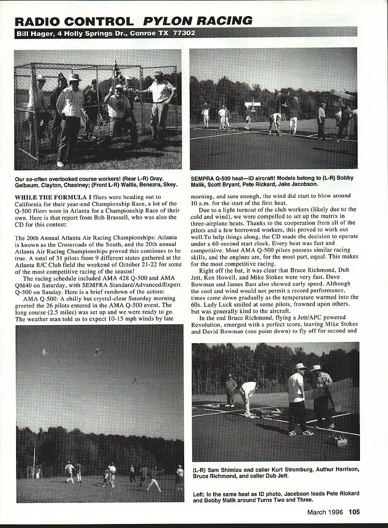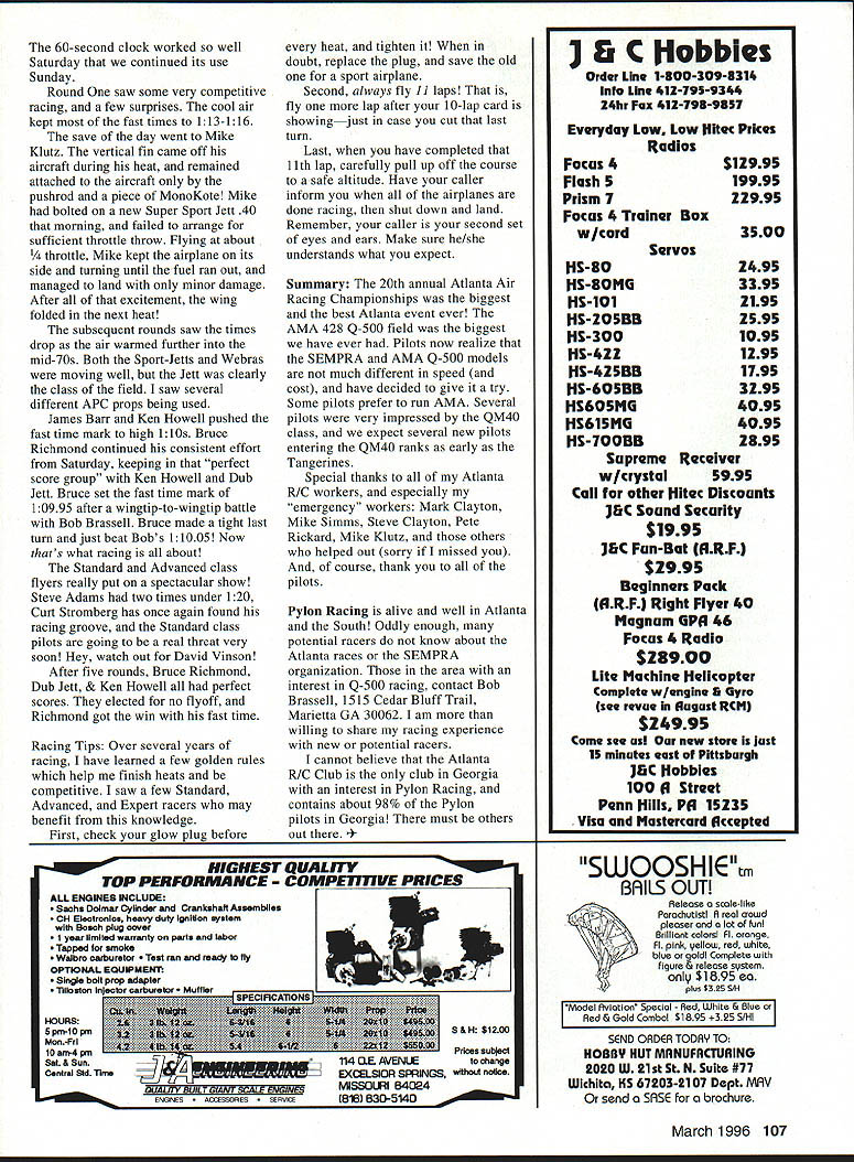 RADIO CONTROL PYLON RACING 111 WHILE THE FORMULA fliers heading out California year-end Championship Race lot Q-500 fliers Atlanta Championship Race own report Bob Brassell also CD contest 20th Annual Atlanta Air Racing Championships Atlanta known Crossroads South 20th annual Atlanta Air Racing Championships proved continues true total 31 pilots 9 different states gathered Atlanta R/C Club field weekend October 2 1-22 some competitive racing season racing schedule included AMA 428 Q-500 AMA QM40 Saturday SEMPRA Standard/Advanced/Expert Q-500 Sunday brief rundown action AMA Q-500 chilly crystal-clear Saturday morning greeted 26 pilots entered AMA Q-500 event long course 25 miles set up ready go weather man told us expect 10-15 mph winds late morning sure enough wind did start blow around 10 am start first heat Due light turnout club workers likely due cold wind compelled set up matrix three-airplane heats Thanks cooperation pilots few borrowed workers proved work out wellTo help things along CD made decision operate under 60-second start clock heat fast competitive Most AMA Q-500 pilots possess similar racing skills engines part equal makes competitive racing Right off bat clear Bruce Richmond Dub Jett Ken Howell Mike Stokes very fast Dave Bowman James Barr also showed early speed Although cool wind would permit record performance times came down gradually temperature warmed 60s Lady Luck smiled some pilots frowned upon others generally kind aircraft end Bruce Richmond flying Jett/APC powered Revolution emerged perfect score leaving Mike Stokes David Bowman point down fly off second Left In same heat ID photo Jacobson leads Pete Rickard Bobby Malik around Turns Two Three March 1996 105 so-often overlooked course workers Rear L-R Gray Gelbaum Clayton Chastney Front L-R Wallis Benezra Skey SEMPRA 0-500 heatID aircraft Models belong L-R Bobby Malik Scott Bryant Pete Rickard Jake Jacobson L-R Sam Shimizu caller Kurt Stromburg Authur Harrison Bruce Richmond caller Dub Jett THE INTIMIDATOR PRE BUILT FULL KITS $9999$3999 Wings 10 wid sheetedbalsa wing epoxyskins /ss plyFull lite ply installed insides wing/stabbetter power ruddertransfer Jigged/is ply built fuseedge carbonwing/stahl fiberrudder installed ity wingaluminum landing gear V-TAINATIONAL BALSA THIRD PLACE 97 Cherokee Dr Springfield MA 01109 94 & 95 NATS accept personal check money order COD $475 COD $700 S&H per kit 48 states CONGRATULATIONS H RINALDI AUTO-VAC SYSTEM Introducing new fully automatic vacuum bagging system cornpletely selfmonitoring has fully adjustable vacuum switch large capacity reservoir prevents frequent cycling vacuum pump Auto-Yac kit comes completely assembled mounted wood base ready use Included kit EZ Voc II electric pump rated 24 Hg vacuum switch adjustable 5 22 Hg vacuum gauge large capacity reservoir check valve neoprene tubing EZ Vac connector Iwo Ouick-Lock seals 9 18 wide bagging tube 9 15 wide breather cloth set vacuum230 V System available bagging instructionsAdd 579 tar S&H lied, M0/t0D MtdI5A excepted CA realdeets add 825% Tax 4210 DoolillIe Dr San Leandro CA94577 510352-2022 FAX 510 3522021 413-796-1925 thirdThe flyoff began well brought close Stokes airplanes hit coming around Turn Three Mikes airplane hit weeds David continued complete 10 laps somewhat customized prop Mike Stokes finished third Fast-Time day 11406 Quarter Midget 40 Following brief pilots meeting awards ceremony Q-500 Quarter Midget 40 racing got underway about 330 wind let up little almost 70 degrees ten QM4O pilots made way line small field set up four heats three airplanes Again racing very fast competitive variety airframe engine combinations took air first heat showed Dub Jett Sweet Pea V-tail very fast Sam Shimizu Tsunami moving right along Bruce Richmonds Miss RJ right hunt Attrition greatest event Carl Simms losing Pole Kitty cause unknown Steve Kovach losing Larson Mustang flew through sun Jerry Salisbury losing Mustang between Two Three CFIT Bruce Richmond withdrawing after minor damage landing wind Through allRacer Rick Landers smooth fast flying Napier Heston fast time 11104 perfect score win Racing concluded end four rounds consensus remaining pilots SEMPRA Q-500 Sunday morning brought absolutely clear skies absolutely no wind first frost season Atlanta area day full complement workers set up matrix seven four-airplane heats per round pylons relocated two-mile short course pilots meeting held 26 pilots registered event 920 off flying 945 Temperature just before Heat already warmed nearly 50 degrees 106 Model Aviation forget units remember! NOT JUST CHARGERS. COMPLETE AUTOMATIC BATTER V MAINTENANCE SYSTEMS Ca Ra Products 21 Urban Dr P0 Box 436 Paineaville OH 44077 216-639-8274 Hra 912 2 7 central Time SASE information ers inquiries invited 60-second clock worked well Saturday continued its use Sunday Round saw some very competitive racing few surprises cool air kept fast times 113-116 save day went Mike Klutz vertical fin came off aircraft during heat remained attached aircraft pushrod piece MonoKote Mike bolted new Super Sport Jett 40 morning failed arrange sufficient throttle throw Flying about throttle Mike kept airplane its side turning until fuel ran out managed land minor damage After excitement wing folded next heat subsequent rounds saw times drop air warmed further mid-70s Both Sport-Jetts Webras moving well Jett clearly class field saw several different APC props being used James Barr Ken Howell pushed fast time mark high 1 lOs Bruce Richmond continued consistent effort Saturday keeping perfect score group Ken Howell Dub Jett Bruce set fast time mark 10995 after wingtip-to-wingtip battle Bob Brassell Bruce made tight last turn just beat Bobs 11005 Now thats what racing about Standard Advanced class flyers really put spectacular show Steve Adams two times under 120 Curt Stromberg has once again found racing groove Standard class pilots going real threat very soon Hey watch out David Vinson After five rounds Bruce 