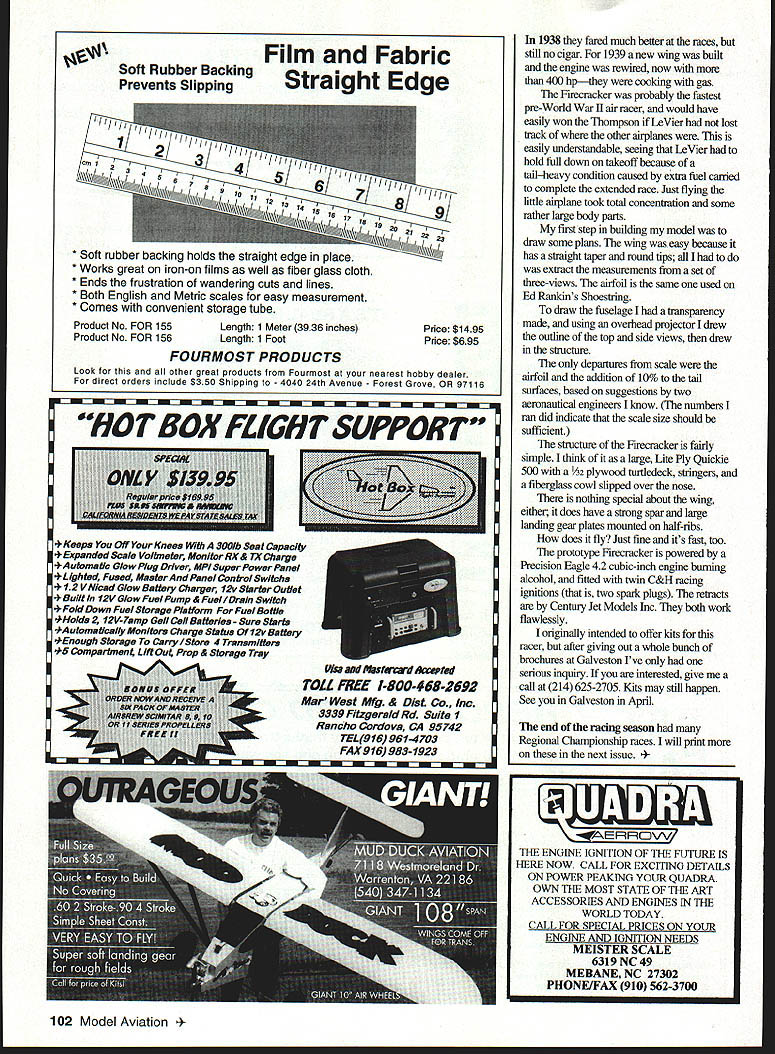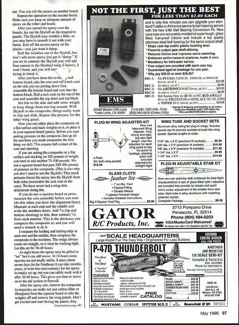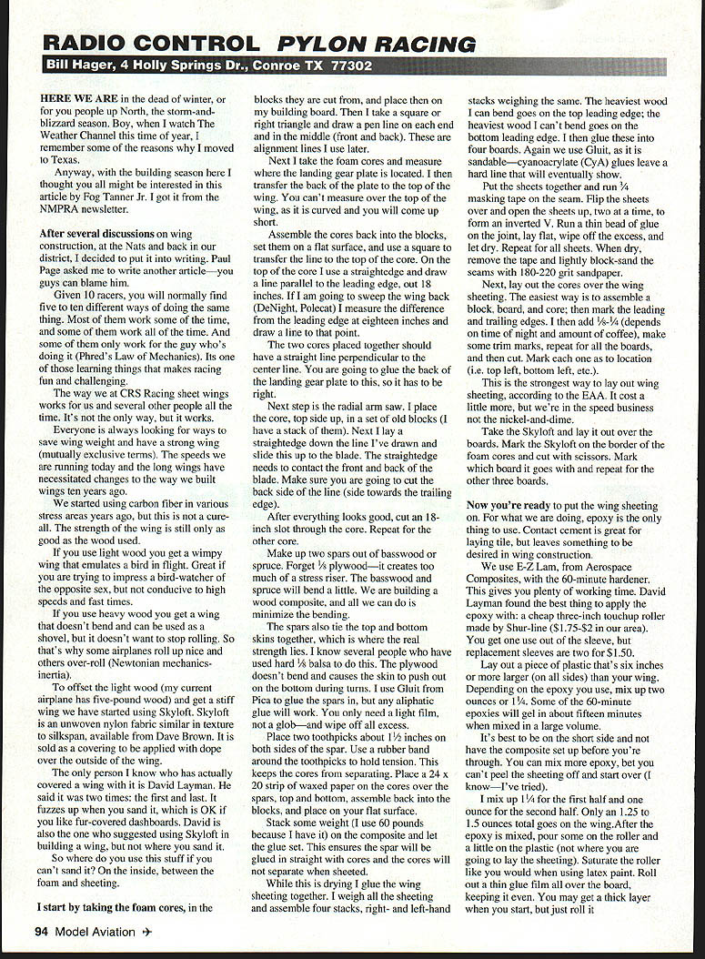 RADIO CONTROL PYLON RACING EflIE HERE WE ARE dead winter people up North storm-andblizzard season Boy watch Weather Channel time year remember some reasons moved Texas Anyway building season thought might interested article Fog Tanner Jr got NMPRA newsletter After several discussions wing construction Nats back district decided put writing Paul Page asked write another articleyou guys can blame him Given 10 racers will normally find five ten different ways doing same thing Most work some time some work time some work guy whos doing Phreds Law Mechanics Its learning things makes racing fun challenging way CRS Racing sheet wings works us several other people time Its way works Everyone always looking ways save wing weight have strong wing mutually exclusive terms speeds running today long wings have necessitated changes way built wings ten years ago started using carbon fiber various stress areas years ago cureall strength wing still good wood used use light wood get wimpy wing emulates bird flight Great trying impress bird-watcher opposite sex conducive high speeds fast times use heavy wood get wing doesnt bend can used shovel doesnt want stop rolling So thats some airplanes roll up nice others over-roll Newtonian mechanicsinertia offset light wood current airplane has five-pound wood get stiff wing have started using Skyloft Skyloft unwoven nylon fabric similar texture silkspan available Dave Brown sold covering applied dope over outside wing person know has actually covered wing David Layman said two times first last fuzzes up sand OK like fur-covered dashboards David also suggested using Skyloft building wing sand So use stuff cant sand inside between foam sheeting start taking foam cores blocks cut place building board take square right triangle draw pen line end middle front back alignment lines use later Next take foam cores measure landing gear plate located transfer back plate top wing cant measure over top wing curved will come up short Assemble cores back blocks set flat surface use square transfer line top core top core use straightedge draw line parallel leading edge out 18 inches am going sweep wing back DeNight Polecat measure difference leading edge eighteen inches draw line point two cores placed together should have stralght line perpendicular center line going glue back landing gear plate has right Next step radial arm saw place core top side up set old blocks have stack Next lay straightedge down line Ive drawn slide up blade straightedge needs contact front back blade Make sure going cut back side line side towards trailing edge After everything looks good cut 18inch slot through core Repeat other core Make up two spars out basswood spruce Forget 1/g plywoodit creates too much stress riser basswood spruce will bend little building wood composite can minimize bending spars also tie top bottom skins together real strength lies know several people have used hard /s balsa plywood doesnt bend causes skin push out bottom during turns use Gluit Pica glue spars aliphatic glue will work need light film globand wipe off excess Place two toothpicks about 1 /2 inches both sides spar Use rubber band around toothpicks hold tension keeps cores separating Place 24 x 20 strip waxed paper cores over spars top bottom assemble back blocks place flat surface Stack some weight use 60 pounds because have composite let glue set ensures spar will glued straight cores cores will separate sheeted drying glue wing sheeting together weigh sheeting assemble four stacks right- left-hand stacks weighing same heaviest wood can bend goes top leading edge heaviest wood cant bend goes bottom leading edge glue four boards Again use Gluit sandablecyanoacrylate CyA glues leave hard line will eventually show Put sheets together run 3/4 masking tape seam Flip sheets over open sheets up two time form inverted V Run thin bead glue joint lay flat wipe off excess let dry Repeat sheets dry remove tape lightly block-sand seams 180-220 grit sandpaper Next lay out cores over wing sheeting easiest way assemble block board core mark leading trailing edges add /s- depends time night amount coffee make some trim marks repeat boards cut Mark location ie top left bottom left etc strongest way lay out wing sheeting according EAA cost little speed business nickel-and-dime Take Skyloft lay out over boards Mark Skyloft border foam cores cut scissors Mark board goes repeat other three boards Now youre ready put wing sheeting what doing epoxy thing use Contact cement great laying tile leaves something desired wing construction use E-Z Lam Aerospace Composites 60-minute hardener gives plenty working time David Layman found best thing apply epoxy cheap three-inch touchup roller made Shur-line $175-$2 area get use out sleeve replacement sleeves two $150 Lay out piece plastic thats six inches larger sides wing Depending epoxy use mix up two ounces 1 Some 60-minute epoxies will gel about fifteen minutes mixed large volume Its best short side have composite set up before youre through can mix epoxy bet cant peel sheeting off start over knowIve tried mix up 1 first half ounce second half Only 125 15 ounces total goes wingAfter epoxy mixed pour some roller little plastic going lay sheeting Saturate roller like would using latex paint Roll out thin glue film over board keeping may get thick layer start just roll 94 Model Aviation You can roll excess another board Repeat operation second board Make sure keep adequate amount epoxy roller board After spread epoxy over boards lay out Skyloft respective panels Skyloft may wrinkle little may have smooth out hands Roll off excess epoxy plasticyou just want damp Roll wrinkles out Skyloft dont add epoxy just get damp try saturate Skyloft will add four ounces finished wing know won t bend will hurt yourself trying break After have done top bottom board take core roll tack coat side puffing down first Assemble bottom board core bottom block Roll tack coat top core assemble top sheet top block Set s