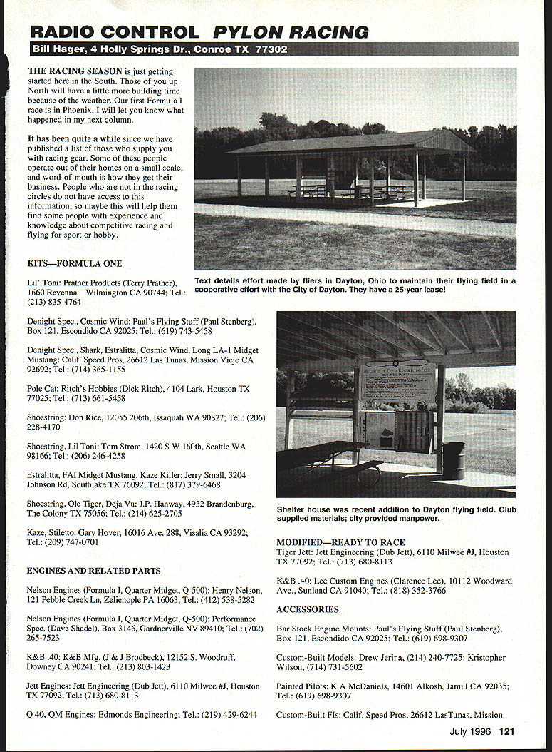 RADIO CONTROL PYLON RACING THE RACING SEASON just getting started South up North will have little building time because weather first Formula race Phoenix will let know what happened next column has quite since have published list supply racing gear Some people operate out homes small scale word-of-mouth get business People racing circles have access information maybe will help find some people experience knowledge about competitive racing flying sport hobby KITSFORMULA ONE Lil Toni Prather Products Terry Prather Text details effort made fliers Dayton Ohio maintain flying field 1660 Revenna Wilmington CA 90744 Tel cooperative effort City Dayton have 25-year lease 213 835-4764 Denight Spec Cosmic Wind Pauls Flying Stuff Paul Stenberg Box 121 Escondido CA 92025 Tel 619 743-5458 Denight Spec Shark Estralitta Cosmic Wind Long LA-i Midget Mustang Calif Speed Pros 26612 Las Tunas Mission Viejo CA 92692 Tel 714 365-1155 Pole Cat Ritchs Hobbies Dick Ritch 4104 Lark Houston TX 77025 Tel 713 661-5458 Shoestring Don Rice 12055 206th Issaquah WA 90827 Tel 206 228-4170 Shoestring Lil Toni Tom Strom 1420 5 W 160th Seattle WA 98166 Tel 206 246-4258 Estralitta FAI Midget Mustang Kaze Killer Jerry Small 3204 Johnson Rd Southiake TX 76092 Tel 817 379-6468 Shoestring Ole Tiger Deja Vu JP Hanway 4932 Brandenburg Colony TX 75056 Tel 214 625-2705 Kaze Stiletto Gary Hover 16016 Ave 288 Visalia CA 93292 Tel 209 747-0701 ENGINES AND RELATED PARTS Nelson Engines Fonnula Quarter Midget Q-500 Henry Nelson 121 Pebble Creek Ln Zelienople PA 16063 Tel 412 538-5282 Nelson Engines Formula Quarter Midget Q-500 Performance Spec Dave Shadel Box 3146 Gardnerville NV 89410 Tel 702 265-7523 K&B 40 K&B Mfg J & J Brodbeck 12152 5 Woodruff Downey CA 90241 Tel 213 803-1423 Jett Engines Jett Engineering Dub Jett 6110 Milwee #J Houston TX 77092 Tel 713 680-8113 Q 40 QM Engines Edmonds Engineering Tel 219 429-6244 MODIFIEDREADY TO RACE Tiger Jett Jett Engineering Dub Jett 6110 Milwee #J Houston TX 77092 Tel 713 680-8113 K&B 40 Lee Custom Engines Clarence Lee 10112 Woodward Ave Sunland CA 91040 Tel 818 352-3766 ACCESSORIES Bar Stock Engine Mounts Pauls Flying Stuff Paul Stenberg Box 121 Escondido CA 92025 Tel 619 698-9307 Custom-Built Models Drew Jerina 214 240-7725 Kristopher Wilson 714 731-5602 Painted Pilots K McDaniels 14601 Alkosh Jamul CA 92035 Tel 619 698-9307 Custom-Built FIs Calif Speed Pros 26612 LasTunas Mission July 1996 121 Shelter house recent addition Dayton flying field Club supplied materials city provided manpower Viejo CA 92692 Tel 714 365-1155 complete video building FIs including engines props Custom-Built FIs Drew Jerina 3109 Bluffview Garland TX 75043 Tel 214 240-7725 Q-500 KITS Nemesis QM4O Rich Tocci 544 Shadowcrest Ln Coppell TX 75019 Tel 214 462-0459 Mad Dog Matney Models Tel 313 848-8195 ReVlution Q500 Mike Del Ponte Tel 602 843-3451 Thunder Q-II Pauls Flying Stuff Paul Stenberg Box 121 Escondido CA 92025 Tel 619 743-5458 China Clipper Model Tech Hobby Stores T-Tailed Calif Speed Pros 26612 LasTunas Mission Viejo CA 92692 Tel 714 365-1155 Spickler Spickler Models Hobby Stores Texas Outlaw Dickie Ritch 4104 Lark Houston TX 77025 Tel 713 661-5458 Scat Cat Flite Line Models Hobby Stores Yellow Jacket Mills Airplane Mod 2868 Hambleton Riva MD 21140 Tel 301 956-3308 glass Q500 Barrys Model Prod Barry West 600 Vincent Mt Dora FL 32757 Tel 904 383-1122 Regulator JP Hanway 4932 Brandenburg Colony TX 75056 214 625-2705 ACCESSORIES Engine Mount Fourmost Products Hobby Stores Engine Mount Pauls Flying Stuff 619 743-5458 Wheels Performance Spec 702 2657523 Kraft Wheels Calif Speed Pros 714 365-1155 Racing Props Landing Products Box 938 Knights Landing CA 95645 Racing Props RacePro Engineering Box 445 Sutter Creek CA 95685 Wheels Vinyl Letters Cheek Cowl Tape N W Model Dist 21527 NE 227th Battle Ground WA 98604 Tel 360 687-9452 Wings & Foam Air Dynamics Lou Rodriguez 2683 Lin Gate Ct Pleasanton CA 94566 Composite Wings Wing-It Engineering Norm Johnson 405 691-8053 Master Tach Allen Booth 219 429-6244 Engine Mounts Spinners Wheels Jett Eng 713 680-8113 Prop Balancer High Point Hobby Stores Pitch Gage Prather Products 213 8354764 Royal Pro Tack Tack R/C Box 24593 Denver CO 80224 Tel 303 757-4082 Carbon Props Sport Props Custom Foam Work Barrys Model Prod Barry West 600 Vincent Mt Dora FL 32757 Tel 904 383-1122 QUARTER MIDGET KITS Estrellita Heinkel II Spiffire Toni Firecracker Gager Aircraft Sup 8425 Auburn Ft Wayne IN 46825 Tel 219 489-5060 Napair Heston Deja Vu Shoshonick Left Lane Exit Calif Speed Pros 26612 LasTunas Mission Viejo CA 92692 Tel 714 365-1155 Shark Deja Vu Napair Quality Fiberglass Bob Sealy 521 96th Blame MN 55434 Tel 612 780-2737 Rivets Latsha J Special Me-109 Matney Models Kevin Matney 11325 Harold Luna Pier MI 48157 Tel 313 848-8195 Folkerts Jim DeYoung 16627 Dobson South Holland Ii 60473 Tel 312 3399541 P-39 P-63 Greg Doe 407 Pony Smurna TN 37167 Tel 615 459-6485 Napair Calif Speed Pros 714 365-1155 Pole Kitty Gail Jacobson 2205 Britely Ter College Park GA 30349 Tel 404 7630361 P-Si Duane Gall 12800 Asbury Lakewood CO 80228 Tel 303 969-9527 Pole Cat Denight Barrys Model Prod Barry West 600 Vincent Mt Dora FL 32757 Tel 904 383-1122 have missed someone please let know will try get future column seem lot people racing Four Star 40 something found Jetero RC Club Houston Four Star 40 Speed Tricks Build light/minimum weight 41/2 lb Must use four-ounce fuel tank Sand leading edges fin/stab razor edge Delete section turtledeck under canopy Build extra strength former #3 Reduce aileron size save weight Seal hinge gaps MonoKote tape Use tall skid instead tall wheel Install 2-inch racing wheels Recess landing gear fuselage Grind leading edge landing gear Cut off cowl cheek side-mount engine steamline/enclose cowl area Make firewall 00 offset Use miniservos throttle rudder Use balsa instead Lite Ply fuselage sides Recess wing saddle 1/8 wing bolt Use 250 mAb battery pack Build optional foam wing spare Use littl