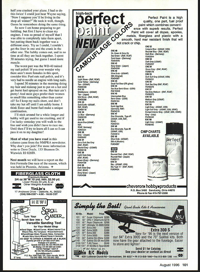 RADIO CONTROL PYLON RACING THE LAST RACE OF 1995 probably Tangerine report Jerry Salisbury Tangerine two weeks earlier year past Judging entry numbers will remain middle December future Quarter Midget 26 entries would have four five several test crashes day before first heat went off time despite Carl Simms forgetting register crew having re-matrix weather could have better mid 80s no wind cloud sky Vein Smith set first round pace 10923 time tested heat after heat wound up fast time event Five rounds completed early afternoon complete race Some memorable action during race Steve Kovack Chip Hyde midaired half way #1 sending Steve ground Chip trees ended both pilots day Mike Stokes landed tree after Heat Three put hurt pretty Kaze Killer Round Five two-plane heat Jerry Small Rex wrecks Knepper calling Rex first lap Number Three pylon got center-punched Jerrys Rexs airplanes similar color just figured wrecks hit pylon walking away Rex asked going Jerry hit pole Oh well have fired caller before five rounds complete three-way tie first among Norm Johnson Rick Landers Kevin Clark What great way end race have flyoff trophy spots great race Norm Kevin cuts Rick clean taking first Norm second followed Kevin Vein Smith held fast time made JR Radio Nelson sweep trophy spots another highly competitive QM race some first time QM pilots hooked new event couple young bucks deserve note Gary Freeman Jr Jason Shulman both Orlando area excellent pilots have plenty smoke put hurtin ya good see Dennis OBrien back just graduated college somebody has finish last Dennis filled spot heard several Q-500 guys would like try QM dont know anything about building fiberglass fuselage dont want learn paint Well Jerry Mr Innovator Small has come rescue has developed Toni kit builds like Quickie has box fuselage fiberglass turtledeck nose piece cheek cowls glue right place quick aerosol paint job match MonoKote formed parts youre off race thing really looks neat Ken Howell flew Tangerine turned 115 117 just getting dialed ground bit him rounding Pylon Three Ill have report about future newsletter Jerry sending woodies build fly interested give Jerry call Small Creations am looking forward playing Late-Breaking News QM Championship Race will hosted Weak Signals Club Toledo Ohio Wayne Yeager has agreed CD September 14-15 event trophies prize money freebies cookout funbe cute little note Karen Yeager go Nats know past years Karen has helping husband Wayne run Pylon Karen usually out sun day starting races listening us complain kid growing up flying airplanes Dad always said would have marry someone hobby because very well shouldnt go flying Sunday leave husband home kids did manage marry modeler just modeler Pylon racer honeymoon trip Lincoln Nebraska Nats flying put hold hubby spent weekend race somewhere kept hand building helping him sand glass wings After several years watching everyone else having fun racing decided try took some time get hang after two years racing Rossis decided try fly big boys Notice saidflynot race Holding onto Nelson Q500 making go want two completely different things have blessed receiving help great people Guess time being woman blessing Youd surprised just what being females sport allows get away Nats first major contest learned lotwas just taking up space though January went Phoenix fly annual Q500 race now know what Jamaican bobsled team felt like competition awesome wasnt unless count great splatter around #3 pylon rated 10 up transmitter about 5 feet behind plane Sunday bound-anddetermined have good low takeoff did problem did guy next met halfway #1 taken off like usually elevator would have never met guess what call paying dues now know guys feel have call home tell better 100 Model Aviation area Texas races race put Space City RIC Club Houston Texas Send pictures race events half crashed plane twice could just hear Wayne saying Now suppose youll living shop winter took well though Guess remembers doing same thing So now am home preparing get building first have clean engines proud myself able completely take apart putting back together different story Try could couldnt get liner crank other hubby comes out no time back together spent 30 minutes trying guess need muscle worst part WD-40 ruined nail polish ever wonder arent females sport consider Fuel eats nail polish its very needle engine long nails spend 30 minutes morning doing hair makeup just put hat get burnt fuel sprayed Hat-hair aint pretty guys prefer women smell like something other castor oil So keep nails short dont take hat off until am safely home think Estee burnt fuel make unique combination Ill stick around longer hubby will get used crashing Im lucky someday will walk line wish didnt have race Until Ill try learn can can pass daughter Most what have read column came NMPRA newsletter dont join information write Dave Doyle 133 Shannon Dr Warwick RI 02889 Next moath will have report first Formula race season held Phoenix Arizona rn w eJ — Premium Grade 314 oz 38W 10 yrd mm $250 yd Lower Prices 30 yds & up Other Weights Available TinLins 17 Andrews Drive ville AL 36322 334 598-2287 1000 CST LL ur Turn YoANDER Scroll Saw Versatile Sanding Tool Model Shop Sand Edges Ssnd Cuves Sand Internal Cuts Sand Ribs Rib Templates Sand Bulkheads SandlShape Metal Plywood Balsa Composites Lasts Hours Sasd Pieces Seconds AS EASY TO ATTACH & REMOVE ASA BLADE Specify pin-end sr pin-less scroll saw Package 4 sanders __Speafy Grit Siza 80120180220320 $595/pkg 6195 S&H per order Combo Package ___80120180220 grits available ScrollSander PO Boo 1086 Dept MA Verdi Nevada 88439 5 long 2-345-1660 FAX 702345-1683 CKE31 Light Stone RAT RCAF Sand Yellow Germany Tan USAAF FS#20400 CHE 32 Middlestone USAAT Tan lJspan Mid Stone RAF ROAT FS#30266 CHE 33 Dark Earth USAAT RAF ROAT FS#30 118 CHE34 Lt Blue Germany FS#26329 CHE 35 Azure Blue USAAT RAT RCAF Germany TS#35231 CHE 38 Grey Japan FS#36492 ChIC 37 Estra Dark Sea Grey RAT RCAF Neutral Grey- USAAF TS
