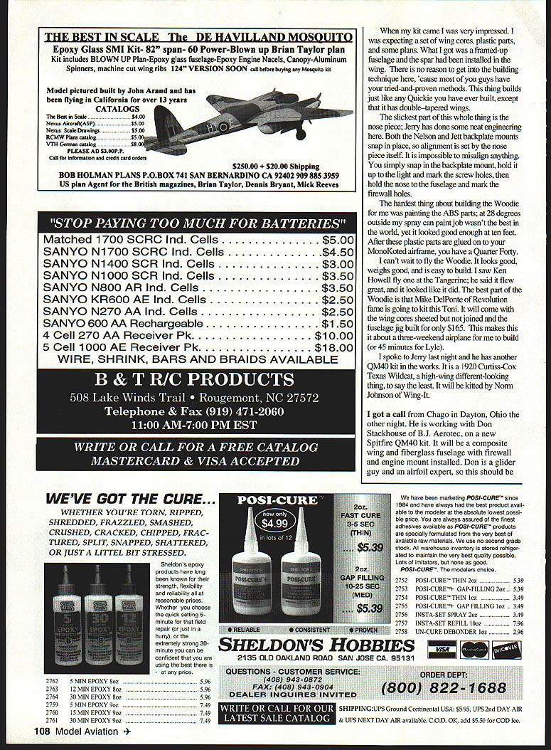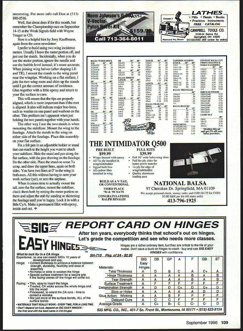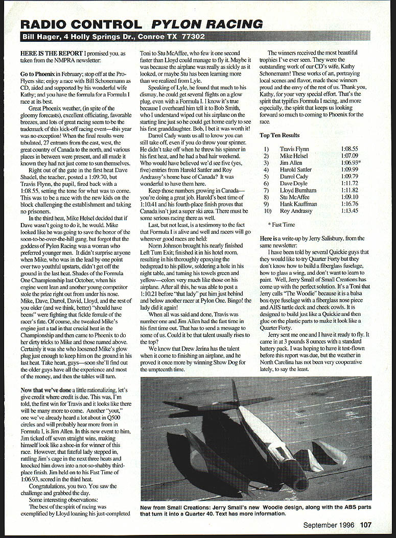RADIO CONTROL PYLON RACING HERE IS THE REPORT promised taken NMPRA newsletter Go Phoenix February stop off ProFlyers site enjoy race Bill Schonemann CD aided supported wonderful wife Kathy have formula Formula race its best Great Phoenix weather spite gloomy forecasts excellent officiating favorable breezes lots great racing seem trademark kick-off racing eventthis year no exception final results tabulated 27 entrants east west great countiy Canada north various places between present made known just come sun themselves Right out gate first heat Dave Shadel teacher posted 10970 Travis Flynn pupil fired back 10855 setting tone what come race new kids block challenging establishment taking no pnsoners third heat Mike Helsel decided Dave wasnt going would Mike looked like going save honor soon-to-be-over-the-hill gang forgot goddess Pylon Racing woman preferred younger men didnt surprise anyone Mike lead point over two youthful upstarts didnt get off ground last heat Shades Formula Championship last October engine went lean another young competitor stole prize right out under nose Mike Dave Darrol David Lloyd rest older think better should have beens fighting fickle female racer s fate course tweaked Mikes engine just tad crucial heat Championship came Phoenix dlity tricks Mike named above Certainly loosened Mikes glow plug just enough keep him ground last heat Take heart guyssoon shell find out older guys have experience money tables will turn Now weve done little rationalizing lets give credit credit due Im told first win Travis looks like will come Another yout weve already heard lot about Q500 cireles will probably hear Formula Jim Allen new event him Jim ticked off seven straight wins making himself look like shoe-in winner race However fateful lady stepped rattling Jims cage next three heats knocked him down not-so-shabby thirdplace finish Jim held Fast Time 10693 scored third heat Congratulations two saw challenge grabbed day Some interesting observations best spirit racing exemplified Lloyd loaning just-completed Toni Stu McAffee few second faster Lloyd could manage fly Maybe because airplane really sickly looked maybe Stu has learning realized Lyle Speaking Lyle found much dismay could get several flights glow plug Formula I know its true because overheard him tell Bob Smith understand wiped out airplane starting line just could get home early see first granddaughter Bob bet worth Darrol Cady wants us know can still take off throw spinner didnt take off threw spinner first heat bad hair weekend would have believed wed see five yes five entries Harold Sattler Roy Andrassys home base Canada wonderful have Keep numbers growing Canada youre doing great job Harolds best time 11041 fourth-place finish proves Canada isnt just super ski area must some serious racing well Last least testimony fact Formula alive well racers will go wherever good races held Norm Johnson brought nearly finished Left Turn Exit finished hotel room resulting thoroughly epoxying bedspread pillow soldering hole night table turning towels green yellowcolors very much like airplane After able post 11021 before lady put him just behind below another racer Pylon Bingo lady did again said done Travis number Jim Allen fast time first time out has send message some us Could talent usually rises top know Drew Jerina has talent come finishing airplane proved once winning Show Dog umpteenth time winners received beautiful trophies Ive ever seen outstanding work CDs wife Kathy Schonernann woiks art portraying local scenes flavor made winners proud envy rest us Thank Kathy very special effort Thats spirit typifies Formula racing especially spirit keeps us looking forward much corning Phoenix race Top Ten Results 1 Travis Flynn 2 Mike Helsel 3 Jim Allen 4 Harold Sattler 5 Darrol Cady 6 Dave Doyle 7 Lloyd Burnham 8 StuMcAffee 9 Hank Kauffman 10 Roy Andrassy 10855 10709 10693* 10999 10979 11172 11182 10910 1 1676 11345 * Fast Time write-up Jeny Salisbtuy same newsletter have told several Quickie guys would like try Quarter Forty dont know build fiberglass fuselage glass wing dont want learn paint Well Jeny Small Small Creations has come up perfect solution Its Toni Jerry calls Woodie because balsa box-type fuselage fiberglass nose piece ABS turtle deck cheek cowls desigued build just like Quickie glue plastic parts make look like Quarter Forty Jeny sent have ready fly came 3 pounds 8 ounces standard battery pack hoping have test-flown before report due weather North Carolina has very cooperative lately say least September 1996 107 New Small Creations Jerry Smalls new Woodie design along ABS parts turn Quarter 40 Text has information Matched 1700 SCRC md Cells$500 SANYO N1700 SCRC md Cells$450 SANYO N1400 SCR md Cells$300 SANYO NiOQO 5CR md Cells$350 SANYO N800 AR Ind Cells$350 SANYO KR600 AE Ind Cells$250 SANYO N270 AA Ind Cells$250 SANYO 600 AA Rechargeable$150 4 Cell 270 AA Receiver Pk$1000 5 Cell 1000 AE Receiver Pk$1800 WIRE SHRINK BARS AND BRAIDS AVAILABLE kit came veoy impressed expecting set wing cores plastic parts some plans What got framed-up fuselage spar installed wing no reason get building technique cause guys have tned-and-pmven methods thing builds just like Quickie have ever built except has doubletapered wings slickest part whole thing nose piece Jeny has done some neat engineering Both Nelson Jets backplate mounts snap place alignment set nose piece itself impossible misalign anything simply snap hackplate mount hold up light mark screw holes hold nose fuselage mark firewall holes hardest thing about building Woodie painting ABS parts 28 degrees outside spray can paint job wasnt best world yet looked good enough ten feeL After plastic parts glued MonoKoted airframe have Quarter Forty cant wait fly Woodie looks good weighs good easy build saw Ken Howell fly Tangerine said flew great looked like did best part Woodie Mike DelPonte Revolution fame going kit Toni will come wing cores sheeted joined fuselage jig buil