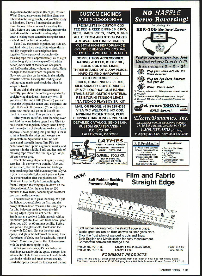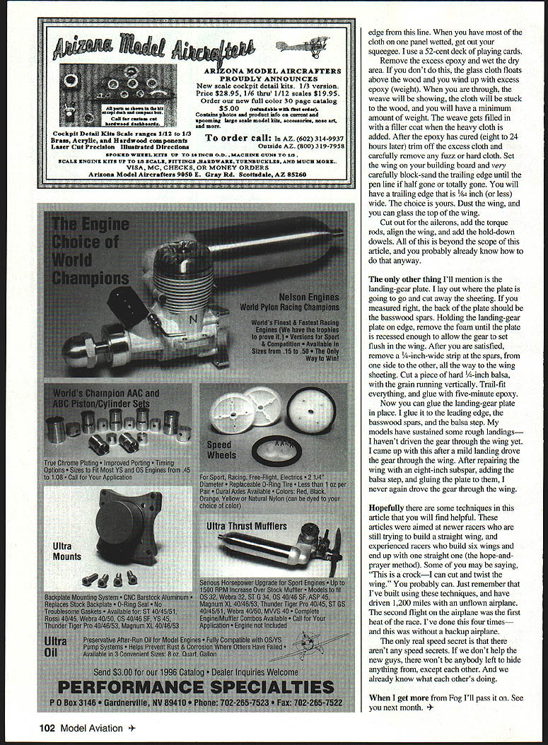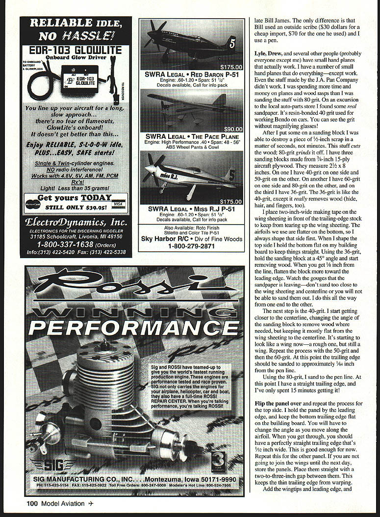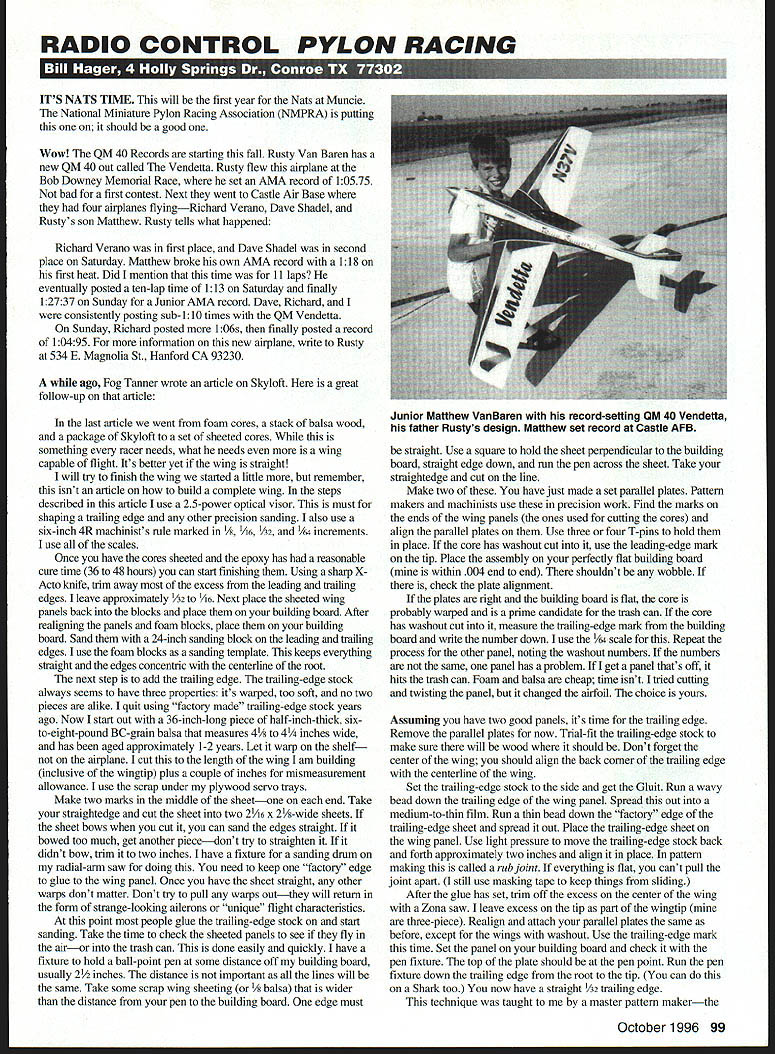 RADIO CONTROL PYLON RACING U 41 ITS NATS TIME will first year Nats Muncie National Miniature Pylon Racing Association NMPRA putting should good Wow QM 40 Records starting fall Rusty Van Baren has new QM 40 out called Vendetta Rusty flew airplane Bob Downey Memorial Race set AMA record 10575 bad first contest Next went Castle Air Base four airplanes flyingRichard Verano Dave Shadel Rustys son Matthew Rusty tells what happened Richard Verano first place Dave Shadel second place Saturday Matthew broke own AMA record 118 first heat Did mention time 11 laps eventually posted ten-lap time 113 Saturday finally 12737 Sunday Junior AMA record Dave Richard consistently posting sub-110 times QM Vendetta Sunday Richard posted 1 06s finally posted record 10495 information new airplane write Rusty 534 E Magnolia St Hanford CA 93230 ago Fog Tanner wrote article Skyloft great follow-up article last article went foam cores stack balsa wood package Skyloft set sheeted cores something racer needs what needs wing capable flight Its better yet wing straight will try finish wing started little remember isnt article build complete wing steps described article use 25-power optical visor must shaping trailing edge other precision sanding also use six-inch 4R machinists rule marked 1/8 1A6 2 I/ increments use scales Once have cores sheeted epoxy has reasonable cure time 36 48 hours can start finishing Using sharp X Acto knife trim away excess leading trailing edges leave approximately Y32 1/16 Next place sheeted wing panels back blocks place building board After realigning panels foam blocks place building board Sand 24-inch sanding block leading trailing edges use foam blocks sanding template keeps everything straight edges concentric centerline root next step add trailing edge trailing-edge stock always seems have three properties its warped too soft no two pieces alike quit using factory made trailing-edge stock years ago Now start out 36-inch-long piece half-inch-thick sixto-eight-pound BC-grain balsa measures 4/s 4 inches wide has aged approximately 1-2 years Let warp shelf airplane cut length wing am building inclusive wingtip plus couple inches mismeasurement allowance use scrap under plywood servo trays Make two marks middle sheetone end Take straightedge cut sheet two 21/i6 x 21/8-wide sheets sheet bows cut can sand edges straight bowed too much get another piecedont try straighten it didnt bow trim two inches have fixture sanding drum radial-arm saw doing need keep factory edge glue wing panel Once have sheet straight other warps dont matter Dont try pull warps outthey will return form strange-looking ailerons unique flight characteristics point people glue trailing-edge stock start sanding Take time check sheeted panels see fly airor trash can done easily quickly have fixture hold ball-point pen some distance off building board usually 2 inches distance important lines will same Take some scrap wing sheeting 1/ balsa wider distance pen building board edge must straight Use square hold sheet perpendicular building board straight edge down run pen across sheet Take straightedge cut line Make two have just made set parallel plates Pattern makers machinists use precision work Find marks ends wing panels ones used cutting cores align parallel plates Use three four T-pins hold place core has washout cut use leading-edge mark tip Place assembly perfectly flat building board within 004 end end shouldnt wobble check plate alignment plates right building board flat core probably warped prime candidate trash can core has washout cut measure trailing-edge mark building board write number down use /s scale Repeat process other panel noting washout numbers numbers nut same panel has problem get panel thats off hits trash can Foam balsa cheap time isnt tried cutting twisting panel changed airfoil choice yours Assuming have two good panels its time trailing edge Remove parallel plates now Trial-fit trailing-edge stock make sure will wood should Dont forget center wing should align back corner trailing edge centerline wing Set trailing-edge stock side get Gluit Run wavy bead down trailing edge wing panel Spread out medium-to-thin film Run thin bead down factory edge trailing-edge sheet spread out Place trailing-edge sheet wing panel Use light pressure move trailing-edge stock back forth approximately two inches align place pattern making called rub joint everything flat cant pull joint apart still use masking tape keep things sliding After glue has set trim off excess center wing Zona saw leave excess tip part wingtip three-piece Realign attach parallel plates same before except wings washout Use trailing-edge mark time Set panel building board check pen fixture top plate should pen point Run pen fixture down trailing edge root tip can Shark too now have straight 1A2 trailing edge technique taught master pattern makerthe October 1996 99 Junior Matthew VanBaren record-setting QM 40 Vendetta father Rustys design Matthew set record Castle AFB 100 Model Aviation 4SWRA LEGAL BARON P-51 Engine 60-120 511/2 Decals available Call info pack WHR0 HE PACE PLANE Engine High Perfomance 40 Span 48 56 AR Wheel Pant Available Roto Finish Stiletto Color Tile P-Si Sky Harbor R/C Fine Woods 1-800-279-2871 late Bill James difference Bill used outside scribe $30 dollars cheap import $70 used use pen Lyle Drew several other people probably everyone except have small hand planes actually work have number small hand planes everythingexcept work stuff made JA Pan Company didnt work spending time money planes wood rasps sanding stuff 80 griL excursion local auto-parts store found some real sandpaper Its resin-bonded 41 grit used working Bondo cars can see grit magnifying glasses After put some sanding block able destroy piece -inch scrap matter seconds minutes stuff cuts wood 80-grit grinds off have three sanding blocks made 3/4-inch 15-ply aircraft plywood measure 2 x 8 inches have 40-grit side 50-grit other another have 60-grit side 80-grit o