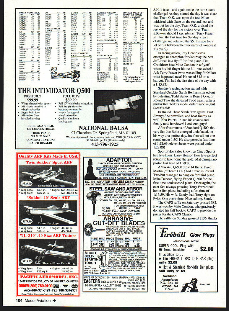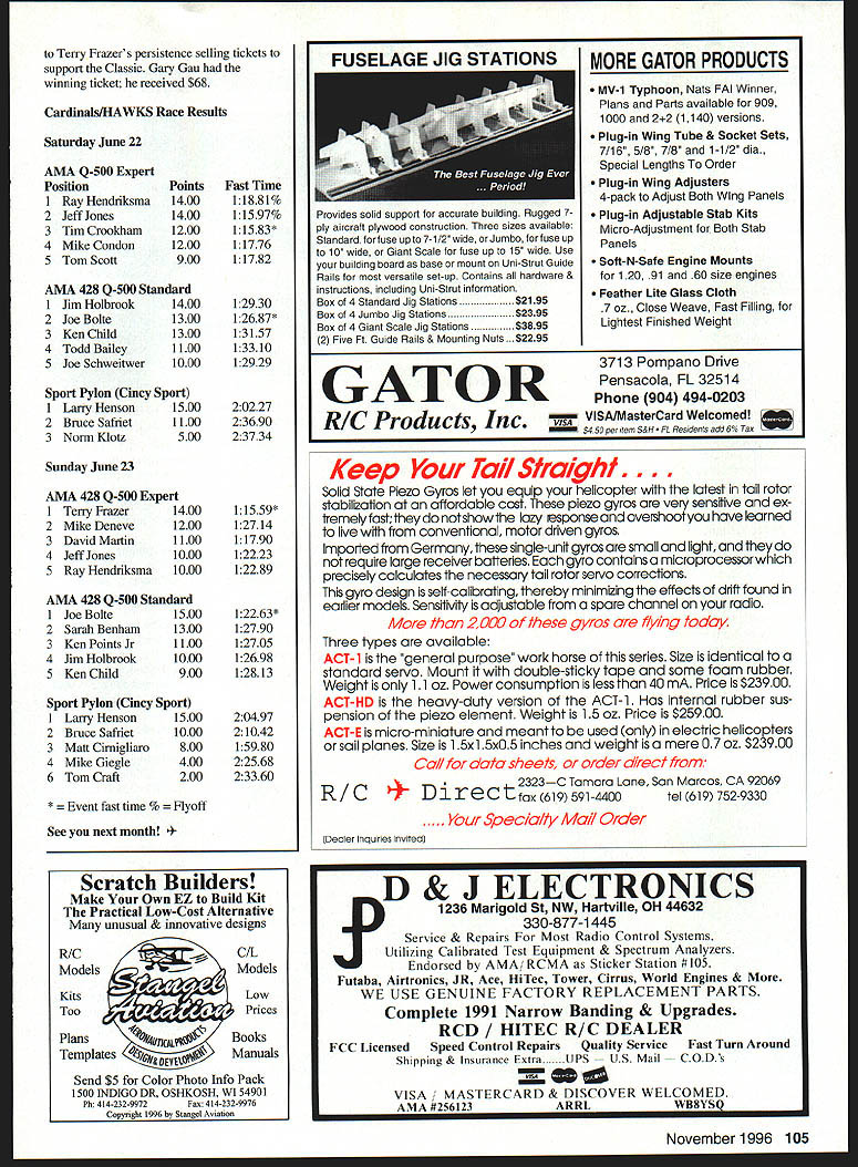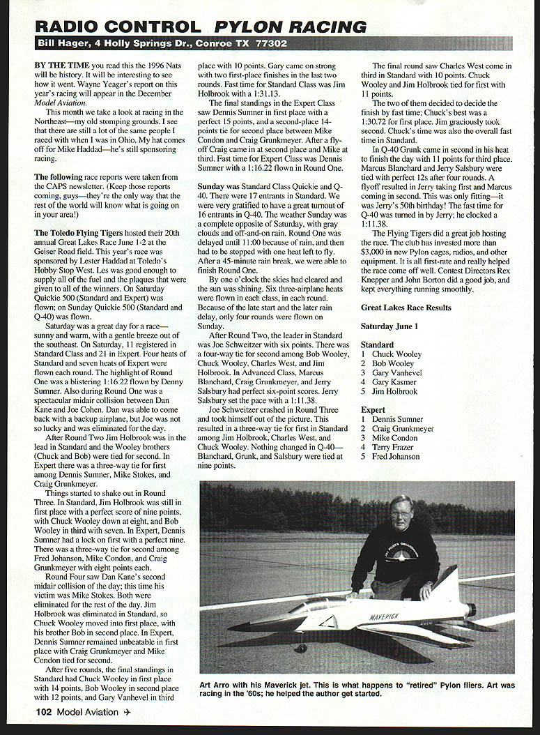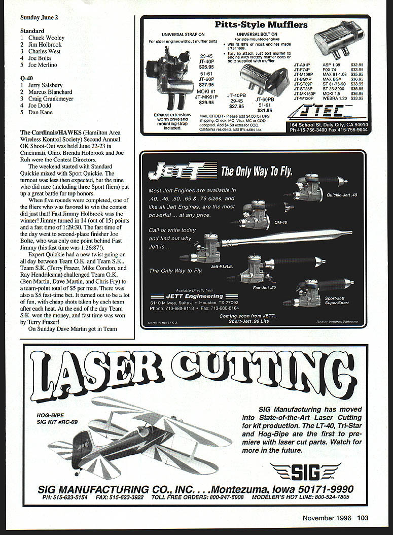 RADIO CONTROL PYLON RACING 11111 BY THE TIME read 1996 Nats will history will interesting see went Wayne Yeagers report years racing will appear December Model Aviation month take look racing Northeastmy old stomping grounds see still lot same people raced Ohio hat comes off Mike Haddadhes still sponsoring racing following race reports taken CAPS newsletter Keep reports coming guystheyre way rest world will know what going area Toledo flying Tigers hosted 20th annual Great Lakes Race June 1-2 Geiser Road field years race sponsored Lester Haddad Toledos Hobby Stop West Les good enough supply fuel plaques given winners Saturday Quickie 500 Standard Expert flown Sunday Quickie 500 Standard Q-40 flown Saturday great day race sunny warm gentle breeze out southeast Saturday 11 registered Standard Class 21 Expert Four heats Standard seven heats Expert flown round highlight Round blistering 11622 flown Denny Sumner Also during Round spectacular midair collision between Dan Kane Joe Cohen Dan able come back backup airplane Joe lucky eliminated day After Round Two Jim Holbrook lead Standard Wooley brothers Chuck Bob tied second Expert three-way tie first among Dennis Sumner Mike Stokes Craig Gninkmeyer Things started shake out Round Three Standard Jim Holbrook still first place perfect score nine points Chuck Wooley down eight Bob Wooley third seven Expert Dennis Sumner lock first perfect nine three-way tie second among Fred Johanson Mike Condon Craig Grunkmeyer eight points Round Four saw Dan Kanes second midair collision day time victim Mike Stokes Both eliminated rest day Jim Holbrook eliminated Standard Chuck Wooley moved first place brother Bob second place Expert Dennis Sumner remained unbeatable first place Craig Grunkmeyer Mike Condon tied second After five rounds final standings Standard Chuck Wooley first place 14 points Bob Wooley second place 12 points Gary Vanhevel third place 10 points Gary came strong two first-place finishes last two rounds Fast time Standard Class Jim Holbrook 13113 final standings Expert Class saw Dennis Sumner first place perfect 15 points second-place 14points tie second place between Mike Condon Craig Grunkmeyer After flyoff Craig came second place Mike third Fast time Expert Class Dennis Sumner 11622 flown Round Sunday Standard Class Quickie Q 40 17 entrants Standard very gratified have great turnout 16 entrants Q-40 weather Sunday complete opposite Saturday gray clouds off-and-on rain Round delayed until 1100 because rain stopped heat left fly After 45-minute rain break able finish Round oclock skies cleared sun shining Six three-airplane heats flown class round Because late start later rain delay four rounds flown Sunday After Round Two leader Standard Joe Schweitzer six points four-way tie second among Bob Wooley Chuck Wooley Charles West Jim Holbrook Advanced Class Marcus Blanchard Craig Grunkmeyer Jerry Salsbury perfect six-point scores Jerry Salsbury set pace 11138 Joe Schweitzer crashed Round Three took himself out picture resulted three-way tie first Standard among Jim Holbrook Charles West Chuck Wooley Nothing changed Q-40 Blanchard Grunk Salsbury tied nine points final round saw Charles West come third Standard 10 points Chuck Wooley Jim Holbrook tied first 11 points two decided decide finish fast time Chucks best 13072 first place Jim graciously took second Chucks time also overall fast time Standard Q-40 Grunk came second heat finish day II points third place Marcus Blanchard Jerry Salsbury tied perfect 12s after four rounds flyoff resulted Jerry taking first Marcus coming second fittingit Jerrys 50th birthday fast time Q-40 turned Jerry clocked 11138 Hying Tigers did great job hosting race club has invested $3000 new Pylon cages radios other equipment first-rate really helped race come off well Contest Directors Rex Knepper John Borton did good job kept everything running smoothly Great Lakes Race Results Saturday June 1 Standard 1 Chuck Wooley 2 Bob Wooley 3 Gary Vanhevel 4 Gary Kasmer 5 Jim Holbrook Expert 1 Dennis Sumner 2 Craig Grunkmeyer 3 Mike Condon 4 Terry Frazer 5 Fred Johanson 102 Model Aviation Arro Maverick jet what happens retired Pylon fliers Art racing 60s helped author get started Sunday June 2 Standard 1 Chuck Wooley 2 Jim Holbrook 3 Charles West 4 Joe Bolta 5 Joe Merlino Q-40 1 Jeny Salsbury 2 Marcus Blanchard 3 Craig Grunkmeyer 4 Joe Dodd 5 DanKane Cardinals/HAWKS Hamilton Area Wireless Kontrol Society Second Annual OK Shoot-Out held June 22-23 Cincinnati Ohio Brenda Holbrook Joe Ruh Contest Directors weekend started Standard Quickie mixed Sport Quickie turnout less expected nine did race including three Sport fliers put up great battle top honors five rounds completed fliers favored win contest did just Fast Jimmy Holbrook winner Jimmy turned 14 out 15 points fast time 12930 fast time day went second-place finisher Joe Bolte point behind Fast Jimmy fast time 12687 Expert Quickie new twist going day between Team OK Team 5K. Team SK Terry Frazer Mike Condon Ray Hendriksma challenged Team OK Ben Martin Dave Martin Chris Fry team-point total $5 per man also $5 fast-time bet turned out lot fun cheap shots taken team after heat end day Team 5K won money fast time won Terry Frazer Sunday Dave Martin got Team Pitts-Style Mufflers UNIVERSAL STRAP ON older engines muffler bolts Exhaust extensions worm drEw mounting strap Included 29-45 JT-40P $2595 51-61 JT-60P $2795 MOKI 61 JT-MK61P $2995 UNIVERSAL BOLT ON side mounted engines Will fit 90% engines made after 1989 Easy attach Just bolt muffler engine factory muffler bolts boits sunoiied muffler JT-4OPB 29-45 Ji $2795b-o $3195 MAIL ORDER Please add $400 br UPS shipping Check MO Visa MC COD accepted Add $450 eatra COD California residenia add 8% sales isa JT-A91PASP 108$3295 JT-F74PPOX 74$3395 JT-M1O8PMAX 91-108$3595 JT-BGXPMAX BGXI$3695 JT-5T69PST 61-75-90$3395 JT-5T25PST 25-3000$3595 JT-MK15OPMOKI 15$3695 JT-W1 20PWEBRA 120$33 95 November 1996 103 HOG-B IPE SIG KIT #RC-69 SIG Manufactur