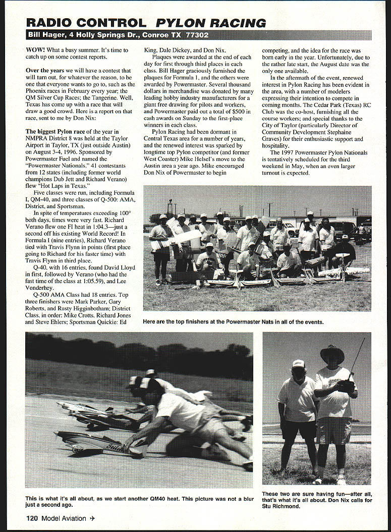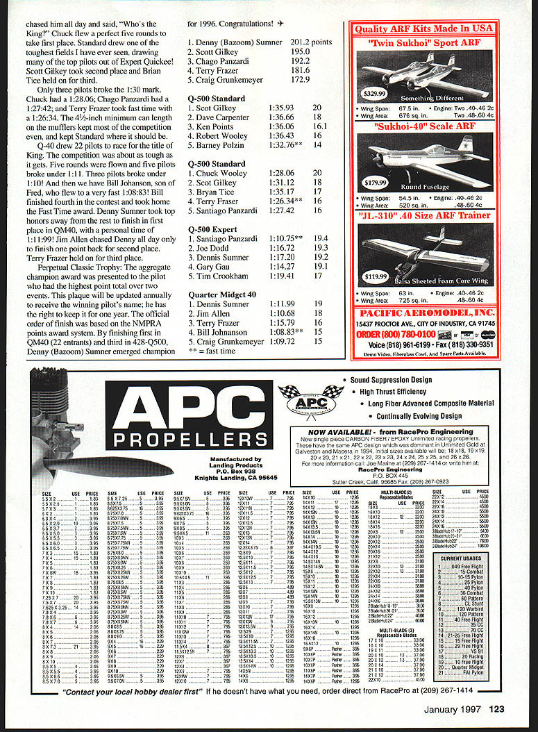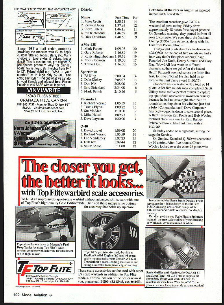 RADIO CONTROL PYLON RACING U 11 WOW What busy summer Its time catch up some contest reports Over years will have contest will turn out whatever reason everyone wants go such Phoenix races February year QM Silver Cup Races Tangerine Well Texas has come up race will draw good crowd report race sent Don Nix biggest Pylon race year NMPRA District 8 held Taylor Airport Taylor TX just outside Austin August 3-4 1996 Sponsored Powermaster Fuel named Powermaster Nationals 41 contestants 12 states including former world champions Dub Jett Richard Verano flew Hot Laps Texas Five classes run including Formula QM-40 three classes Q-500 AMA District Sportsman spite temperatures exceeding 1000 both days times very fast Richard Verano flew Fl heat 1043just second off existing World Record Formula nine entries Richard Verano tied Travis Flynn points first place going Richard faster time Travis Flynn third place Q-40 16 entries found David Lloyd first followed Verano fast time class 10559 Lee Vonderhey Q-500 AMA Class 18 entries Top three finishers Mark Parker Gary Roberts Rusty Higginbotham District Class order Mike Crotts Richard Jones Steve Ehlers Sportsman Quickie Ed King Dale Dickey Don Nix Plaques awarded end day first through third places class Bill Hager graciously furnished plaques Formula 1 others awarded Powermaster Several thousand dollars merchandise donated leading hobby industry manufacturers giant free drawing pilots workers Powermaster paid out total $500 cash awards Sunday first-place winners class Pylon Racing dormant Central Texas area number years renewed interest sparked longtime top Pylon competitor former West Coaster Mike Helsels move Austin area year ago Mike encouraged Don Nix Powermaster begin competing idea race born early year Unfortunately due rather late start August date available aftermath event renewed interest Pylon Racing has evident area number modelers expressing intention compete coming months Cedar Park Texas RC Club co-host furnishing course workers special thanks City Taylor particularly Director Community Development Stephaine Graves enthusiastic support hospitality 1997 Powermaster Pylon Nationals tentatively scheduled third weekend May larger turnout expected 120 Model Aviation finishers Powermaster Nats events two sure having funafter what its about start another 0M40 heat picture blurthats what its about Don Nix calls just second agoStu Richmond CUSTOM LETTER TODAY THE VINYL WRITE WAY FZ~FIEZZI1 IAMA~1I Since 1987 mail order company providing modeler EZ apply custom lettering logos stars etc choices type styles & colors decal custom cut pre-aligned & gresaced premium vinyl planes oats trains toys etc Heights 1/4 12 Priced right eg AMA er 1 high $250. color style Find out what can foryou Sample infopack tree Please include #10 SASE inquiries S 16043 TULSA STREET GRANADA HILLS CA 91344 818-363-7131 Mon Thur 10-4pm PST EMAIL vinylrt@datadepotcom Plus $2 P/H Ca res add tax District Name 1 Mike Crotts 2 Richard Jones 3 Steve Ehiers 4 Stu Richmond 5 Dick Davidson AMA-428 1 Mark Parker 2 Gary Roberts Fast Time 15021 13793 146 15 14659 14060 3 Rusty Higginbotham 11939 4 Norm Johnson 11900 5 Travis Flynn 11600 Sportsman 1 Ed King 2 Dale Dickey 3 Don Nix 4 Eric Strickland 5 Mark Bench Formula 1 Richard Verano 2 Travis Flynn 3 Stu McAfee 4 Mike Helsel 5 Dave Layman Q-40 1 David Lloyd 2 Richard Verano 3 Lee Vonderhey 4 Dub Jett 5 Stu McAfee 20004 20507 22800 23400 2 1096 Lets look race August reported CAPS newsletter Pts 14The excellent weather gave CAPS 12weekend great racing Friday drew 11approximately 18 racers day practice 10On Saturday morning poured 9over compete drew National Champ 1996 Arizona along Dad Peoria Illinois 1090320 ty-eight pilots dared top honors 1168919428-Q500 end five rounds 19four-way tie first place among Chago 17Panardzi Joe Dodd Denny Sumner Gary 16Gau Wow four different channels go After heated flyoff Panzardi zoomed across finish line 14first title King also held 13receive Fast Time award 11075 10 dard contested total 14 6pilots After five rounds completed Scott 5Gilkey raced five perfect rounds capture top spot Scott received award Sunday because leave right after fifth 1055915round something about wife just 1092215a baby Congratulations Dave Carpenter 110009finished two points down take second place 109938A flyoff between Ken Points Bob Wooley 120007for third place won Ken Barney Polzen held take Fast Time 13276 20 rday ended high note setting 19stage Sunday 15 ay Standard Q-500 contested 12by 26 entries After five rounds Chuck 12Wooley looked over other 25 pilots 10900 10559 10723 10944 11100 doser MmaeL Ut better kx&s.i Top Flitewarbird scale accessories build impressively sport-scale warbird advanced skills start Top Flites hieh-aualitv Gold Editionkits add inexpensive options accuracy holds up up close Top FiJTL Distributed Exclusively Through GREAT PLANES DISTRIBUTORS COMPANY PO Box 9021 Champaign IL 61 826-9021 scale accessories can used other 1/7 scale warbirds addition Top Flite models location dealer nearest please call 1-800-682-8948 ext 0410R cxpyigsr 19953079055 122 Model Aviation Scale Static oduce 4-blade design full-size P-51D Mustang 3-blade design F4U Corsair P-40E Warhawk display use Durable prebalanced Scale Plastic Spinners maintain true scale outline Mustang Warhawk Available red white Reproduce Warhawk Mustangs Fuel Drop Tanks using Top Flites scale version complete hardware attachment in-flight release Top Flites precision-xormeo 4-cylinder Replica Radial Engine 1/7 1/8 scale easily mounts inside Corsair AT-6 Thunderbolts cowladding scale looks acting baffle improve engine cooling Scale Muffler Headers OSx 61 SF SuperTigre 61-75 2-stroke engines fit completely inside warbirdx cowl maintain its scale lines AT-6 Texan can achieve true scale exhaust location chased him day said Whos King Chuck flew perfect five rounds take first place Standard drew toughest fields have ever seen drawing top pilots out Expert Quickee Sc