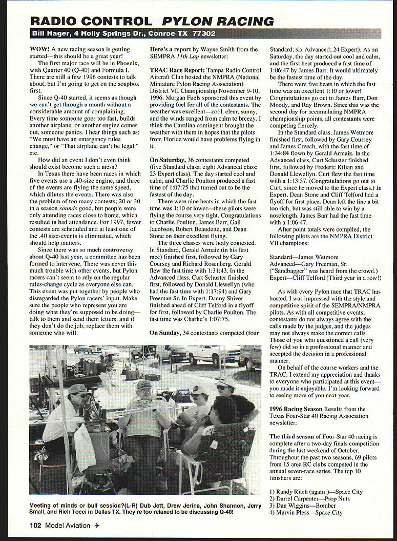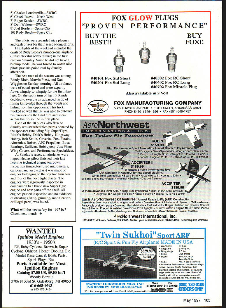 RADIO CONTROL PYLON RACING WOW new racing season getting startedthis should great year first major race will Phoenix Quarter 40 Q-40 Formula still few 1996 contests talk about Im going get soapbox first Since Q-40 started seems though cant get through month considerable amount complaining time someone goes too fast builds another airplane another engine comes out someone panics hear things such must have emergency rules change airplane cant legal etc did event dont think should exist become such mess Texas have races five events use 40-size engine three events flying same speed dilutes events also problem too contests 20 30 season sounds good people attending races close home resulted bad attendance 1997 fewer contests scheduled least 40 size-events eliminated should help matters Since much controversy about Q-40 last year committee has formed intervene never much trouble other events Pylon racers cant seem rely regular rules-change cycle everyone else can event put together people disregarded Pylon racers input Make sure people represent doing what theyre supposed doing talk send letters dont job replace someone will Heres report Wayne Smith SEMPRA 11th Lap newsletter TRAC Race Report Tampa Radio Control Aircraft Club hosted NMPRA National Miniature Pylon Racing Association District VII Championship November 9-10 1996 Morgan Fuels sponsored event providing fuel contestants weather excellentcool clear sunny winds ranged calm breezy think Carolina contingent brought weather hopes pilots Florida would have problems flying Saturday 36 contestants competed five Standard class eight Advanced class 23 Expert class day started cool calm Charlie Poulton produced fast time 10775 turned out fastest day nine heats fast time 110 lowerthese pilots flying course very tight Congratulations Charlie Poulton James Barr Gail Jacobson Robert Beaudette Dean Stone excellent flying three classes hotly contested Standard Gerald Armaiz first race finished first followed Gary Coursey Richard Rosenberg Gerald flew fast time 13 143 Advanced class Curt Schuster finished first followed Donald Llewellyn fast time 11794 Gary Freeman Sr Expert Danny Shiver finished ahead Cliff Telford flyoff first followed Charlie Poulton fast time Charlies 10775 Sunday 34 contestants competed four Standard six Advanced 24 Expert As Saturday day started out cool calm first heat produced fast time 10647 James Barr would ultimately fastest time day five heats fast time excellent 110 lower Congratulations go out James Barr Don Moody Ray Brown Since second day accumulating NMPRA championship points contestants competing fiercely Standard class James Wetmore finished first followed Gary Coursey James Creech fast time 13484 flown Gerald Armaiz Advanced class Curt Schuster finished first followed Frederic Kilian Donald Llewellyn Curt flew fast time 11337 Congratulations go out Curt since moved Expert class Expert Dean Stone Cliff Telford flyoff first place Dean left line bit too rich still able win noselength James Barr fast time 10647 After point totals compiled following pilots NMPRA District VII champions StandardJames Wetmore AdvancedGary Freeman Sr Sandbagger heard crowd ExpertCliff Telford Third year row As Pylon race TRAC has hosted impressed style competitive spirit SEMPRA/NMPRA pilots As competitive events contestants always agree calls made judges judges may always make correct calls questioned call very few did professional manner accepted decision professional manner behalf course workers TRAC extend appreciation thanks everyone participated eventyou made enjoyable Im looking forward seeing next year 1996 Racing Season Results Texas Four-Star 40 Racing Association newsletter third season Four-Star 40 racing complete after two-day finals competition during last weekend October Throughout past two seasons 69 pilots 15 area RC clubs competed annual seven-race series top 10 finishers 1 Randy Ritch againSpace City 2 Darrel CarpenterProp Nuts 3 Dan WigginsBomber 4 Marvin PlessSpace City 102 Model Aviation ing minds bull sessionL-R Dub Jett Drew Jerina John Shannon Jerry Small Rich Tocci Dallas TX Theyre too relaxed discussing 0-40 5 Charles LoudermilkSWRC 6 Chuck ReeveNorth West 7 Roger SanderSWRC 8 Don WaltersS WRC 9 Joel BordenSpace City 10 Rudy BredaSpace City pilots awarded nice plaques cash prizes season-long efforts Highlights weekend included crash Rudy Breda s number-one airplane elevator servo failure first race Saturday Since did have backup model forced watch nine pilots pass point total Sunday afternoon best race season among Randy Ritch Marvin Pless Dan Wiggins Sunday morning airplanes equal speed expertly flown wingtip-to-wingtip first nine laps south turn lap 10 Randy decided execute advanced tactic flying knife-edge through weeds hiding opponents trick worked well able out-turn pursuers final turn sneak across finish line first place 18 pilots flew Sunday awarded nice prizes donated sponsors including Sig SuperTigre Ritch s Hobby Dicks Hobby Kingsway Hobby Bob Smith Coverite Fox Futaba Airtronics Robart APC Propellers Boca Bearings Sullivan Hobbypoxy Just Plane Wing Covers Performance Specialties Sundays races airplanes impounded pilots finished last heats technical engine teardown inspection inspectors used micrometers calipers eyeglass made engines belonging top two finishers four next eight places engines rigorously inspected comparison brand new SuperTigre engine new parts off shelf engines passed inspection no evidence cheating filing grinding modification illegal parts found What will new safety 1997 Check next month GLOW PLUGS PROVEN PERFORMANCE BUY THE BEST! #40101 Fox Std Short #40201 Fox Std Long BUY FOX! 0 #40502 Fox RC Short #40602 Fox RC Long #40702 Fox Miracle Plug Also available 2 Volt FOX FOX MANUFACTURING COMPANY 5305 TOWSON AVENUE SMITH ARKANSAS 72901 PHONE 501 646-1656 501 646-1757 el ARF Weigh AeroNorthwest ki Con Assembly hour excludingandI surfaces Removable glue place inkableid Sti Hinges InstI pinn