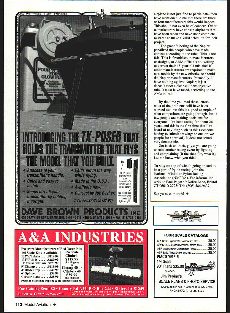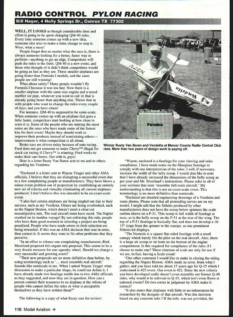 RADIO CONTROL PYLON RACING U IIEE WELL IT LOOKS though considerable time effort going spent changing QM-40 rules time someone comes up new idea someone else tries make rules change stop Wow what mess People forget no matter what race always someone looking better faster way performanything get edge Competitors will push rules limit QM-40 new event thought didnt think competitors would going fast smaller airplanes going faster Formula models same people still winning What about safety people wouldnt fly Formula because too fast Now smaller airplane same size engine tuned muffler pipe whatever want call already going faster anything else Throw people want change rules couple days have chaos instance QM-40 supposed same-scale someone comes up airplane goes little faster competitors start looking close scale Some people making noise ones have made some fastest kits event Maybe should work improve products instead scrutinizing others improvement what competition about Better cars driven today because auto racing Ford does get someone make ChevyTM illegal stock car racing ChevyrM winning Ford works make cars better Get guys letter Rusty Van Baren sent to others regarding Vendetta Enclosed letter sent Wayne Yeager other AMA officials believe disrupting successful event due few complaining people manufacturers have blown minor event problem out proportion establishing entirely new set criteria virtually eliminating current airplanes produced dont believe intended exact-scale event also feel certain airplanes being singled out due success such Vendetta Others being overlooked such Napier Heston doesnt meet clear-cut nonsubjective rule real aircraft must have raced Napier crashed its maiden voyage enforcing rule people have done good research selecting project being penalized People have made errors selection being rewarded AMA decision error correct seems want fix other problems perceive effort silence complaining manufacturer Rick Moorland proposed urgent rule proposal seems very drastic measure squeaky wheel Should change very successful growing event new proposals no definitive before using terminology such . must resemble real aircraft Sounds like semiscale asked Wayne Yeager what dimension make particular shape could define have already made two fuselage molds due two AMA officials suggested now question can person commit resources airplane whims people cannot define rules what acceptable themselves have written following copy what Rusty sent review Wayne enclosed fuselage viewing rules compliance have made notes fiberglass fuselage comply interpretation rules will necessary increase width belly scoop would also like note have already increased dimensions belly scoop per Mr Moorlands instructions Please refer sections state resemble full-scale aircraft understanding exact-scale event terminology no definitive semiscale Enclosed detailed engineering drawings Vendetta some photos Please note protruding curves model might add Stiletto produced other manufacturers does have scoop below spinners scale outline shows P-5 1 scoop full width fuselage nose belly scoop P-5 1 rear wing top P-Si fuselage basically flat does develop 10150 slope spinner canopy prominent Stiletto kit displays Nemesis square flat-sided fuselage small canopy barely fits pilot real aircraft Also large air scoop air hom bottom engine compartment required compliance rules choose make citations scale use fact having Scale event other comment would like make closing ruling regarding Napier Heston AMA made error what gather have told about 15 years ago Q-15 understand 425 event event 422 Since new criteria have developed really doesnt resemble former Q-40 rules would relevant Q-15 isnt flown national events two errors judgment AMA make correct also states airplanes little no information researched designer aircraft decision based concrete info info provided 110 Modei Aviation 4Winner Rusty Van Baren Vendetta Mercer County Radio Central Club race two years design work paying off airplane justified participate have mentioned three four manufacturers would impact should concern Other manufacturers have chosen airplanes have raced have done complete research make valid selection project grandfathering Napier penalized people have made choices according rules fair favoritism manufacturers designs AMA officials willing correct 15-year-old mistake other manufacturers required make new molds new criteria should Napier manufacturers Personally have nothing against Napier just doesnt meet clear-cut nonsubjective rule must have raced according AMA rules time read letters problems will have worked out good example what competitors going through Just few people making decisions everyone Ive racing about 26 years first time Ive heard anything such someone having submit drawings two people approval does sound very democratic Get back track guys going ruin another racing event fighting complaining shoe fits wear Let know what think stay top whats going part Pylon racing join National Miniature Pylon Racing Association NMPRA information write Paul Page 49 Debra Lane Bristol CT 06010-2725 Tel 806 584-9437 See ya next month Model Aviation SCALE CATALOGS SPPSl6oSupeieConsinicbonPlms$5 00 SPPS 12000 Doajrnentation Photos 3Vs$5 00 ASP MocAiiaftConstnjdion Plans$5 00 ASP SmJeAmit Drawings 3Vs $500 WACO YMF-5 1/4 Scale 90 Plans $3500 Visa/MG Jim Pepinos SCALE PLANS & PHOTO SER VICE 3209 Madison Ave Greensboro NC 27403 PHONE/FAX 910 292-5239