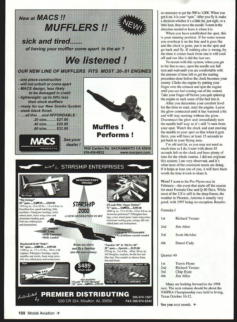 RADIO CONTROL PYLON RACING U i-I IE BOY THIS season went fast lost some good friends yearHubert Wills Texas Matt Smith Monty Moncrief John Brodbeck K&B remember John helping get K&B engine running Oshkosh Nationals seems though always around orange K&B truck help out racers latest loss friend friend Pylon RacingJim Shinohara Following write-up Dave Shadel presented High Pefornance NMPRA National Miniature Pylon Racing Association newsletter pretty well covers Pylon Racings greatest advocate supporter gone passed away October 6 Sumperk Czech Republic nearly two months after very serious heart attack participating F3D World Championships Jimmie guy never expected leave us always eternal teenager full mischief blessed great sense humor always expected would around forever outliving us Jimmies contributions Pylon racing quite well known kindness generosity afforded people chance race otherwise would have able built over 500 racing aircraft twenty plus years friendship gladly given racing enthusiasts worldwide wish recipients go out win races Winning what Jimmie like best though some races absolute disasters took challenge better next time Win lose Jimmie always fun winning icing cake pleasure knowing him indeed fortunate about unique could possibly described meet once lifetime Although Jimmie no longer us person long Pylon Racing flown spirit will never die Until meet again friend miss you can know Thanks Dave people will missed first part 1997 talked Rob Kurek ModelAviation about finding someone else column have writing 18 years growing machine shop business just enough time continue good job So decided start looking someone else continue colunm until replacement foundthat has changedbut have missed few articles Im sony didnt know would missed through E-mail letters phone calls people contests asking what happened realize does AMA Pylon column important part ModelAviation thought might good ask guest columns interested until find someone think will job person should open-minded aspects racing know Ive slanted toward Formula think Ive fair other events think person should member NMPRA since its Special Interest Group has large say what happens Pylon Racing thats happens columnist must have writing skills wouldnt hurt know use camera person needs avid competitor hope whoever get will have some new ideas will help out try include building painting flying engine tips come out NMPRA newsletter things people like know about what going around country columnist just writing Pylon racers probably about 125000 other people out read magazine people think need get Some have expressed concerns AMA interested Pylon Racing doesnt care column true Racing such important part modeling will always Pylon Racing column Quarter 40 really taking off expect see about event future issues tip Darrol Cady published NMPRA newsletter different pinch used Q-40s used Quickie SOOs Q-40 needle needle up until just comes pipe still 1500 rpm below peak needling goal pinch quickiy goes peak immediately drops back 500-1000 rpm touching anything get optimum setting needle pinch turn needle -turn increments until you should doesnt drop back open needle -turn carefully put finger thumb over part venturi cool engine repeat times March 1998 99 Gail Jake Jacobson watches clock gets ready fire up 0-40 model February Pro Flyers race Vein Smith NMPRA President holding plenty action 1997 Pro Flyers race Phoenix Arizona Quarter 40 models held up pylon workers identification necessary get 500 1000 get set spot After fly make decision whether its little fat just right liffle lean move needle YI-tum direction needed leave have established spot running position some reason overheat line goes flat clock gone put spot go hack fly nothing else wrong time comes back will cool off run like did last run restart system get line race open needle full turn wait until comfortable amount time left get starting procedure done before clock becomes enemy Choke engine putting finger over exhaust spin engine until see fuel coming out venturi Take finger off before quit spinning engine suck some fuel After determine comfort level time start start engine Leave glow connected until has warmed bit will stay running glow Disconnect glow immediately turn needle half way its still /2-turn spot Watch clock start moving needle spot gets will have least 15 seconds get back flying area Im old fat may need much time I start about 45 seconds left clock have plenty time whole routine did originate system am very observant its what consistent racers doing helps least will have worth time took share Wow went Pro Ryers race Februarythe event starts off season Formula Q-40 fliers US still deep freeze weather Phoenix Arizona usually very good 1997 being no exception Results Formula 1stRichard Verano 2ndJim Allen 3rdScott McAfee 4thDarrol Cady Quarter 40 stTravis Flynn 2ndRichard Verano 3rdChip Hyde 4thJim Allen looking forward 1998 race next column should about NMPRA Championship race held Irving Texas October 10-12 See next month Model Aviation