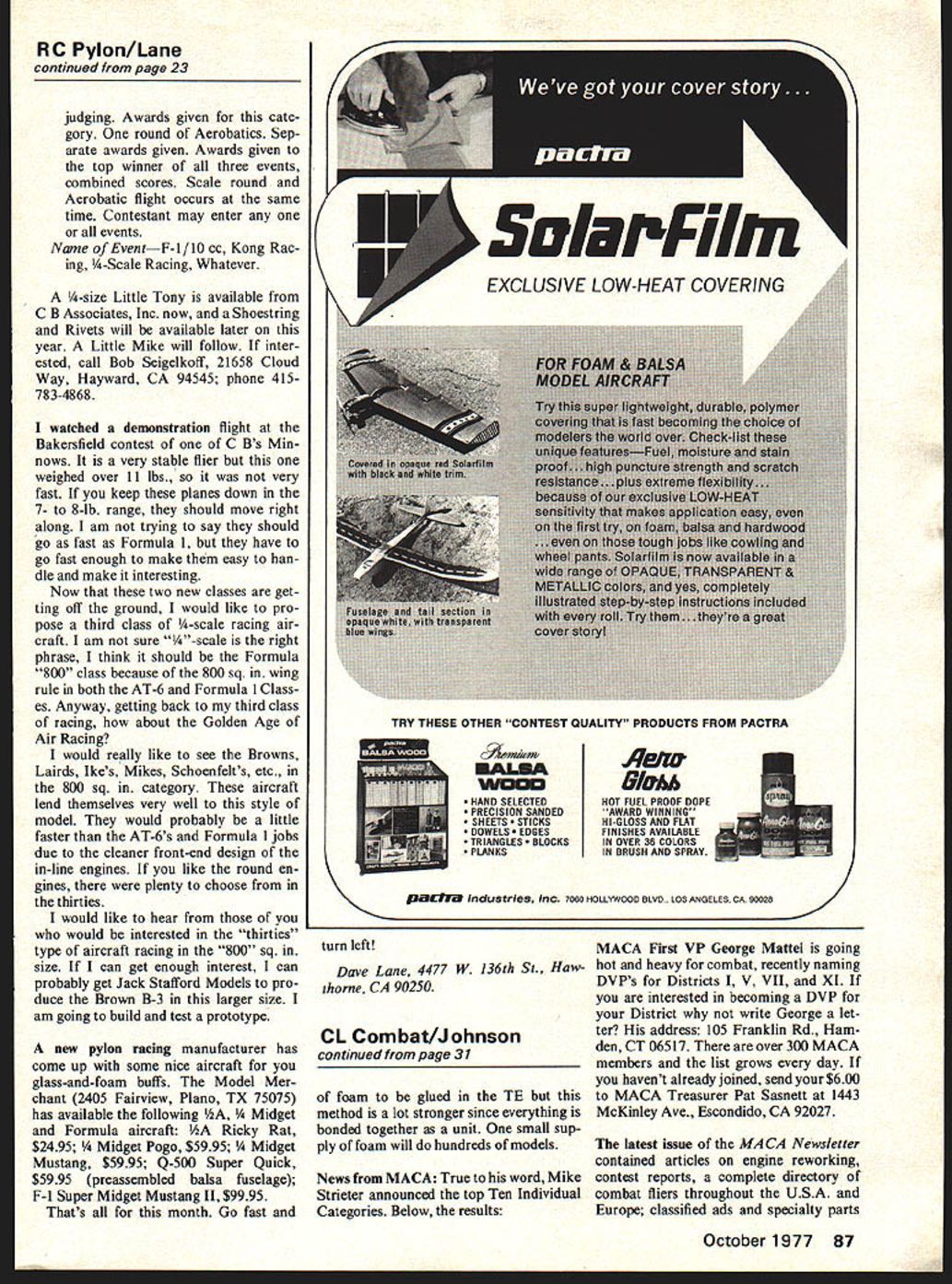 a Pylon Racing EJ Dave Lane AS MOST know now l/4 scale racing event beginning take hold California Southern Cali fornia Scale Squadron established racing event AT-6 Class provision al rules now follows I Static JudgingAMA Sport Scale Rules II Sport Scale Flying 1 Unassisted ROG 2 Figure Eight 3 Fly Past 4 Option 5 Option 6 Option 7 Option 8 Option 9 Traf fic Pattern 10 Landing Perfection III Pylon Heats 1 First starting positions will de termined highest static points 2 Winners Pylon Heats will awarded 1st Placel00 points 2nd Place 90 points 3rd Place80 points 4th Place70 points 5th Place 60 points 3 Race Course will Quarter Midget Course 4 First through fifth place overall will determined highest com bined points three events IV Airplane General 1 Bridi AT-6 stock 2 K&B 61 non-Schnuerle no pump Perry porting 3 Senaco muffler db limits must met Slimline no db limits 4 Landing Gear retracts builders option 5 Minimum weight 825 lbs maxi mum 10 lbs 6 Propellers fuel furnished sponsoring group fuel ex ceed 15%nitro attended Scale Squadron Meetings proposed above rules asked comments fol lowing what suggested feel too much emphasis scale flying part event cause am pro-racing first scale sec ond think scale portion should no requirement full scale AT-6 event qualify pilot AT-6 Races must demonstrate ability fly around pylon course four laps pylon height hori zontal roll falling out sky should required RC event section Airplane probably really stuck foot adamant about fact should manufacturers kit event Joe Bridi agreed feel manufacturer wants build T-6 event should able As long kits meet specs event should allowed same thing goes engine Any non-Schnuerle 61 should allowed lieve rules being changed stated above Another point agree propeller being furnished host ing club think props should stock full scale T-6s think should able run whatever brand prop want long 11 inches minimum diameter believe specs Bridis T-6 72-in wing 800 sq fuselage about 1011 deep cockpit Joes kits will available time read article class being pushed C B Associ ates Hayward Calif rules proposed class follows same basic rules 40powered F- 1 some controls built ensure full-blown speed event does evolve did F-l airplanes will fly roughly pattern speeds fast lap time will about two minutes EnginesFront rotor 10 cc/61 cu maximum displacement Any make homemade FuelSupplied contest sponsor Can low high nitro CarburetorAny AircraftOne-quarter-scale Formula 1 aircraft PressureAny Spinner3 5 00 minimum Weight 7 lb minimum 12 lb maxi mum Wheels4000 diameter 1000 wide tire minimum Wing Thickness2000 center sec tion minimum Wing Area800 square inches Idle RuleNo idle rule such except race must begin stand ing start No holding aircraft per mitted Any type wheel brake permissible CourseStandard Formula 1 cut judges pylon No flagmen No 1 pylon cut judge Aircraft Spec jficationsWidth pi lots position 6000 Height 11000 bottom fuselage top canopy Length 48000 front airplane spinner rudder post Width across cheek cowls 9500 Cheek cowls must same size Mufflers will mandatory ideally should visible db rating over 90 should enforced Suggested ContestStand-off scale uper Miaget Mustang II Formula Another jumbo class racing starting out 49-1/2in wing foam 466 sq California /4-scale Formula designed Ed Rankin rearport 40s October1977 23 Midget Mustang Quarter Midget glass fuselage foam wing Designed rear-port 15s span 40 in. 306 sq Super Quick 0500 racer preassambled balsa fuselage presheeted foam wing shaped tips ailerons Good novice Ricky Rat Half-A plastic fuselage foam wingno painting required span 36 wing area 215 sq Continued page 87 Five new offerings Model Merchant Pogo Quarter Midget glass fuselage foam wing Span 40 in. area 306 sq RC Pylon/Lane continued page 23 judging Awards given cate gory round Aerobatics Sep arate awards given Awards given top winner three events combined scores Scale round Aerobatic flight occurs same time Contestant may enter events Name EventF-l/l0 cc Kong Rac ing -Scale Racing Whatever -size Little Tony available C B Associates Inc now Shoestring Rivets will available later year Little Mike will follow inter ested call Bob Seigelkoff 21658 Cloud Way Hayward CA 94545 phone 415783-4868 watched demonstration flight Bakersfield contest C Bs Min nows very stable flier weighed over 11 lbs very fast keep planes down 7- 8-lb range should move right along am trying say should go fast Formula 1 have go fast enough make easy han dle make interesting Now two new classes get ting off ground would like pro pose third class /4-scale racing air craft am sure "-scale right phrase think should Formula 800 class because 800 sq wing rule both AT-6 Formula 1 Class es Anyway getting back third class racing about Golden Age Air Racing would really like see Browns Lairds Ikes Mikes Schoenfelts etc 800 sq category aircraft lend themselves very well style model would probably little faster AT-6s Formula jobs due cleaner front-end design in-line engines like round en gines plenty choose thirties would like hear would interested thirties type aircraft racing 800 sq size can get enough interest can probably get Jack Stafford Models pro duce Brown B-3 larger size am going build test prototype new pylon racing manufacturer has come up some nice aircraft glass-and-foam buffs Model Mer chant 2405 Fairview PIano TX 75075 has available following et Formula aircraft Ricky Rat $2495 et Pogo $5995 et Mustang $5995 Q-500 Super Quick $5995 preassembled balsa fuselage F-l Super Midget Mustang II $9995 Thats month Go fast turn left Dave Lane 4477 W 136th St thorne CA 90250 CL Combat/Johnson continued page 31 foam glued TE method lot stronger since everything bonded together unit small sup ply foam will hundreds models News MACA True word Mike Stricter announced top Ten Individual Categories Below results MACA First VP George Mattel going Haw- hot heavy combat recently naming DVPs Districts V VII XI interested becoming DVP District write George let ter a