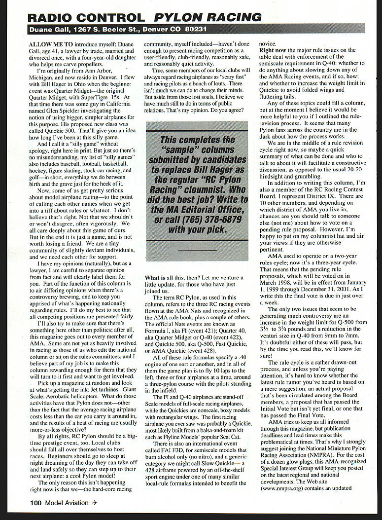 RADIO CONTROL PYLON RACING ALLOW ME TO introduce myself Duane Gall age 41 lawyer trade married divorced once four-year-old daughter helps carve propellers Im originally Ann Arbor Michigan now reside Denver flew Bill Hager Ohio beginner event Quarter Midgetthe original Quarter Midget Superigre 15s time some guy California named Glen Spickler investigating notion using bigger simpler airplanes purpose proposed new class called Quickie 500 Thatll give idea long Ive silly game call silly game apology right print just theres no misunderstanding list silly games also includes baseball football basketball hockey figure skating stock-car racing golfin short everything between birth grave just heck Now some us get pretty serious about model airplane racingto point calling other names get tiff about rules whatnot dont believe thats right shouldnt wont disagree often vigorously care deeply about game end just game worth losing friend tiny community slightly deviant individuals need other support have opinions naturally lawyer am careful separate opinion fact will clearly label Part function column air differing opinions theres controversy brewing keep apprised whats happening nationally regarding rules Ill best see competing positions presented fairly Ill also try make sure theres something other politics after magazine goes out member AMA Some yet heavily involved racing us edit national column sit rules committees believe part job make column rewarding enough will turn first want get involved Pick up magazine random look whats getting ink Jet turbines Giant Scale Aerobatic helicopters What activities have Pylon does notother fact average racing airplane costs less car carry around results heat racing usually more-or-less objective rights RC Pylon should bigtime prestige event too Local clubs should fall over themselves host races Beginners should go sleep night dreaming day can take off land safely can step up next airplane cool Pylon model reason isnt happening right now wethe hard-core racing community myself includedhavent done enough present racing competition user-friendly club-friendly reasonably safe reasonably quiet activity True some members local clubs will always regard racing airplanes scary fast racing pilots bunch louts isnt much can change minds aside lost souls believe have much still terms public relations Thats opinion agree What Let venture little update have just joined us term RC Pylon used column refers three RC racing events flown AMA Nats recognized AMA rule book plus couple others official Nats events known Formula aka Fl event 421 Quarter 40 aka Quarter Midget Q-40 event 422 Quickie 500 aka Q-500 Fast Quickie AMA Quickie event 428 rule formulas specify 40 engine sort another game plan fly 10 laps left three four airplanes time around three-pylon course pilots standing infield H Q-40 airplanes stand-off Scale models full-scale racing airplanes Quickies nonscale boxy models rectangular wings first racing airplane ever saw probably Quickie likely built balsa-and-foam kit such Flyline Models popular Scat Cat also international event called FAI F3D semiscale models hum alcohol no nitro generic category might call Slow Quickie 428 airframe powered off-the-shelf sport engine under similar local-rule formulas intended benefit novice Right now major rule issues table deal enforcement semiscale requirement Q-40 whether anything about slowing down AMA Racing events whether increase weight limit Quickie avoid folded wings fluttering tails Any topics could fill column moment believe would helpful outlined rulerevision process seems Pylon fans across country dark about process works middle rule revision cycle right now maybe quick summary what can done talk about will facilitate constructive discussion opposed usual 20-20 hindsight grumbling addition writing column Im also member RC Racing Contest Board represent District IX 10 other members depending district AMA live chances should talk someone else about vote pending rule proposal However Im happy put columnist hat air views otherwise pertinent AMA used operate two-year rules cycle now its three-year cycle means pending rule proposals will voted March 1998 will effect January 1 1999 through December 31 2001 As write final vote due just over week two issues seem generating much controversy increase weight limit Q-500 3 /2 3 pounds reduction venturi size Q-40 9mm 7mm Its doubtful either will pass time read well know sure rule cycle rather drawn-out process unless youre paying attention its hard know whether latest rule rumor youve heard based mere suggestion actual proposal thats circulated among Board members proposal has passed Initial Vote isnt yet final has passed Final Vote AMA tries keep us informed through magazine publication deadlines lead times make problematical times Thats strongly suggest joining National Miniature Pylon Racing Association NMPRA cost dozen glow plugs AMA-recognized Special Interest Group will keep posted latest regional national developments Web site wwwnmpraorg contains updated 100 Model Aviation ion rules among other things newsletter requires less lead time magazine important thing Id like convey right now about AMA rule process takes least two 2 votes anything become official happens proposal same subjectas case last cycle three alternative numbers submitted handle smaller venturi issue Q-40they grouped initial ballot Board asked choose should go final ballot survives initial vote doesnt necessarily mean majority Board supports instead could think simply lesser two evils source of rumor speculation controversy little world Emergency Proposals can come up time regardless regular rule cycle ostensibly limited safety-related issuesalthough racing could argue just about anything safety-related Since advent three-year regular rule cycle weve rely Emergency Proposals would otherwise have case Hence theres less opportunity discussion less chance get word out ahead time FUD Fear Uncertainty Doubt about what 