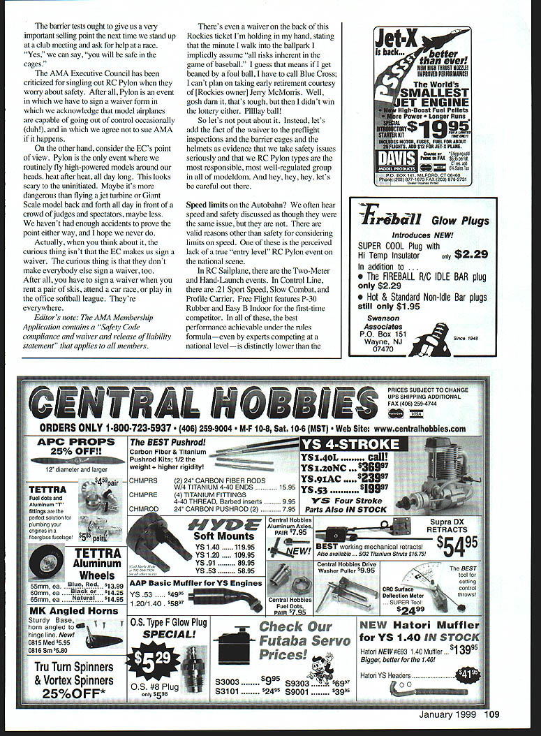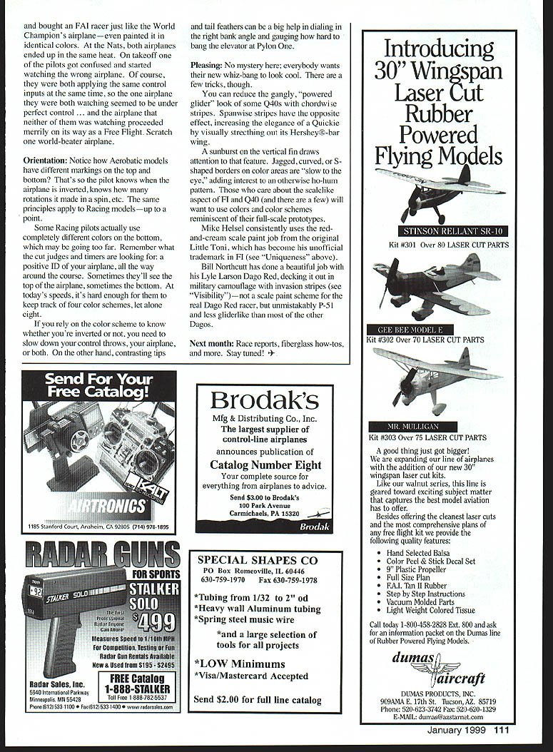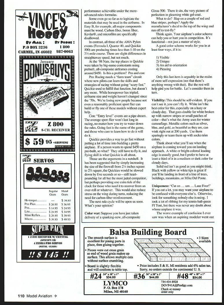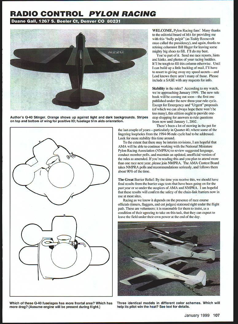 RADIO CONTROL PYLON RACING m- u WELCOME Pylon Racing fans thanks editorial board MA providing bully pulpit Teddy Roosevelt once called presidency again thanks retiring columnist Bill Hager leaving some mighty big shoes fill Ill best Youre part Send race reports hints kinks photos racing buddies Itll tough fill column otherwise Until can build up liffle backlog mail Ill have resort giving away speed secretsand Lord knows arent Please include SASE requests info Stability rules According watch approaching Januaiy 1999 new rule book will coming out soonthe first published under new three-year rule cycle Except Emergency Urgent proposals can always hope wont too edition ought provide stop shopping answers rule questions now until January 12002 Theres lot stewing pot last couple yearsparticularly Quarter 40 some lingering loopholes 1994-96 rule cycle addressed Look stability time around extent may interim revisions am hopeful AIVIA will able continue working National Miniature Pylon Racing Association NMPRA review suggested language conduct member polls maintain updated unofficial version rules amended youre reading plan attend race next year please join NMPRA AMA Contest Board takes NMPRA polls recommendations seriously follows about 90% time Great Barrier Relief time receive should have final results barrier cage tests have going past year under auspices AMA NMPRA lam hopeful results will confirm safety chain-link barriers now use sites Racing know depends presence race course officials timers flaggers cut judges stationed right under flight path volunteers reasonable insist condition agreeing take task can expect leave field under own power end day Which 0-40 fuselages has frontal area Which has Three identical models different color schemes Which will drag Assume engine will present during flight help its pilot win heat See text details January1999 107 Authors 0-40 Stinger Orange shows up against light dark backgrounds Stripes top bottom wing positive ID fuselage trim aids orientation banier tests ought give us very important selling point next time stand up club meeting ask help race Yes can say will safe cages AMA Executive Council has criticized singling out RC Pylon worry about safety After Pylon event have sign waiver form acknowledge model airplanes capable going out control occasionally dub agree sue AMA happens other hand consider ECs point view Pylon event routinely fly high-powered models around heads heat after heat day long looks scary uninitiated Maybe its dangerous flying jet turbine Giant Scale model back forth day front crowd ofjudges spectators maybe less havent enough accidents prove point either way hope never Actually think about curious thing isnt EC makes us sign waiver curious thing dont make everybody else sign waiver too After have sign waiver rent pair skis attend car race play office softball league Theyre everywhere Editors note AMA Membership Application contains Safety Code compliance waiver release liability statement applies members Theres waiver back Rockies ticket Im holding hand stating minute walk ballpark impliedly assume risks inherent game baseball guess means get beaned foul ball have call Blue Cross cant plan taking early retirement courtesy [Rockies owner] Jerry McMonis Well gosh dam thats tough didnt win lottery either PIlIlay ball So lets pout about Instead lets add fact waiver preflight inspections barrier cages helmets evidence take safety issues seriously RC Pylon types responsible well-regulated group modeldom hey hey hey lets careful out Speed limits Autobahn often hear speed safety discussed though same issue valid reasons other safety considering limits speed perceived lack true entry level RC Pylon event national scene RC Sailplane Two-Meter Hand-Launch events Control Line 21 Sport Speed Slow Combat Profile Carrier Free Right features P-30 Rubber Easy B Indoor first-time competitor best performance achievable under rules formulaeven experts competing national level inctly lower TFAIbaI1 Glow Plugs Introduces NEW SUPER COOL Plug Hi Temp Insulator $229 addition FIREBALL RC IDLE BAR plug $229 Hot & Standard Non-Idle Bar plugs still $195 Swanson Associates PO Box 151 Si,ce 1546 Wayne NJ 07470 Halori NEW #693 140 Muffler . Bigger better 140 dctl lUcti y JetX back.better ever EEWUIA NHUI EULEI IMNIIVIB PEKFIIRMANCEI Worlds High-Boost Fuel Pellets re Power er Runs IS MOTOR FUSES FU FOR ABORT UGHTS ASS $12 FE JET-S PlANE OmmanShi ngadd Pp BOX 141 MILFORO cr56460 P5096 2731 ORDERS ONLY 18007235937 2599004 08 Sat 106 MST Site wwwcentralhobbiescom APC PROPS BEST Pushrod 25% OFF! Carbon Fiber & Titanium Pushrod Kits 1/2 weight er rigidity 2 24 CARBON FIBER RODS W/4 TITANIUM 4-40 ENDS 1595 4 TITANIUM FITTINGS 4-40 THREAD Barbed inserts 95 24 CARBON PUSHROD 2 795 ea 1399 eaBlack a1425 Natural 1495 Angled Horns rdy Base orn angled inge line New 8lSMed595 816 Sm p580 Tru Turn Spinners & Vortex Spinners 9IO/fl FF* JOJLLI IUtflMflIJL ,o onr~lNG ADDITIONAL FAX 406 259-4744 YS 140L YS12oNC YS 9IAC 1S 53 V Four Stroke Parts Also IN STOCK YE Central Hobbies Aluminum Axles Soft MountsPAIR 5795RETRACT $54 YS 14011995BEST working mechanica et acts YS 12010995A/so available . 5/32 Titanium St uts $16 75 YS918995--VS 535895 Check ba Servo Prices S3003 95 S9303 S3101 S9001$3995 AAP Basic Muftier YS Engines YS 53 999 ________________ 120/140 BEST tool/or selling Surfacecontrol lellection Meter ws SUPER Tool 24 NEW Hatori Mufflei YS 140 IN ST Hatorl YS Header INCj evPnen PO BOX 32361 800 CARMEL IN 46082 987-0063 SERVOS Regular Metal GearsGears Hi-torque$ 3995 Pro Plus$ 2695$ 3695 Pro$ 1495$ 2495 Lite$ 2495$ 3495 Mini Reflex$2995$ 3995 Micro$3995$4995 tSPFIfl EDRA PRO SERVOS 4NItrAL GEARS 110 Model Aviation ormance achievable under moreadvanced rules formulas Some go far legislate materials may used airframe Easy B example major components must wood Carbon fiber boron fiber Keviar microfilm specifically disallowed contrast three AMA Pylon events Formula Quarter 40 Quic