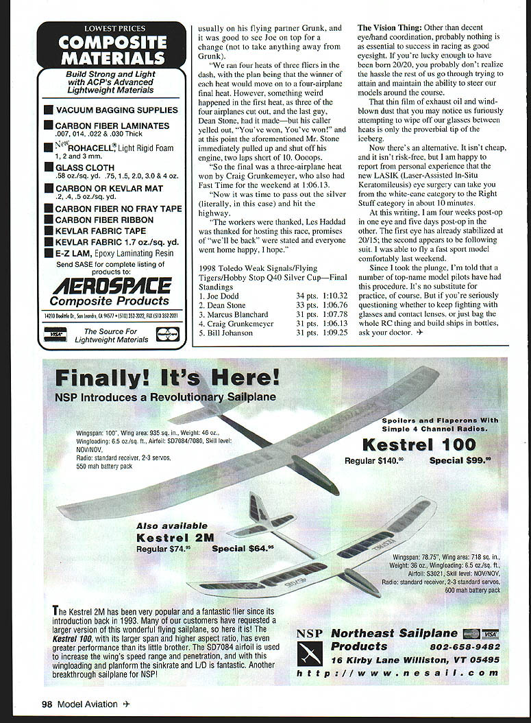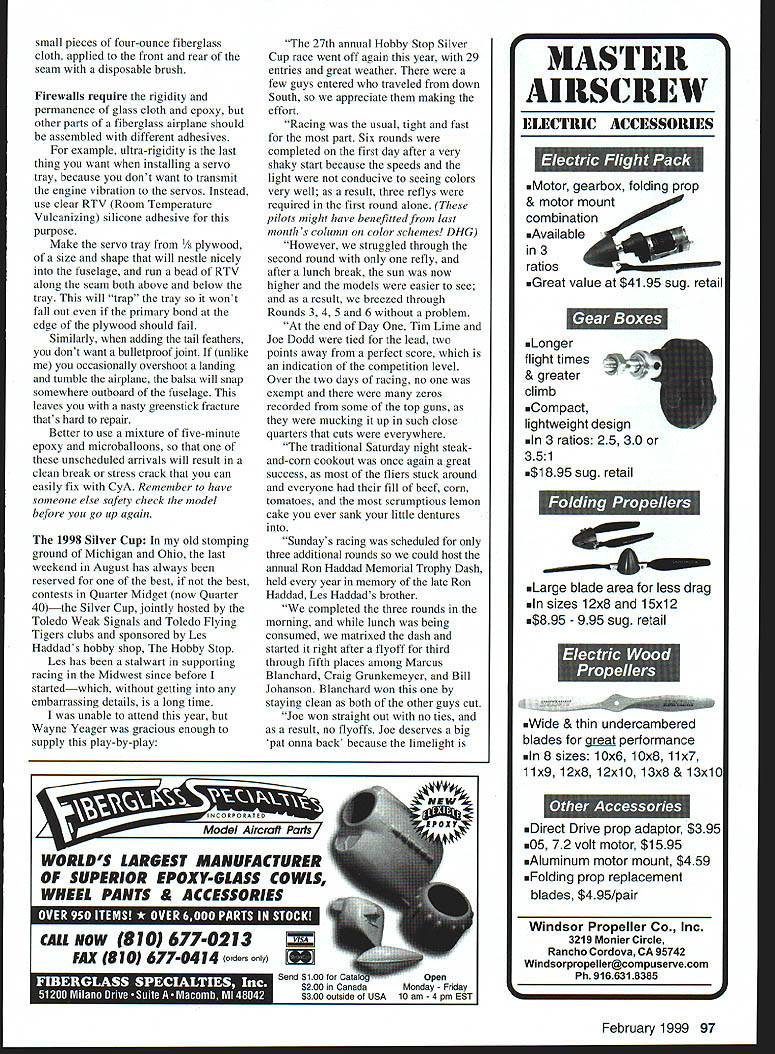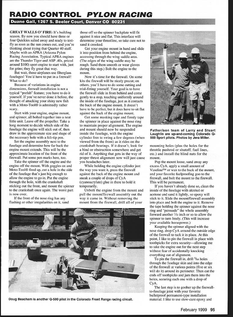 RADIO CONTROL PYLON RACING U IIFImr-UF1I in4v~ r31 r1a1 Iii - T WALLS 0 FIRE Its building season now should have three four Quickies salted away ready testfly soon sun comes out youre thinking about trying Quarter 40 stuff Maybe APRA Arizona Pylon Racing Association Typical APRA engines Thunder Tiger ASP 40s priced around $100 sport engine start just grins fly great way wait airplanes use fiberglass fuselages Youd have put firewall What Because variations engine dimensions firewall installation typical prefab feature have yourself youve never done before thought attacking shiny new fish Moto-Tool admittedly rather scary Start engine engine mount spinner bolted together neat little unit Leave off propeller Take long moment decide side fuselage engine will stick out draw approximate size shape necessary hole felt-tip pen Set engine assembly next fuselage determine far back engine mount extends will approximate location front firewall Put some pen marks too Take spinner off engine engine off mount goggles Moto-Tool fired up cut hole side fuselage thats just big enough allow engine go Put engine through hole crankshaft sticking out front mount spinner crankshaft once again worst part now over front nose ring has flashing other irregularities sand off spinner backplate will fit against nice flat interface will determine thrustline take care sand crooked Get engine mount hand slide position behind engine accessing through wing saddle area edges wing saddle may rough Sand smooth wear gloves during step Bolt engine mount Now its time firewall some kits firewall will nicely precut others youll have some cutting trial-fitting yourself goal have firewall slide behind come gently stop touching uniformly around inside fuselage just contacts back engine mount doesnt have perfect does have sit flat against back engine mount Get some masking tape firmly tape spinner place against nose ring maintain proper alignment engine mount should now suspended inside fuselage engine cylinder free swing few degrees viewed front rides crankshaft bearings doesnt look bind obstruction somewhere get rid Anything gets way proper thrust alignment now will just cause headaches later holding engine cylinder just way want press firewall against back engine mount sneak couple drops CyA cyanoacrylate glue hold temporarily Unbolt engine mount pull mount/firewall assembly out way came Without removing mount firewall drill mounting holes plus holes throttle pushrod shutoff fuel lines etc install blind nuts mount Pop mount loose sand away excess CyA apply small amount VaselineTM wax back mount favorite fuelproofing goo firewall bolt mount firewall will permanent havent already done clean inside fuselage alcohol acetone sand lightly epoxy will stick Slide mountlfirewall assembly place bolt engine Remove tape holding spinner against nose ring persuade whole assembly forward another 1h2 inch allow spinner turn freely will increase available horsepower Keeping spinner aligned nose ring drop CyA around outside edge firewall tack place point like pin firewall place toothpicks extra securityallowing take engine out next step fear accidentally knocking everything out alignment pin firewall drill I64 holes through fuselage skin edge firewall various points five six will around its perimeter cut ends off toothpicks jam holes securing drop CyA last step goober up firewallto-fuselage joint favorite bulletproof permanent-type installation material like use slow-cure epoxy February 1999 95 Father/son team Larry Stuart Laughlin up-and-coming Colorado 0500 Sport pilots Photos Jera Miller Doug Beacham another 0-500 pilot Colorado Front Range racing circuit small pieces four-ounce fiberglass cloth applied front rear seam disposable brush Firewalls require rigidity permanence glass cloth epoxy other parts fiberglass airplane should assembled different adhesives example ultra-rigidity last thing want installing servo tray because dont want transmit engine vibration servos Instead use clear RTV Room Temperature Vulcanizing silicone adhesive purpose Make servo tray /8 plywood size shape will nestle nicely fuselage run bead RTV along seam both above below tray will trap tray wont fall out primary bond edge plywood should fail Similarly adding tail feathers dont want bulletproof joint unlike occasionally overshoot landing tumble airplane balsa will snap somewhere outboard fuselage leaves nasty greenstick fracture thats hard repair Better use mixture five-minute epoxy microballoons unscheduled arrivals will result clean break stress crack can easily fix CyA Remember have someone else safety check model before go up again 1998 Silver Cup old stomping ground Michigan Ohio last weekend August has always reserved best best contests Quarter Midget now Quarter 40the Silver Cup jointly hosted Toledo Weak Signals Toledo Flying Tigers clubs sponsored Les Haddads hobby shop Hobby Stop Les has stalwart supporting racing Midwest since before startedwhich getting embarrassing details long time unable attend year Wayne Yeager gracious enough supply play-by-play 27th annual Hobby Stop Silver Cup race went off again year 29 entries great weather few guys entered traveled down South appreciate making effort Racing usual tight fast part Six rounds completed first day after very shaky start because speeds light conducive seeing colors very well result three reflys required first round alone pilots might have benefitted last months column color schemes DHG However struggled through second round refly after lunch break sun now higher models easier see result breezed through Rounds 3 4 5 6 problem end Day Tim Lime Joe Dodd tied lead two points away perfect score indication competition level Over two days racing no exempt zeros recorded some top guns mucking up such close quarters cuts everywhere traditional Saturday night steakand-corn cookout once again great success fliers stuck around everyone fill beef corn tomatoes scrumptious lemon cake ever sank little dentures Sundays 