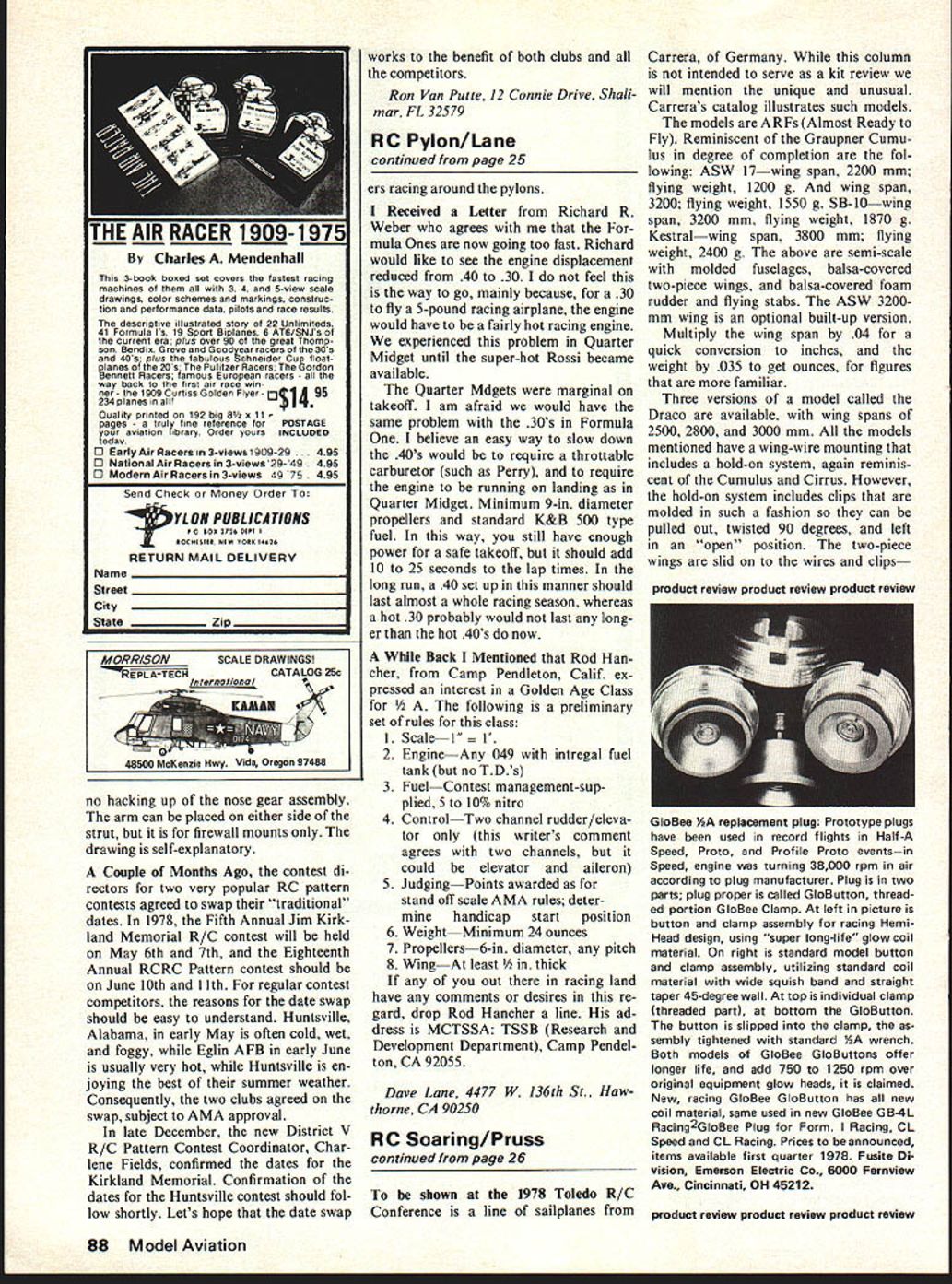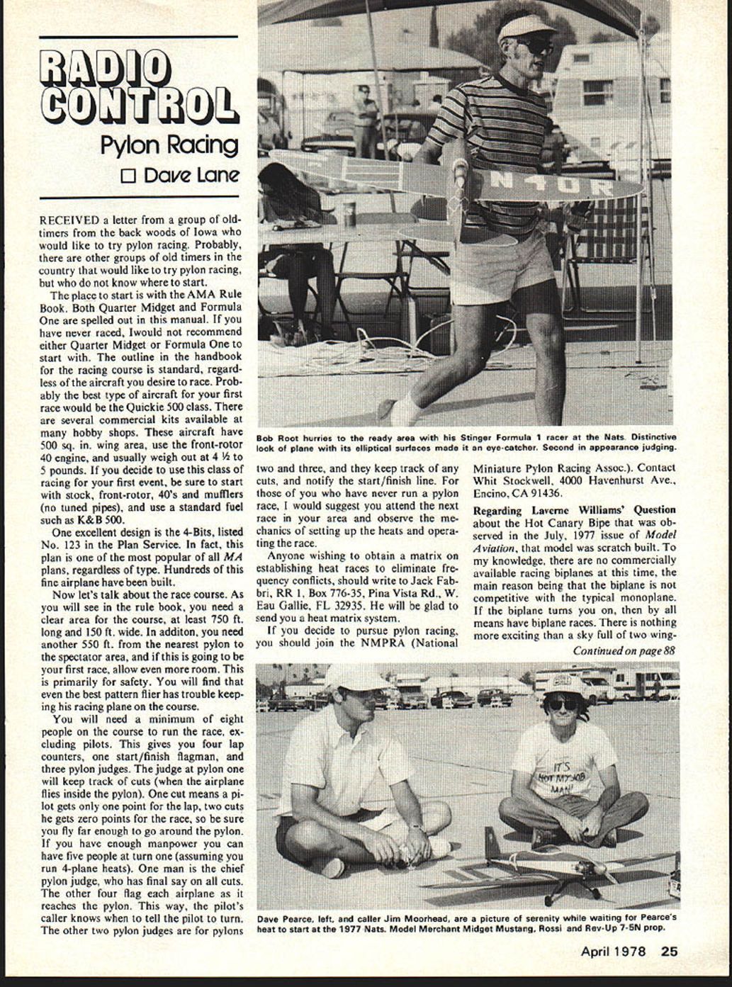 U Pylon Racing F] Dave Lane RECEIVED letter group oldtimers back woods Iowa would like try pylon racing Probably other groups old timers country would like try pylon racing know start place start AMA Rule Book Both Quarter Midget Formula spelled out manual have never raced Iwould recommend either Quarter Midget Formula start outline handbook racing course standard regard less aircraft desire race Prob ably best type aircraft first race would Quickie 500 class several commercial kits available hobby shops aircraft have 500 sq wing area use front-rotor 40 engine usually weigh out 4 unds decide use class racing first event sure start stock front-rotor 40s mufflers no tuned pipes use standard fuel such K&B 500 excellent design 4-Bits listed No 123 Plan Service fact plan popular MA plans regardless type Hundreds fine airplane have built Now lets talk about race course As will see rule book need clear area course least 750 ft long 150 ft wide additon need another 550 ft nearest pylon spectator area going first race allow room primarily safety will find best pattern flier has trouble keep ing racing plane course will need minimum eight people course run race ex cluding pilots gives four lap counters start/finish flagman three pylon judges judge pylon will keep track cuts airplane flies inside pylon cut means pi lot gets point lap two cuts gets zero points race sure fly far enough go around pylon have enough manpower can have five people turn assuming run 4-plane heats man chief pylon judge has final say cuts other four flag airplane reaches pylon way pilots caller knows tell pilot turn other two pylon judges pylons two three keep track cuts notify start/finish line have never run pylon race would suggest attend next race area observe chanics setting up heats opera ting race Anyone wishing obtain matrix establishing heat races eliminate fre quency conflicts should write Jack Fab bri RR 1 Box 776-35 Pina Vista Rd W Eau Gallie FL 32935 will glad send heat matrix system decide pursue pylon racing should join NMPRA National Miniature Pylon Racing Assoc Contact Whit Stockwell 4000 Havenhurst Ave Encino CA 91436 Regarding Laverne Williams Question about Hot Canary Bipe ob served July 1977 issue Model Aviation model scratch built knowledge no commercially available racing biplanes time main reason being biplane competitive typical monoplane biplane turns means have biplane races nothing exciting sky full two wingApril1978 25 Bob Root hurries ready area Stinger Formula 1 racer Nats Distinctive look plane its elliptical surfaces made eye-catcher Second appearance judging Continued page 88 Dave Pearce left caller Jim Moorhead picture serenity waiting Pearces heat start 1977 Nats Model Merchant Midget Mustang Rossi Rev-Up 7-5N prop 3-book boxed set covers fastest racing machines 3 4 5-view scale drawings color schemes markings construc tion performance data pilots race results descriptive illustrated story 22 Unlimiteds 41 Formula ls 19 Sport Biplanes 6 AT6/SNJs current era plus over 90 great Thomp son Bendix Greve Goodyear racers 30s 40s plus fabulous Schneider Cu p floaf 20s Pulitzer Racers Gordon en neft Racers lamous European racers way back first air race win ner- 1909 Curtiss Golden Flyer- t1A95 234 planes allIt Quality printed 192 big 8 11 pages truly fine reference POSTAGE 11dlibrary Order yours INCLUDED C Early Air Racers 3-views 1909-29 . 495 o NationalAirRacersin3-views29-49 o ModernAirRacersin3-views 49 75 Send Check Money Order PUBLICATIOIS P0 SOS 2726 SEPT RETURN MAIL DELIVERY Name Street City StateZap no hacking up nose gear assembly arm can placed either side strut firewall mounts drawing self-explanatory Couple Months Ago contest di rectors two very popular RC pattern contests agreed swap traditional dates 1978 Fifth Annual Jim Kirk land Memorial R/C contest will held May 6th 7th Eighteenth Annual RCRC Pattern contest should June 10th 11th regular contest competitors reasons date swap should easy understand Huntsville Alabama early May often cold wet foggy Eglin AFB early June usually very hot Huntsville en joying best summer weather Consequently two clubs agreed swap subject AMA approval late December new District V R/C Pattern Contest Coordinator Char lene Fields confirmed dates Kirkland Memorial Confirmation dates Huntsville contest should fol low shortly Lets hope date swap works benefit both clubs competitors Ron Van Puue 12 Connie Drive Shah mar FL 32579 RC Pylon/Lane continued page 25 ers racing around pylons Received Letter Richard R Weber agrees mula Ones now going too fast Richard would like see engine displacement reduced 40 30 feel way go mainly because 30 fly 5-pound racing airplane engine would have fairly hot racing engine experienced problem Quarter Midget until super-hot Rossi became available Quarter Mdgets marginal takeoff am afraid would have same problem 30s Formula believe easy way slow down 40s would require throttable carburetor such Perry require engine running landing Quarter Midget Minimum 9-in diameter propellers standard K&B 500 type fuel way still have enough power safe takeoff should add 10 25 seconds lap times long run 40 set up manner should last almost whole racing season whereas hot 30 probably would last long er hot 40s now Back Mentioned Rod Han cher Camp Pendleton Calif ex pressed interest Golden Age Class owing preliminary set rules class 1 ScaleI gineAny 049 intregal fuel tank no TDs 3 FuelContest management-sup plied 5 10% nitro 4 ControlTwo channel rudder/eleva tor writers comment agrees two channels could elevator aileron 5 JudgingPoints awarded stand off scale AMA rules deter handicap start position 6 WeightMinimum 24 ounces 7 Propellers6-in diameter pitch 8 WingAt least k out racing land have comments desires re gard drop Rod Hancher line ad dress MCTSSA TSSB Research Development Department Camp Pendel ton CA 92055 Dave Lane 4477 W 136th St Haw thorne CA 90250 RC Soaring/Pruss continued page 26 shown 1978 Toledo R/C Conference line sailplanes Ca