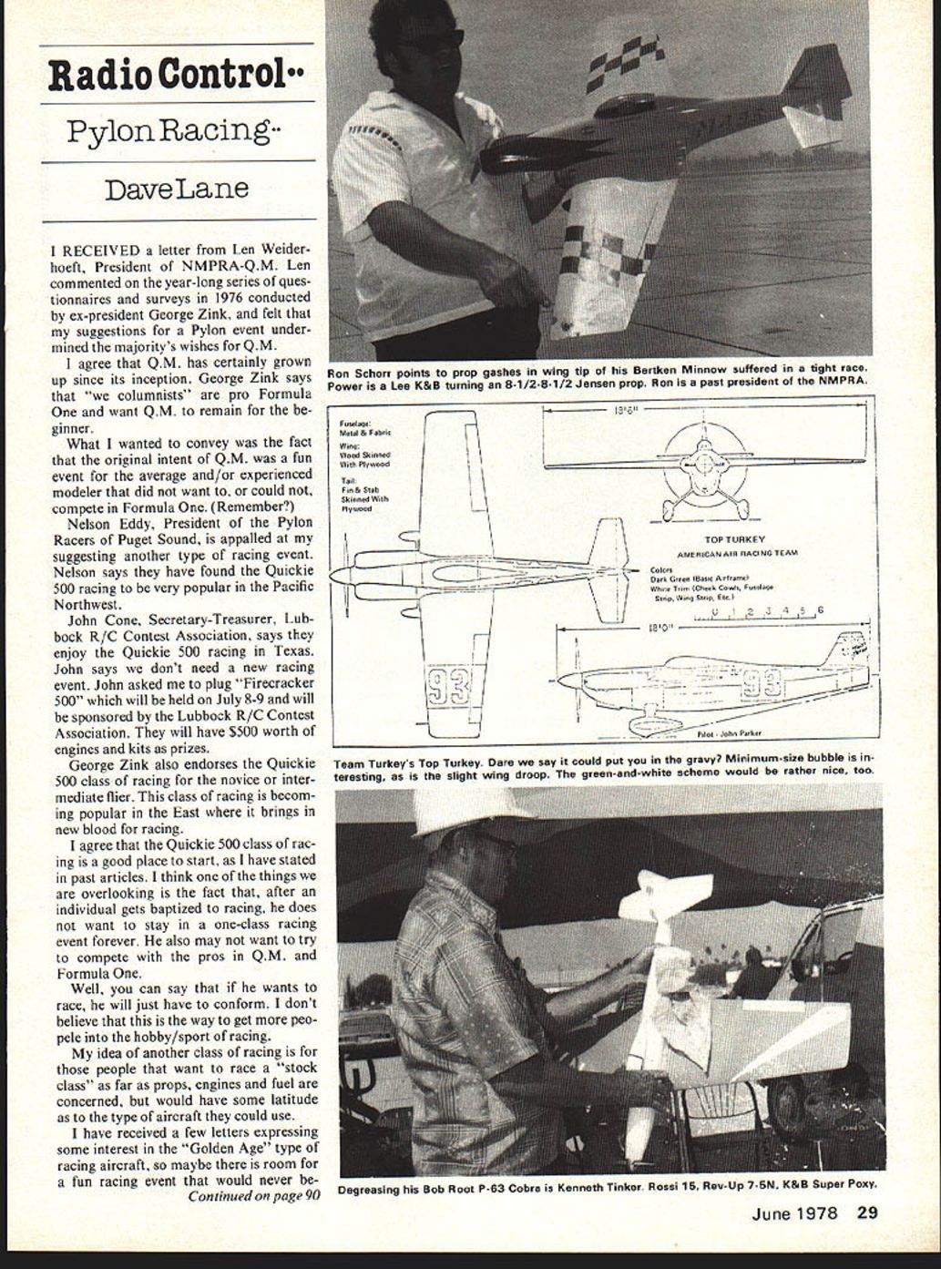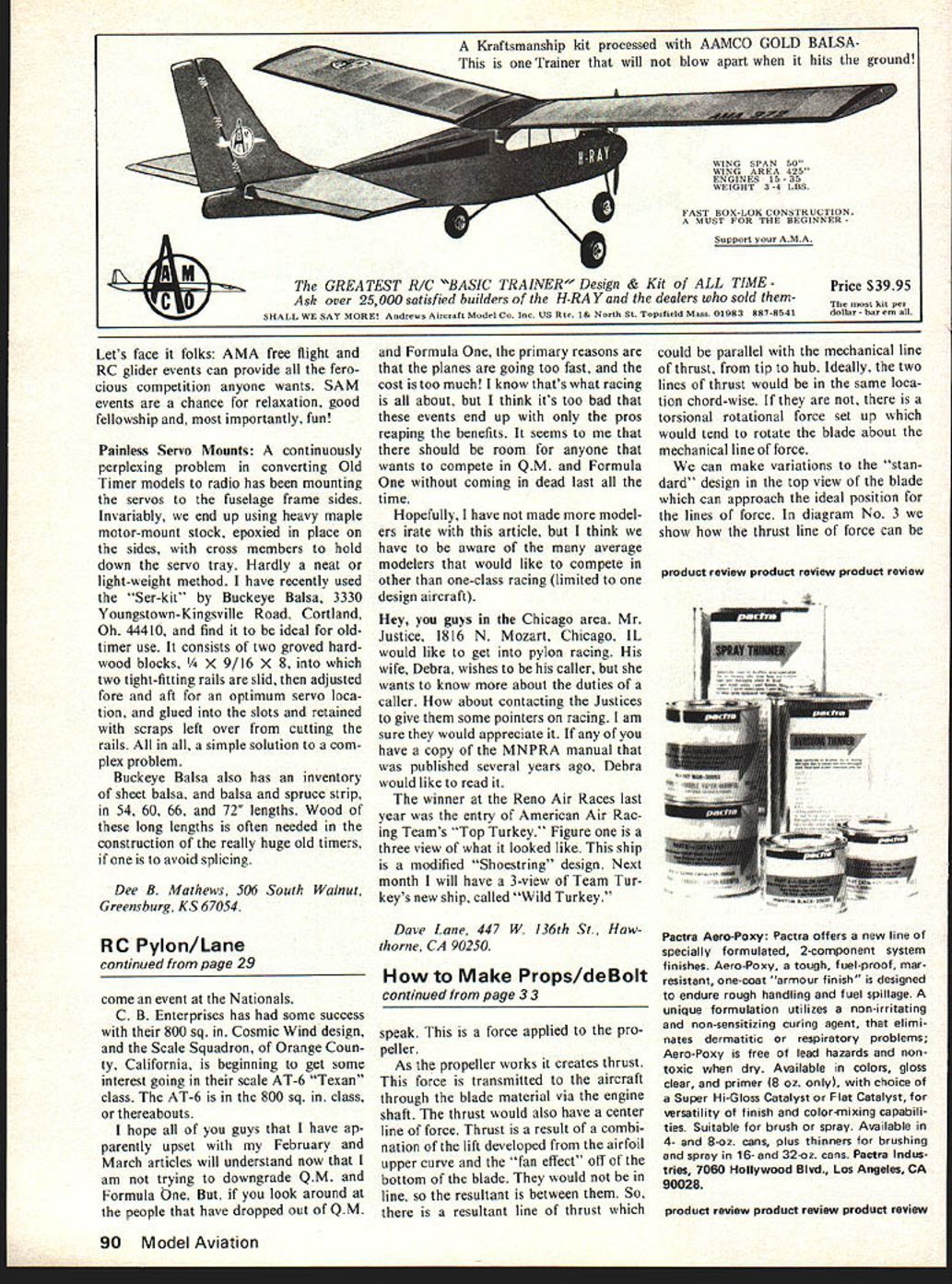 Radio Control Pylon Racing Dave Lane RECEIVED letter Len Weider hoeft President NMPRA-QM Len commented year-long series ques tionnaires surveys 1976 conducted ex-president George Zink felt suggestions Pylon event under mined majoritys wishes QM agree QM has certainly grown up since its inception George Zink says columnists pro Formula want QM remain ginner What wanted convey fact original intent QM fun event average and/or experienced modeler did want could compete Formula Remember Nelson Eddy President Pylon Racers Puget Sound appalled suggesting another type racing event Nelson says have found Quickie 500 racing very popular Pacific Northwest John Cone Secretary-Treasurer Lub bock R/C Contest Association says enjoy Quickie 500 racing Texas John says dont need new racing event John asked plug Firecracker 500 will held July 8-9 will sponsored Lubbock R/C Contest Association will have $500 worth engines kits prizes George Zink also endorses Quickie 500 class racing novice inter mediate flier class racing becom ing popular East brings new blood racing agree Quickie 500 class rac ing good place start have stated past articles think things overlooking fact after individual gets baptized racing does want stay one-class racing event forever also may want try compete pros QM Formula Well can say wants race will just have conform dont believe way get peo pele hobby/sport racing idea another class racing people want race stock class far props engines fuel concerned would have some latitude type aircraft could use have received few letters expressing some interest Golden Age type racing aircraft maybe room fun racing event would never beCon tin ued page 90 36-Fotalage Metal & Fabin Wing WoodSkinned ______________________ PIyenod Tail Fin & Stab Skinned Plyeneed rTC}__ /TOP TURKEY -AMERICAN AIR RACING TEAM - CoIot Deck Gnan Bane A,Ionn Whtn Ton IChnek Co t Foenloge Stnp Wng Stnp Ste 456 80 10 -Th 3 - PrInt John Pocke June 1978 29 Ron Schorr points prop gashes wing tip Bertken Minnow surterea tight race Power Lee K&B turning 81/2-8-1/2 Jensen prop Ron past president NMPRA Team Turkeys Top Turkey Dare say could put gravy Minimum-size bubble teresting slight wing drooo areen-and-white scheme would rather nice too Degreasing Bob Root P-63 Cobra Kenneth Tinker Rossi 15 Rev-Up 7-5N K&B Super Poxy Lets face folks AMA free flight RC glider events can provide fero cious competition anyone wants SAM events chance relaxation good fellowship importantly fun Painless Servo Mounts continuously perplexing problem converting Old Timer models radio has mounting servos fuselage frame sides Invariably end up using heavy maple motor-mount stock epoxied place sides cross members hold down servo tray Hardly neat light-weight method have recently used Ser-kit Buckeye Balsa 3330 Youngstown-Kingsville Road Cortland Oh 44410 find ideal oldtimer use consists two groved hard wood blocks 16 o tight-fitting rails slid adjusted fore aft optimum servo loca tion glued slots retained scraps left over cutting rails simple solution com plex problem Buckeye Balsa also has inventory sheet balsa balsa spruce strip 54 60 66 72 lengths Wood long lengths often needed construction really huge old timers avoid splicing Dee B Mathews 506 South Walnut Greensburg KS 67054 RC Pylon/Lane continued page 29 come event Nationals C B Enterprises has some success 800 sq Cosmic Wind design Scale Squadron Orange Coun ty California beginning get some interest going scale AT-6 Texan class AT-6 800 sq class thereabouts hope guys have ap parently upset February March articles will understand now am trying downgrade QM Formula look around people have dropped out QM Formula primary reasons planes going too fast cost too much know thats what racing about think its too bad events end up pros reaping benefits seems should room anyone wants compete QM Formula coming dead last time Hopefully have made model ers irate article think have aware average modelers would like compete other one-class racing limited design aircraft Hey guys Chicago area Mr Justice 1816 N Mozart Chicago IL would like get pylon racing wife Debra wishes caller wants know about duties caller about contacting Justices give some pointers racing am sure would appreciate have copy MNPRA manual published several years ago Debra would like read winner Reno Air Races last year entry American Air Rac ing Teams Top Turkey Figure three view what looked like ship modified Shoestring design Next month will have 3-view Team Tur keys new ship called Wild Turkey Dave Lane 447 W 136th St Haw thorne CA 90250 Make Props/de Bolt continued page 33 speak force applied pro peller As propeller works creates thrust force transmitted aircraft through blade material via engine shaft thrust would also have center line force Thrust result combi nation lift developed airfoil upper curve fan effect off bottom blade would line resultant between So resultant line thrust could parallel mechanical line thrust tip hub Ideally two lines thrust would same loca tion chord-wise torsional rotational force set up would tend rotate blade about mechanical line force can make variations stan dard design top view blade can approach ideal position lines force diagram No 3 show thrust line force can product review product review product review Pactra Aero-Poxy Pactra offers new line specially formulated 2-component system finishes Aero-Poxy tough fuel-proof marresistant one-coat armour finish designed endure rough handling fuel spillage unique formulation utilizes non-irritating non-sensitizing curing agent elimi nates dermatitic respiratory problems Aero-Poxy free lead hazards nontoxic dry Available colors gloss clear primer 8 oz onlyl choice Super Hi-Gloss Catalyst Flat Catalyst versatility finish color-mixing capabili ties Suitable brush spray Available 4- 8-oz cans plus thinners brushing spray 16- 32-oz cans Pactra Indus tries 7060 Hollywood Blvd Los Angeles CA 90028 product review product review product review 90 Model Aviation Krafts