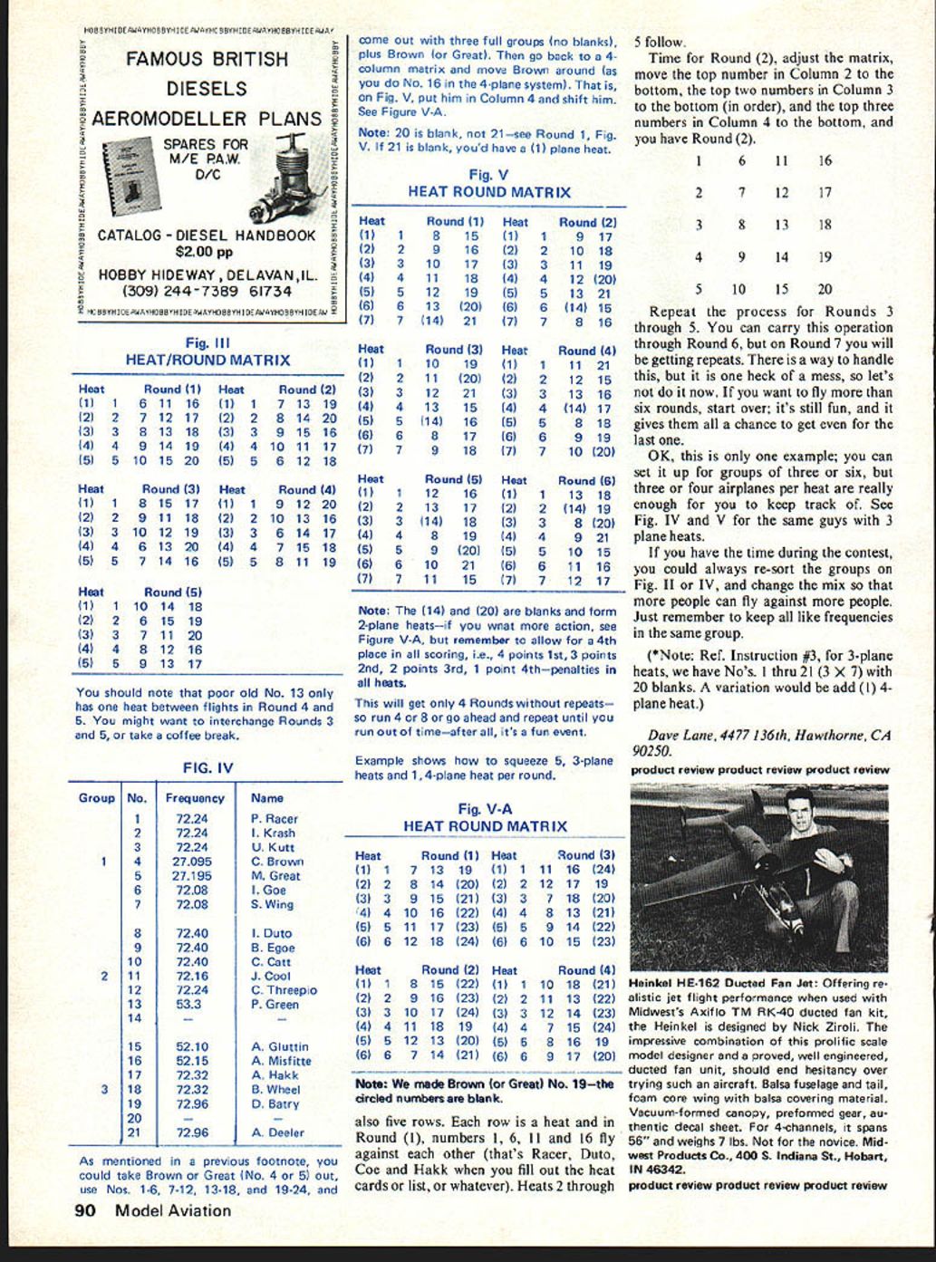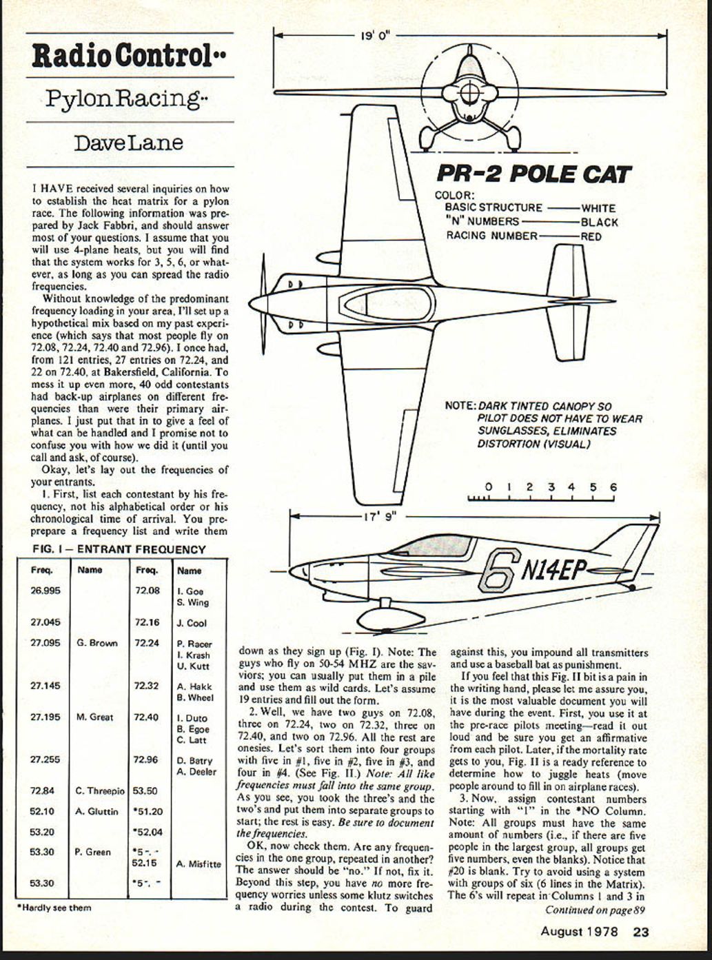 Radio Control K l9 0 PylonRacing DaveLane HAVE received several inquiries establish heat matrix pylon race following information pre pared Jack Fabbri should answer questions assume will use 4-plane heats will find system works 3 5 6 what ever long can spread radio frequencies Without knowledge predominant frequency loading area Ill set up hypothetical mix based past experi ence says people fly 7208 7224 7240 7296 once 121 entries 27 entries 7224 22 7240 Bakersfield California mess up 40 odd contestants back-up airplanes different fre quencies primary air planes just put give feel what can handled promise confuse did until call ask course Okay lets lay out frequencies entrants 1 First list contestant fre quency alphabetical order chronological time arrival pre prepare frequency list write FIG ANT FREQUENCY / COLOR BASIC STRUCTUREWHITE RACING NUMBERRED 0123456 IIIIII PR-2 POLE CAT NOTE DARK TINTED CANOPY SO PILOT DOES NOT HAVE TO WEAR SUNGLASSES ELIMINATES DISTORTION VISUAL down sign up Fig Note guys fly 50-54 MHZ say viors can usually put pile use wild cards Lets assume 19 entries fill out form 2 Well have two guys 7208 three 7224 two 7232 three 7240 two 7296 rest onesies Lets sort four groups five #1 five #2 five #3 four #4 See Fig II Note like frequencies must fall same group As see took threes twos put separate groups start rest easy sure document frequencies OK now check Are frequen cies group repeated another answer should no fix Beyond step have no fre quency worries unless some klutz switches radio during contest guard against impound transmitters use baseball bat punishment feel Fig II bit pain writing hand please let assure valuable document will have during event First use pre-race pilots meetingread out loud sure get affirmative pilot Later mortality rate gets Fig II ready reference determine juggle heats move people around fill airplane races 3 Now assign contestant numbers starting 1 *NO Column Note groups must have same amount numbers ie five people largest group groups get five numbers blanks Notice #20 blank Try avoid using system groups six 6 lines Matrix 6s will repeat inColumns 1 3 Continued page 89 August1978 23 FreqNameFreqName 269957208I Goe S Wing 270457216J Cool 27095G Brown7224P Racer Krash U Kutt 271457232A Hakk B Wheel 27195M Great7240I Duto B Egoe C Latt 2725572960 Batry Deeler 7284C Threepio5350 5210A Gluttin*5120 5320*5204 5330P Green*5 5215A Misfitte 5330*5 *Hardly see WERE EXPANDING CELEBRATING MODEL BUILDER substantially increasing its R/C coverage new monthly features leading modeling authorities RIC construction articles emphasis how-to . R/C oriented Because free flight control line modelers consider MODEL BUILDER best magazine will contin ue present amount coverage areas including regular Peanut plan feature means MODEL BUILDER must enlarge physically pages doing CELEBRATE WITH us. SUBSCRIBE NOW AND GET 3 PEE ISSUES Fill out send coupon check Money Order year subscription $1500 will re ceive 3 additional FREE ISSUES total savings $750 Mail to. MODEL BUILDER Magazine 621 West 19th St Costa Mesa Calif 92627 [v32][b-1-10-1-10]] REGULAR SUBSCRIPTION IS $1500 SUBSCRIBE NOW AND__________________________________________ SAVE $750! RECEIVE 15 ISSUES AT ONE-THIRD OFF City ____________________________ State ____________ Zip NOTE This offer new subscribers NOT subject additional AMA membership discount [v32][b-1-10-1-10]] Name Address rubber mounts identical reasons Andy Sheber showing prop drive unit 2-to-I reduction ratio Quadra engine converts usual 16 pounds thrust 20 pounds Ducted fan applications appeared greater numbers year new design Duane Johnson will kitted World Engines employs shrouded fan twin installation shown mounted McDonnell Douglas F-IS Duane uses product review product review product review Kiwi For 4-channel radio 35-45 engines new 54 low wing trike gear fol lows popular trent smaller less power ful airplanes reduced fuel requirements Typical manufacturers RC kits Kiwi kit complete including such things clear bubble prebent torsion-bar main landing gear coil spring nose gear nylon nose-gear bearing arm aluminum motor mounts nylon bolts RC links threaded rods wing aileron torque rods illustrated struction book decal sheet etc Price $3750 Sig Manufacturing Co Montezuma IA 50171 product review product review product review Supertigre X40s exhaust throttles plane handles air very similar pattern ship Quarter-size one-third-size models considered large past year half-size Aeronca Champion ap peared heard weighed over 30 pounds Editor Some say 75 lbs An exhibitor attracted attention scale modelers Eastcraft Specialty Products display Lecta-Start on-board engine starters being used start engines sizes including Quadra found way elim inating exhaust fumes engines could started run exhibit building product seems spark imagination scale modelers being seen increasing frequency flying field Bob Wischer Rt 1 S-221 Lap/mm Peak Road Delafield WI 53018 RC Pylon/Lane continued page 23 third round Columns 1 4 4th round alternately 8th round everyone repeat Try out see Should forced situa tion can juggle numbers Columns 3 4 keep Column 3s Col umn 3 Column 4s Column 4 can just use matrix Fig V-A four rounds 4 hard part done lets set up five rounds five heats round See Fig III use numbers its quicker straightforward names Take note Round 1 five heats parens four columns FIG II SORTING OUT THE 4 GROUPS OF FREQUENCIES Group*NoFrequencyName 17224P Racer 27224I Krash 37224U Kutt 427095C Brown 527195M Great 67240I Duto 77240B Egoe 28I7240C Catt 97216iCool 107224C Threeplo 117208lGoe 127208S Wing 3135210A Gluttin 145330P Green 155215A Misfitte 167232A Hakk 177232B Wheel 41872960 Batry 197296A Deeler See Instruction 3 August1978 89 HO BRYH TO WAYHO BB OF AWAYHO SHYHOOFAWAYHO BBYHIE AWAY FAMOUS BRITISH DIESELS AEROMODELLER PLANS CATALOG-DIESEL HANDBOOK $200 pp SPARES FOR M/E PAW D/C HOBBY HIDEWAYDELAVANIL 309 244-7389 61734 YHIOEOWAYMOSBYHOOEAWAYHOBRYHIOEAWAYHOHBYHOOE