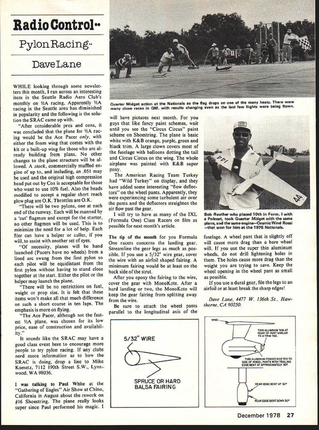 Radio Control Pylon Racing Dave Lane WHILE looking through some newslet ters month ran across interesting item Seattle Radio Aero Clubs monthly racing Apparently racing Seattle area has diminished popularity following solu tion SRAC came up After considerable pros cons concluded plane rac ing would Ace Pacer either foam wing comes kit built-up wing al ready building plans No other changes plane structure will al lowed stock commercially muffled en gine up including 051 may used original high compression head put out Cox acceptable want use 10% fuel Also heads modified accept regular short reach glow plug OK Throttles OK will two pylons end runway will manned cut flagman except starter no other flagmen will used minimize need lot help flier can have helper caller will assist another set eyes necessity planes will hand launched Pacers have no wheels lined arc swung first pylon pilot will equidistant first pylon having stand close together start Either pilot helper may launch plane will no restrictions fuel weight prop size felt items wont make much difference such short course ten laps emphasis flying Ace Pacer although fast est plane chosen its low price ease construction availabil ity sounds like SRAC may have good class event encourage people try pylon racing clubs need information SRAC doing drop line Mike Kometz 7112 190th Street SW Lynn- wood WA 98036 talking Paul White Gathering Eagles Air Show Chino California August about rework #16 Shoestring plane really looks super since Paul performed magic will have pictures next month guys like fancy paint schemes wait until see Circus Circus paint scheme Shoestring plane basic white K&B orange purple green black trim large clown covers fuselage balloons dotting tail Circus Circus wing whole airplane painted K&B super poxy American Racing Team Turkey Wild Turkey display have added some interesting flow deflec tors wheel pants Apparently experiencing some turbulent air over pants deflectors straighten air flow past gear will try have IXL Formula Class Racers film possible next months article tip month Formula racers concerns landing gear Streamline gear legs much pos sible use 5/32 wire gear cover wire airfoil shaped fairing minimum fairing would least back side strut After epoxy fairing wire cover gear MonoKote After hard landing two MonoKote will keep gear fairing splitting away wire sure attach wheel pants parallel longitudinal axis fuselage wheel pant slightly off will cause drag bare wheel will use super thin aluminum wheels drill lightening holes holes cause drag weight trying save Keep wheel opening wheel pant small possible use dural gear file legs airfoil least break sharp edges Dave Lane 4477 W 136th St Haw thorne CA 90250 December1978 27 Quarter Midget action Nationals flag drops heats close races QM results changing last few flights being flown Bob Reuther placed 10th Form Polecat took Quarter Midget same plane same engineCosmic Wind Rossi won him 1975 Nationals 5/32 WIRE SPRUCE OR HARD BALSA FAIRING WING THIN ALUMINUM TAB AT REAR OF PANT SIMILAR TO ATRIM TAB THIN ALUMINUM FENCES RIVETED TO SIDE OF WHEEL PANTS WITH TRAILING EDGE BENT AT APPROXIMATELY 50 REAR EDGE BENT UP 50 REAR EDGE BENT DOWN 30