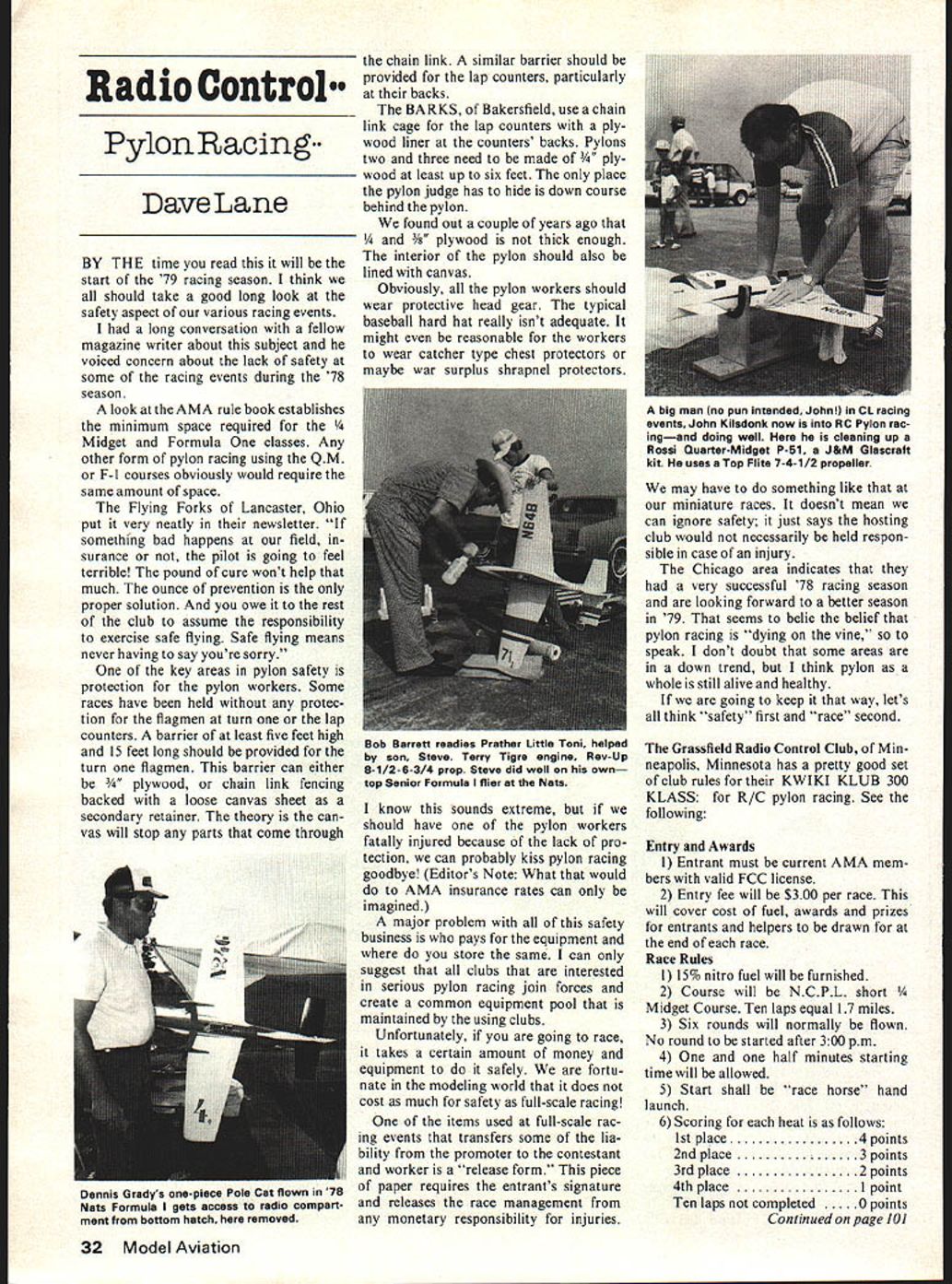 Radio Control Pylon Racing. Dave Lane BY THE time read will start 79 racing season think should take good long look safety aspect various racing events long conversation fellow magazine writer about subject voiced concern about lack safety some racing events during 78 season look AMA rule book establishes minimum space required / Midget Formula classes Any other form pylon racing using QM F-I courses obviously would require same amount space Flying Forks Lancaster Ohio put very neatly newsletter something bad happens field surance pilot going feel terrible pound cure wont help much ounce prevention proper solution owe rest club assume responsibility exercise safe flying Safe flying means never having say youre sorry key areas pylon safety protection pylon workers Some races have held protec tion flagmen turn lap counters barrier least five feet high 15 feet long should provided turn flagmen barrier can either ood chain link fencing backed loose canvas sheet secondary retainer theory can vas will stop parts come through chain link similar barrier should provided lap counters particularly backs BARKS Bakersfield use chain link cage lap counters ply wood liner counters backs Pylons two three need made 3/4 ply wood least up six feet place pylon judge has hide down course behind pylon found out couple years ago /8 plywood thick enough interior pylon should also lined canvas Obviously pylon workers should wear protective head gear typical baseball hard hat really isnt adequate might reasonable workers wear catcher type chest protectors maybe war surplus shrapnel protectors know sounds extreme should have pylon workers fatally injured because lack pro tection can probably kiss pylon racing goodbye Editors Note What would AMA insurance rates can imagined major problem safety business pays equipment store same can suggest clubs interested serious pylon racing join forces create common equipment pool maintained using clubs Unfortunately going race takes certain amount money equipment safely fortu nate modeling world does cost much safety full-scale racing items used full-scale rac ing events transfers some lia bility promoter contestant worker release form piece paper requires entrants signature releases race management monetary responsibility injuries may have something like miniature races doesnt mean can ignore safety just says hosting club would necessarily held respon sible case injury Chicago area indicates very successful 78 racing season looking forward better season 79 seems belie belief pylon racing dying vine speak dont doubt some areas down trend think pylon whole still alive healthy going keep way lets think safety first race second Grassfield Radio Control Club Min neapolis Minnesota has pretty good set club rules KWIKI KLUB 300 KLASS R/C pylon racing See following Entry Awards 1 Entrant must current AMA mem bers valid FCC license 2 Entry fee will $300 per race will cover cost fuel awards prizes entrants helpers drawn end race Race Rules 115% nitro fuel will furnished 2 Course will NCPL short Midget Course Ten laps equal 17 miles 3 Six rounds will normally flown No round started after 300 pm 4 half minutes starting time will allowed 5 Start shall race horse hand launch 6 Scoring heat follows 1st place4 points 2nd place3 points 3rd place2 points 4th place1 point Ten laps completed0 points Continued page 101 32 Model Aviation big man no pun intendedJohnl CL racing evants John Kiladonk now RC Pylon rac ingand doing well Hare cleaning up Rossi Quarter-Midget P-51 J&M Glascraft kit uses Top Flite 7-4-1/2 propeller Bob Barren readies Prather Little Toni helped son Steve Terry Tigre engine Rev-Up 8-1/2-6-3/4 prop Steve did well own top Senior Formula flier Nats Dennis Gradys one-piece Pole Cat flown 7 Nats Formula gets access radio compart ment bottom hatch removed *Penalty cut shall loss position fliers finishing behind cut move up position *Two cuts disqualify flier heat o points Scoring shall same whether timing equipment used 7 Lone fliers will required complete ten laps unless CD exercises option order landing deem ten laps completed 8 In event mid-air contact starter will direct involved ships land immediately safety inspection 9 The contest director will disqualify aircraft deems unsafe flown unsafe manner 10 Contestants will allowed backup aircraft may used original entry becomes unserviceable urged backup same frequency original Aircraft Specifications 1 Engine shall 15 cu stock front rotor non Schnuerle plain bearing carburetor throttle furnished manufacturer 2 The following kitted aircraft eligible entry Sig Doubler II B Sig Super Sport C Sig Klipper D Sig Colt E Michigan Hobby Hangar Quickie F Midwest foam Cardinal 3 Original design modified kit eligible meet following mini mum specifications Design conventional tractor type fuselage wing horizontal vertical stabilizers vee tail B Wing shall constant chord constant thickness minimum dimensions 7/I thickness 300 sq area C Minimum fuselage dimensions measured within wing root shall 1 Width x 4 Height 4 Width X 1 Height Minimum height excludes canopy used 4 Minimum control shall three-chan nel Aileron elevator throttle rud der elevator throttle 5 Landing gear optional Thats month go fast turn left Dave Lane 4477 W 136th St Haw thorne CA 90250 RC Old Timer/Mathews continued page 33 plants engines can permanently damaged lean-run situation highly intolerant heat friction manufacturers instructions hint danger overheated-lean run re member lubricant fuel Now can flood off pres surized fuel systems allowed SAM events Dr James Buice medical doctor Fort Worth has developed clever solution uses IV tubing stopcock surplus hospital item check OR supply nurse connected pen bladder Tatone catalogue item stopcock opened servo allowing fuel previously pumped blad der squirt engine intake flood ing off Although stopcocks thrown away almost daily larger hospitals Dr Buice suggests spring clothespin could pulled open servo accomplish same purpose 