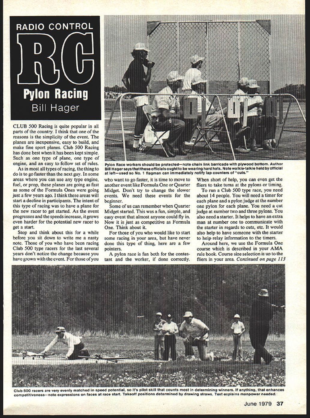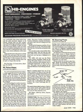 CLUB 500 Racing quite popular parts country think reasons simplicity event planes inexpensive easy build make fine sport planes Club 500 Racing has done best has kept simple Such type plane type engine easy follow set rules As types racing thing to go faster next guy some areas can use type engine fuel prop planes going fast some Formula Ones going just few years ago think areas will start decline participants intent type racing have plane new racer get started As event progresses speeds increase grows harder potential new racer get start Stop think about before sit down write nasty note have racing Club 500 type racers last several years dont notice change because have grown event want go faster time move another event like Formula Quarter Midget Dont try change slower events need events beginner Some us can remember Quarter Midget started fun simple easy event almost anyone could fly Now just competitive Formula Think about would like start some racing area have never done type thing few pointers pylon race fun both contes tant worker done correctly short help can get fliers take turns pylons timing run Club 500 type race need about 14 people will need timer plane pylon judge number pylon plane need cut judge number two three pylons also need starter helps have extra man number communicate starter regards cuts etc would also help have someone starter help relay information timers Around use Formula course described AMA rule book Course size selection uv fliers area Continued page 113 June1979 37 Pylon Race workers ShOuld D proxecteonote chain link barricade plywood bottom Author Bill Hager says thatthese officials ought wearing hard hats Note walkie-talkie held official leftused No 1 flagman can immediately notify lap counters cuts Club 500 racers very evenly matched speed potential its p110-- hat counts determining winners IT anything enhances competitivenessnote expressions faces race start Takeoff positions determined drawing straws Text explains manpower needed very comfortable doing inside loops stick movement appears natural Outside ioops quite another story Most pilots have orientation problems difficult figure out just what airplane comes out groove addition pushing stick top box awkward pilots put some aileron deflection same time hope above discussion help Dick Cline some rest Please send favorite/worst problem Ill share everyone else Lets hope potential solutions dont run quite long has Ron Van Putte 12 Connie Drive Shah mar FL 32579 RC Pylon/Hager continued page 37 will need protection workers would suggest use 3/4 plywood barriers need barriers three pylons timers would also recommend use hard hats Someone club may work construction may able borrow hard hats weekend will need flags number pylon must different color color plane should have walkie talkie some means communication between starter number pylon will aid calling cuts etc race ten laps long have room race-horse start best planes take off once enough room must start planes second intervals fast can drop flag will have draw straws flip coin determine takeoff order race over planes have finished ten laps plane has cut pylon must make up lap Two cuts gets zero race Scoring done pointsfirst place 4 points second place 3 points third place 2 points fourth place point zero cutting out finishing Watch out frequency conflicts Fly rounds can person end day has points winner can spice up contest little concession stand will help club earn little money just done local level can have barbecue picnic AMA will send Pylon Racing Contest Procedure Guide asking guide will give run-down safety procedures complete easy understand instructions run race guide put together National Miniature Pylon Racing Associa tion Heres contest report winter contests did attend Tangerine Pylon Races missed good ten rounds very exciting racing no sure winner until very end Fast time 115 Dennis OBrien FirstBob Reuther 2nd J Little 3rdJ Moorehead 4thDennis OBrien 5thClyde Yarbrough 6thG Jacobson want know what going Send us contest reports small write-up about what went will try print can sent directly Bill Hager 5200 Rye Drive Dayton OH 45424 CORRECTION The plan Frank Ful lers Seversky SEV-32 September 1978 shows dihedral angle outer wing panels similar Army P-35 incorrect Fullers machine upper surface wing straight no dihedral throughout its span fuselage weight pod held onto bottom wing 4-40 nylon screw hard landing screw breaks wing bulkhead Something must have worked Warren ended up third Standard Class An impressive bird showed up past contest season Dennis Harveys Starfire Six second places isnt bad track record eighth place out 34 Stan dard Class contest survival paramount isnt bad either Harvey molds own epoxy glass fuse lages Wings styrofoam cores covered 1/64-in plywood Root airfoil NACA 6409 tip airfoil NACA 4411 FOR PIN full-span flaps solid balsa actuated root flaps have unusual feature Harvey labled Pas sively Restrained Flapsan idea en tered LSF Best Technical Achieve ment category last summer flaps will drop 40 degrees reflex 10 degrees However pin wing tip prevents tip reflexing see sketch Therefore flap reflexed flap pinned both ends preventing flutter Startire has 985 wingspan weighs 62 ounces gives relatively high wing loading 128 ounces per square foot does perform well eats up windy weather June1979 113 RC Soaring/Pruss continued page 38