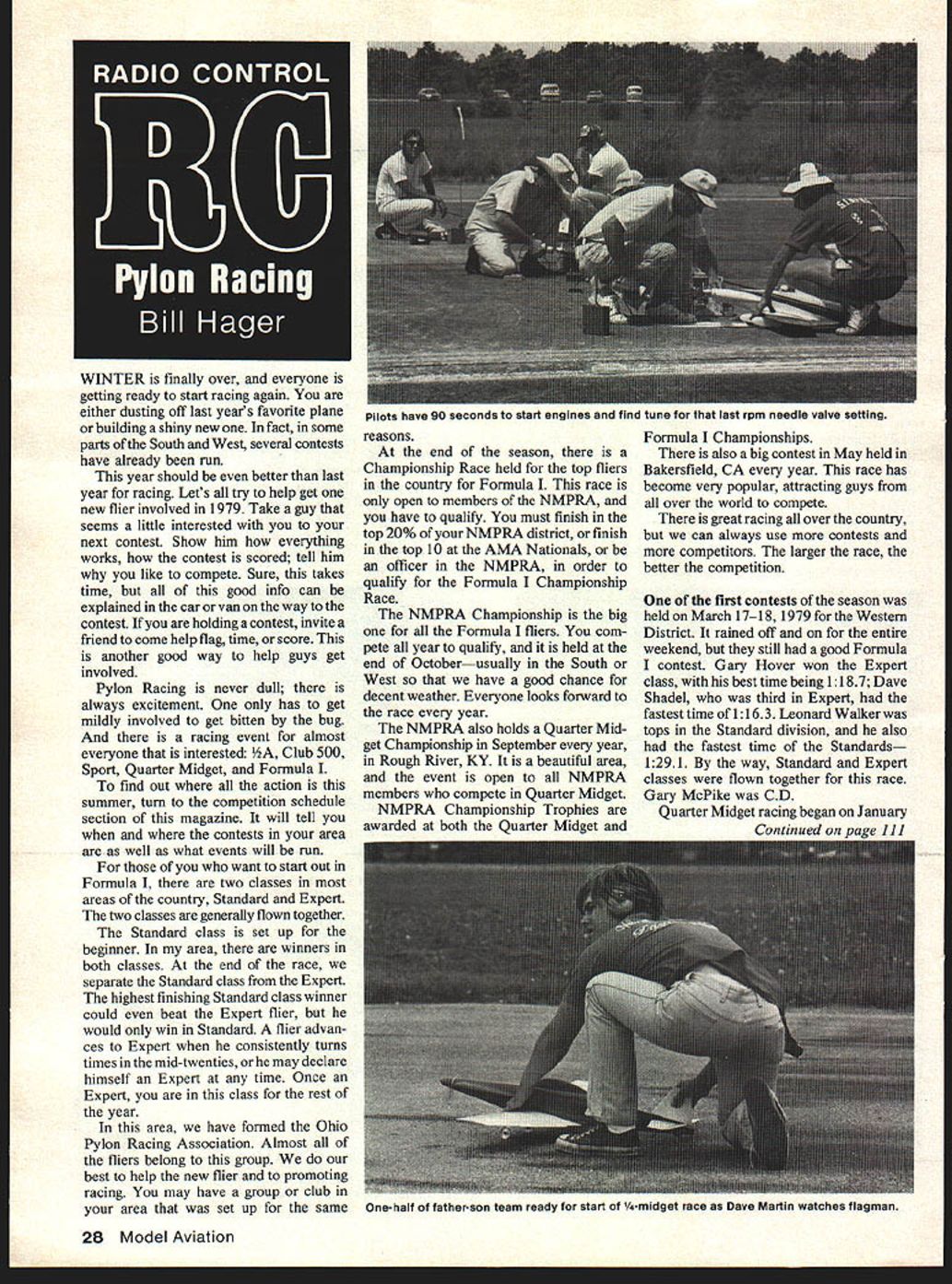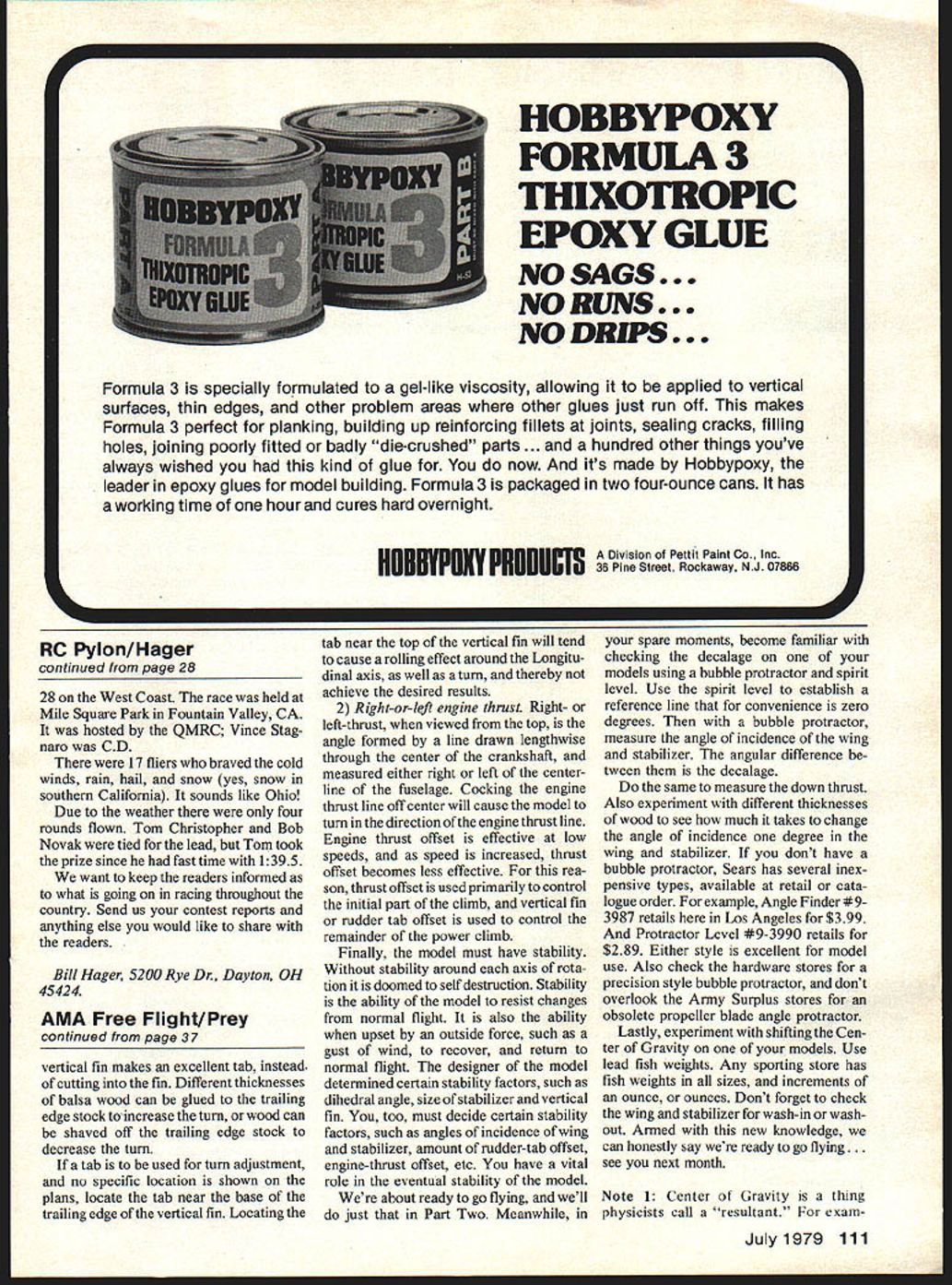 WINTER finally over everyone getting ready start racing again either dusting off last years favorite plane building shiny new fact some parts South West several contests have already run year should better last year racing Lets try help get new flier involved 1979 Take guy seems little interested next contest Show him everything works contest scored tell him like compete Sure takes time good info can explained car van way contest holding contest invite friend come help flag time score another good way help guys get involved Pylon Racing never dull always excitement has get mildly involved get bitten bug racing event almost everyone interested Club 500 Sport Quarter Midget Formula find out action summer turn competition schedule section magazine will tell contests area well what events will run want start out Formula two classes areas country Standard Expert two classes generally flown together Standard class set up beginner area winners both classes end race separate Standard class Expert highest finishing Standard class winner could beat Expert flier would win Standard flier advan ces Expert consistently turns times mid-twenties may declare himself Expert time Once Expert class rest year area have formed Ohio Pylon Racing Association Almost fliers belong group best help new flier promoting racing may have group club area set up same reasons end season Championship Race held top fliers country Formula race open members NMPRA have qualify must finish top 20% NMPRA district finish top 10 AMA Nationals officer NMPRA order qualify Formula Championship Race NMPRA Championship big Formula fliers com pete year qualify held end Octoberusually South West have good chance decent weather Everyone looks forward race year NMPRA also holds Quarter Mid get Championship September year Rough River KY beautiful area event open NMPRA members compete Quarter Midget NMPRA Championship Trophies awarded both Quarter Midget Formula Championships also big contest May held Bakersfield CA year race has become very popular attracting guys over world compete great racing over country can always use contests competitors larger race better competition first contests season held March 1718 1979 Western District rained off entire weekend still good Formula contest Gary Hover won Expert class best time being 1187 Dave Shadel third Expert fastest time 1163 Leonard Walker tops Standard division also fastest time Standards 1291 way Standard Expert classes flown together race Gary McPike CD Quarter Midget racing began January Continued r. 111 28 Model Aviation Pilots have 90 seconds start engines ana Tind tune last rpm necaic vaive setting One-half father-son team ready start /4-midget race Dave Mar-tin watches flagman HOBBYPOXY FORMULA 3 THIXOTROPIC EPOXY GLUE NO SAGS. NORIJNS. NO DR PS. Formula 3 specially formulated gel-like viscosity allowing applied vertical surfaces thin edges other problem areas other glues just run off makes Formula 3 perfect planking building up reinforcing fillets joints sealing cracks filling holes joining poorly fitted badly die-crushed parts . hundred other things youve always wished kind glue now its made Hobbypoxy leader epoxy glues model building Formula 3 packaged two four-ounce cans has working time hour cures hard overnight mmmiv minuws L Division Pettit Paint co Inc 36 Pine Street Rockaway NJ 07866 RC Pylon/Hager continued page 28 28 West Coast race held Mile Square Park Fountain Valley CA hosted QMRC Vince Stag naro CD 17 fliers braved cold winds rain hail snow yes snow southern California sounds like Ohio Due weather four rounds flown Tom Christopher Bob Novak tied lead Tom took prize since fast time 1395 want keep readers informed what going racing throughout country Send us contest reports anything else would like share readers Bill Hager 5200 Rye Dr Dayton OH 45424 AMA Free Flight/Prey continued page 37 vertical fin makes excellent tab instead cutting fin Different thicknesses balsa wood can glued trailing edge stock increase turn wood can shaved off trailing edge stock decrease turn tab used turn adjustment no specific location shown plans locate tab near base trailing edge vertical fin Locating tab near top vertical fin will tend cause rolling effect around Longitu dinal axis well turn thereby achieve desired results 2 Right-or-left engine thrust Right- left-thrust viewed top angle formed line drawn lengthwise through center crankshaft measured either right left center line fuselage Cocking engine thrust line off center will cause model turn direction engine thrust line Engine thrust offset effective low speeds speed increased thrust offset becomes less effective rea son thrust offset used primarily control initial part climb vertical fin rudder tab offset used control remainder power climb Finally model must have stability Without stability around axis rota tion doomed self destruction Stability ability model resist changes normal flight also ability upset outside force such gust wind recover return normal flight designer model determined certain stability factors such dihedral angle size stabilizer vertical fin too must decide certain stability factors such angles incidence wing stabilizer amount rudder-tab offset engine-thrust offset etc have vital role eventual stability model about ready go flying well just Part Two Meanwhile spare moments become familiar checking decalage models using bubble protractor spirit level Use spirit level establish reference line convenience zero degrees bubble protractor measure angle incidence wing stabilizer angular difference tween decalage same measure down thrust Also experiment different thicknesses wood see much takes change angle incidence degree wing stabilizer dont have bubble protractor Sears has several inex pensive types available retail cata logue order example Angle Finder #93987 retails Los Angeles $399 Protractor Level #9-3990 retails $289 Either style excellent model use Also check hardware stores precision style bubble protractor