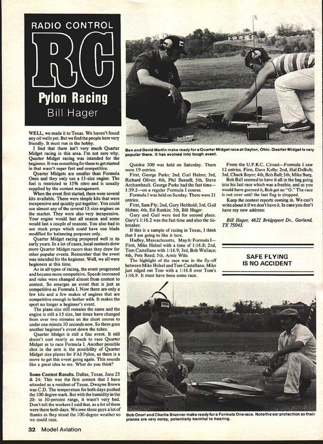 WELL made Texas havent found oil wells yet find people very friendly must run hobby find isnt very much Quarter Midget racing area Im sure Quarter Midget racing intended beginner something get started wasnt super fast competitive Quarter Midgets smaller Formula Ones use 15-size engine fuel restricted 15% nitro usually supplied contest management event first started several kits available simple kits inexpensive quickly put together could use almost several 15-size engines market also very inexpensive engine would last season some would last couple seasons also use stock props could have blade modified balancing purposes Quarter Midget racing prospered well its early years lot cases local contests drew Quarter Midget racers drew other popular events Remember event intended beginner Well beginners time As types racing event progressed became competitive Speeds increased rules changed almost contest contest So emerges event just competitive Formula Now few kits few makes engines competitive enough bother makes sport no longer beginners event plane size still remains same engine still 15 size times have changed over two minutes short course under minute 30 seconds now So goes another beginners event down tubes Quarter Midget still fine event still doesnt cost nearly much race Quarter Midget race Formula Another possible shot arm possibility Quarter Midget size planes FAI Pylon move get event going again sounds like great idea What think Some Contest Results Dallas Texas June 23 & 24 first contest have attended resident Texas Dwayne Brown CD temperature both days pushed 100 degree mark humidity inthe 20- 30-percent range wasnt very bad Dont tell workers said lot both days owe guys lot thanks stood 100-degree weather could race Quickie 500 held Saturday 19 entries First George Parks 2nd Gail Helms 3rd Richard Oliver 4th Phil Russell 5th Steve Archambault George Parks fast time 1392on regular Formula course Formula held Sunday 21 entries First Sam Fly 2nd Gary Heithold 3rd Gail Helms 4th Ed Rankin 5th Bill Hager Gary Gail tied second place Garys 1162 fast time also tiebreaker sample racing Texas think am going like Hadley Massachusetts May 6 Formula First Mike Helsel time 1168 2nd Tom Castellano 1169 3rd Bob Wallace 4th Pete Reed 5th Amie Wile highlight race fly-off between Mike Helsel Tom Castellano Mike just edged out Tom 1168 over Toms 1169 must have some race UPRC CircuitFormula saw 12 entries First Dave Kelly 2nd Hal DeBolt 3rd Chuck Boyer 4th Bob Ball 5th Mike Burg Bob Ball seemed have bag going last race freebie would have guessed Bob got 0 race over until last flag dropped Keep contest reports coming cant write about dont have case dont have new address Bill Hager 4622 Bridgeport Dr Garlan4 TX 75043 SAFE FLYING IS NO ACCIDENT 32 Model Aviation Ben David Martin make ready Quarter Midget race Dayton Ohio Quarter Midget very popular has evolved tough event uounoriananariie runnurmuruuy U planes very noisy potentially harmful hearing