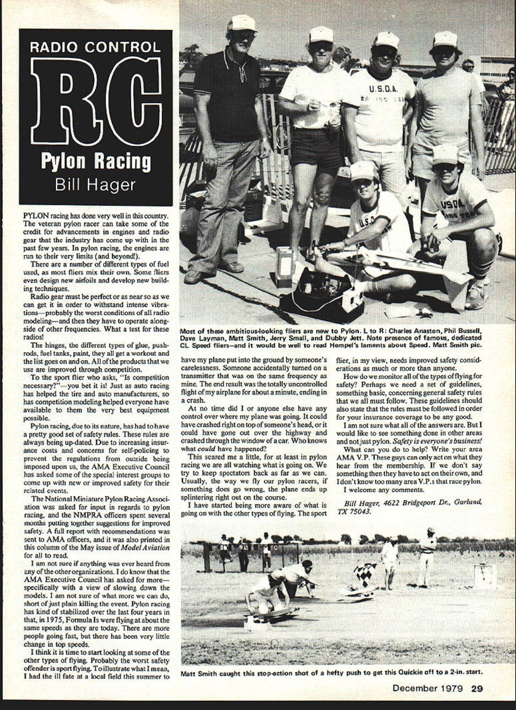 PYLON racing has done very well country veteran pylon racer can take some credit advancements engines radio gear industry has come up past few years pylon racing engines run very limits beyond number different types fuel used fliers mix own Some fliers design new airfoils develop new build ing techniques Radio gear must perfect near can get order withstand intense vibra donsprobably worst conditions radio modelingand have operate along side other frequencies What test radios hinges different types glue pushrods fuel tanks paint get workout list goes on products use improved through competition sport flier asks competition necessaryyou bet Just auto racing has helped tire auto manufacturers has competition modeling helped everyone have available very best equipment possible Pylon racing due its nature has have pretty good set safety rules rules always being up-dated Due increasing insur ance costs concerns self-policing prevent regulations outside being imposed upon us AMA Executive Council has asked some special interest groups come up new improved safety related events National Miniature Pylon Racing Associ ation asked input regards pylon racing NMPRA officers spent several months putting together suggestions improved safety full report recommendations sent AMA officers also printed column May issue ModelAviation read am sure anything ever heard other organizations know AMA Executive Council has asked specifically view slowing down models am sure what can short just plain killing event Pylon racing has kind stabilized over last four years 1975 Formula flying about same speeds today people going fast has very little change top speeds think time start looking some other types flying Probably worst safety offender sport flying illustrate what mean ill fate local field summer have plane put ground someones carelessness Someone accidentally turned transmitter same frequency end result totally uncontrolled flight airplane about minute ending crash no time did anyone else have control over plane going could have crashed right top someones head could have gone out over highway crashed through window car knows what could have happened scared little least pylon racing watching what going try keep spectators back far can Usually way fly pylon racers something does go wrong plane ends up splintering right out course have started being aware what going other types flying sport flier view needs improved safety consid erations much anyone monitor types flying safety Perhaps need set guidelines something basic concerning general safety rules must follow guidelines should also state rules must followed order insurance coverage good am sure what answers would like see something done other areas notjust pylon Sqfety everyones business What can help Write area AMA VP guys can act what hear membership dont say something have act own dont know too area VPs race pylon welcome comments Bill Hager 4622 Bridgeport Dr Garlan4 TX 75043 December 1979 29 Most ambitiouslooking fliers new Pylon L R Charles Anaston Phil Bussell Dave Layman Mitt Smith Jerry Small Dubby Jett Note presence famous dedicated CL Speed fliersand would well read Hempels laments about Speed MatS Smith pic Matt Smith caught stopection shot hefty push get Quickie off 2-in start