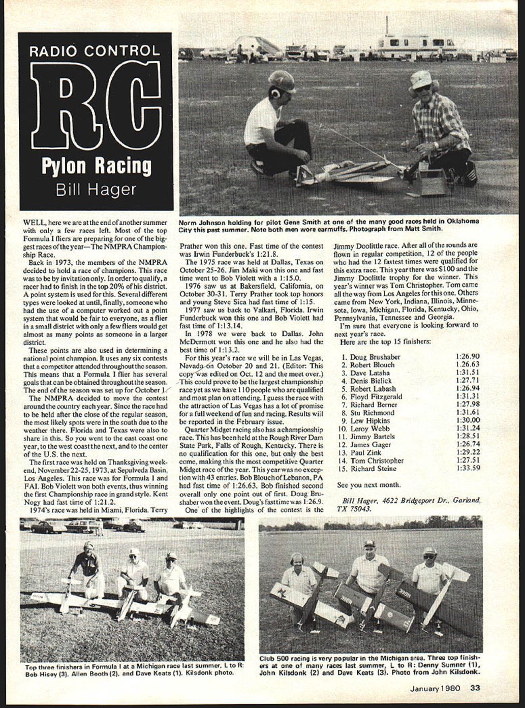 WELL end another summer few races left Most top Formula fliers preparing big gest races yearThe NMPRA Champion ship Race Back 1973 members NMPRA decided hold race champions race invitation order qualify racer finish top 20% district point system used Several different types looked until finally someone use computer worked out point system would fair everyone flier small district few fliers would get almost points someone larger district points also used determining national point champion uses six contests competitor attended throughout season means Formula flier has several goals can obtained throughout season end season set up October jV NMPRA decided move contest around country year Since race held after close regular season likely spots south due weather Florida Texas also share So went east coast year west coast next center US next first race held Thanksgiving week end November 22-25 1973 Sepulveda Basin Los Angeles race Formula FAI Bob Violett won both events thus winning first Championship race grand style Kent Nogy fast time 1212 1974s race held Miami Florida Terry Norm Johnson holding pilot Gene Smith good races held Oklahoma City past summer Note both men wore earmuffs Photograph Matt Smith Prather won Fast time contest Irwin Funderbucks 1218 1975 race held Dallas Texas October 25-26 Jim Maki won fast time went Bob Violets 1150 1976 saw us Bakersfield California October 30-31 Terry Prather took top honors young Steve Sica fast time 115 1977 saw us back Valkari Florida Irwin Funderbuck won Bob Violett fast time 11314 1978 back Dallas John McDermott won also best time 1132 years race will Las Vegas Nevad n October 20 21 Editor cop edited Oct 12 meet over could prove largest championship race yet have 110 people qualified plan attending guess race attraction Las Vegas has lot promise full weekend fun racing Results will reported February issue Quarter Midget racing also has championship race has held Rough River Dam State Park Falls Rough Kentucky no qualification best come making competitive Quarter Midget race year year no excep tion 43 entries Bob Blouch Lebanon PA fast time 12663 Bob finished second overall point out first Doug Bru shaher won event Dougs fast time 1269 highlights contest Jimmy Doolittle race After rounds flown regular competition 12 people 12 fastest times qualified extra race year $100 Jimmy Doolittle trophy winner year s winner Tom Christopher Tom came way Los Angeles Others came New York Indiana Illinois Minne sota Iowa Michigan Florida Kentucky Ohio Pennsylvania Tennessee Georgia Im sure everyone looking forward next years race top 15 finishers 1 Doug Brushaber 2 Robert Blouch 3 Dave Latsha 4 Denis Bielick 5 Robert Labash 6 Floyd Fitzgerald 7 Richard Berner 8 Stu Richmond 9 Lew Hipkins 10 Leroy Webb 11 Jimmy Bartels 12 James Gager 13 Paul Zink 14 Tom Christopher 15 Richard Steine 12690 12663 1315 1 12771 12694 1313 1 127 9 8 13 161 13000 131 24 1 285 1 12674 12922 127 5 1 13359 See next month January 1980 33 Bill Hager 4622 Bridgeport Dr Garland TX 75043 Top three finishers Formula race last summer L Bob Hisey 3 AlIen Booth 2 Dave Keats 1 Kilsdonk photo racing very popular tne Micnigan area i nree top Tinisn ers races last summer L R Denny Sumner 1 John Kilsdonk 2 Dave Keats 3 Photo John Kilsdonk