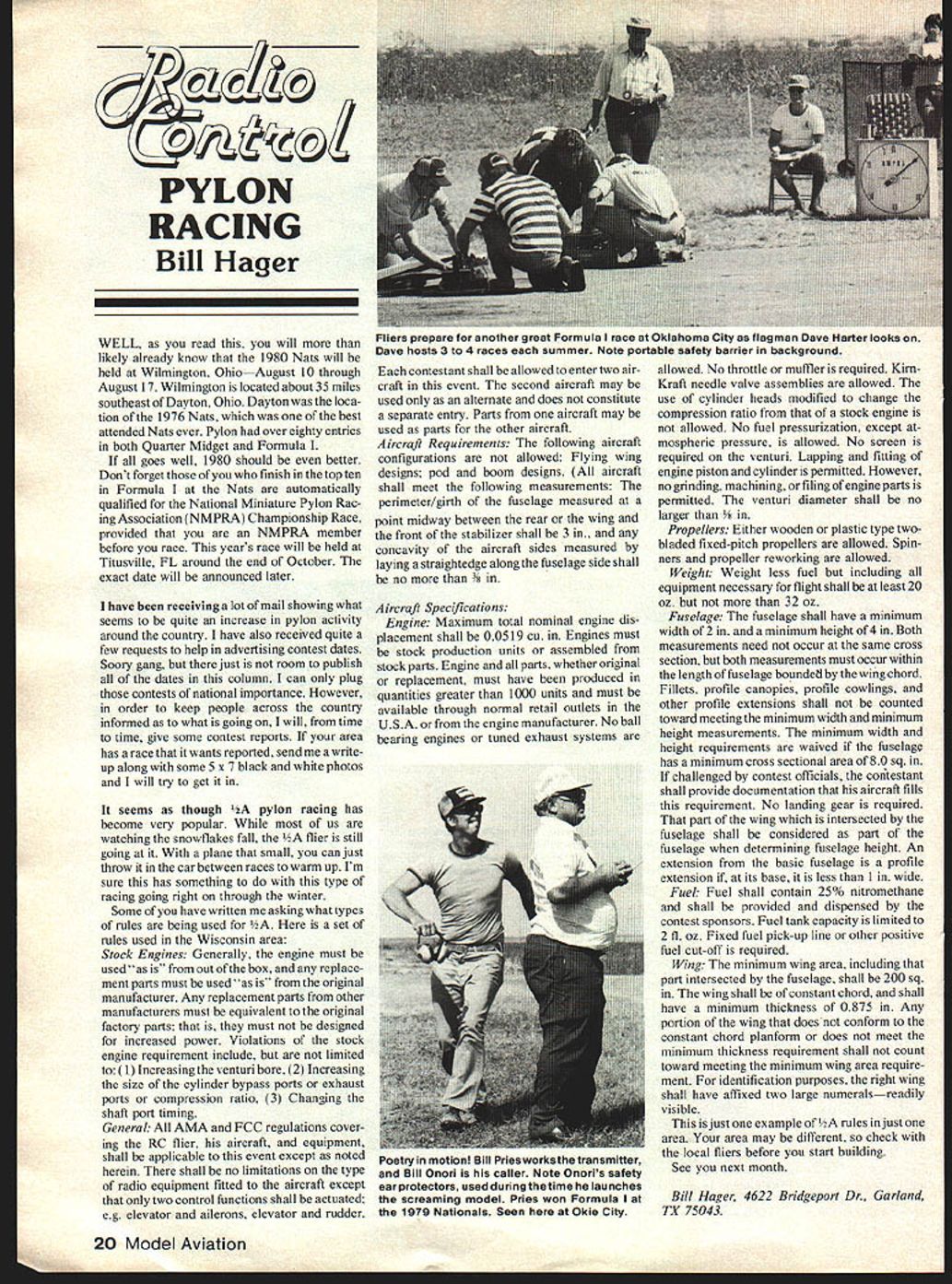 PYLON RACING Bill Hager WELL read will likely already know 1980 Nats will held Wilmington OhioAugust 10 through August 17 Wilmington located about 35 miles southeast Dayton Ohio Dayton loca tion 1976 Nats best attended Nats ever Pylon over eighty entries both Quarter Midget Formula goes well 1980 should better Dont forget finish top ten Formula Nats automatically qualified National Miniature Pylon Rac ing Association NMPRA Championship Race provided NMPRA member before race years race will held Titusville FL around end October exact date will announced later have receiving lot mail showing what seems quite increase pylon activity around country have also received quite few requests help advertising contest dates Soory gang just room publish dates column can plug contests national importance However order keep people across country informed what going will time time give some contest reports area has race wants reported send write up along some 5 x 7 black white photos will try get seems though zA pylon racing has become very popular us watching snowflakes fall flier still going plane small can just throw car between races warm up Im sure has something type racing going right through winter Some have written asking what types rules being used set rules used Wisconsin area Stock Engines Generally engine must used Out ofthe box replace ment parts must used original manufacturer Any replacement parts other manufacturers must equivalent original factory parts must designed increased power Violations stock engine requirement include limited 1 Increasing venturi bore 2 Increasing size cylinder bypass ports exhaust ports compression ratio 3 Changing shaft port timing General AMA FCC regulations cover ing RC flier aircraft equipment shall applicable event except noted herein shall no limitations type radio equipment fitted aircraft except two control functions shall actuated eg elevator ailerons elevator rudder contestant shall allowed enter two air craft event second aircraft may used alternate does constitute separate entry Parts aircraft may used parts other aircraft Aircraft Requirements following aircraft configurations allowed Flying wing designs pod boom designs aircraft shall meet following measurements perimeter/girth fuselage measured point midway between rear wing front stabilizer shall 3 in. concavity aircraft sides measured laying straightedge along fuselage side shall no Aircraft Specifications Engine Maximum total nominal engine dis placement shall 00519 cu Engines must stock production units assembled stock parts Engine parts whether original replacement must have produced quantities greater 1000 units must available through normal retail outlets USA engine manufacturer No ball bearing engines tuned exhaust systems allowed No throttle muffler required Kim Kraft needle valve assemblies allowed use cylinder heads modified change compression ratio stock engine allowed No fuel pressurization except mospheric pressure allowed No screen required venturi Lapping fitting engine piston cylinder permitted However no grinding machining filing engine parts permitted venturi diameter shall no larger ellers Either wooden plastic type two bladed fixed-pitch propellers allowed Spin ners propeller reworking allowed Weight Weight less fuel including equipment necessary flight shall least 20 oz 32 oz Fuselage fuselage shall have minimum width 2 minimum height 4 Both measurements need occur same cross section both measurements must occur within length fuselage bounded wing chord Fillets profile canopies profile cowlings other profile extensions shall counted toward meeting minimum width minimum height measurements minimum width height requirements waived fuselage has minimum cross sectional area 80 sq challenged contest officials contestant shall provide documentation aircraft fills requirement No landing gear required part wing intersected fuselage shall considered part fuselage determining fuselage height An extension basic fuselage profile extension its base less 1 wide Fuel Fuel shall contain 25% nitromethane shall provided dispensed contest sponsors Fuel tank capacity limited 2 fi oz Fixed fuel pick-up line other positive fuel cut-off required Wing minimum wing area including part intersected fuselage shall 200 sq wing shall constant chord shall have minimum thickness 0875 Any portion wing does conform constant chord planform does meet minimum thickness requirement shall count toward meeting minimum wing area require ment identification purposes right wing shall have affixed two large numeralsreadily visible just example ules just area area may different check local fliers before start building See next month Bill Hager 4622 Bridgeport Dr Garland TX 75043 20 Model Aviation Fliers prepare tor anosner great 1-ormula race Okiafloma City flagman Dave Hailer looks Dave hosts 3 4 races summer Note portable safety barrier background Poetry motion Bill Pries worksthe transmitter Bill Onori caller Note Onoris safety ear protectors used during thetime launches screaming model Pries won Formula 1979 Nationals Seen Okie City