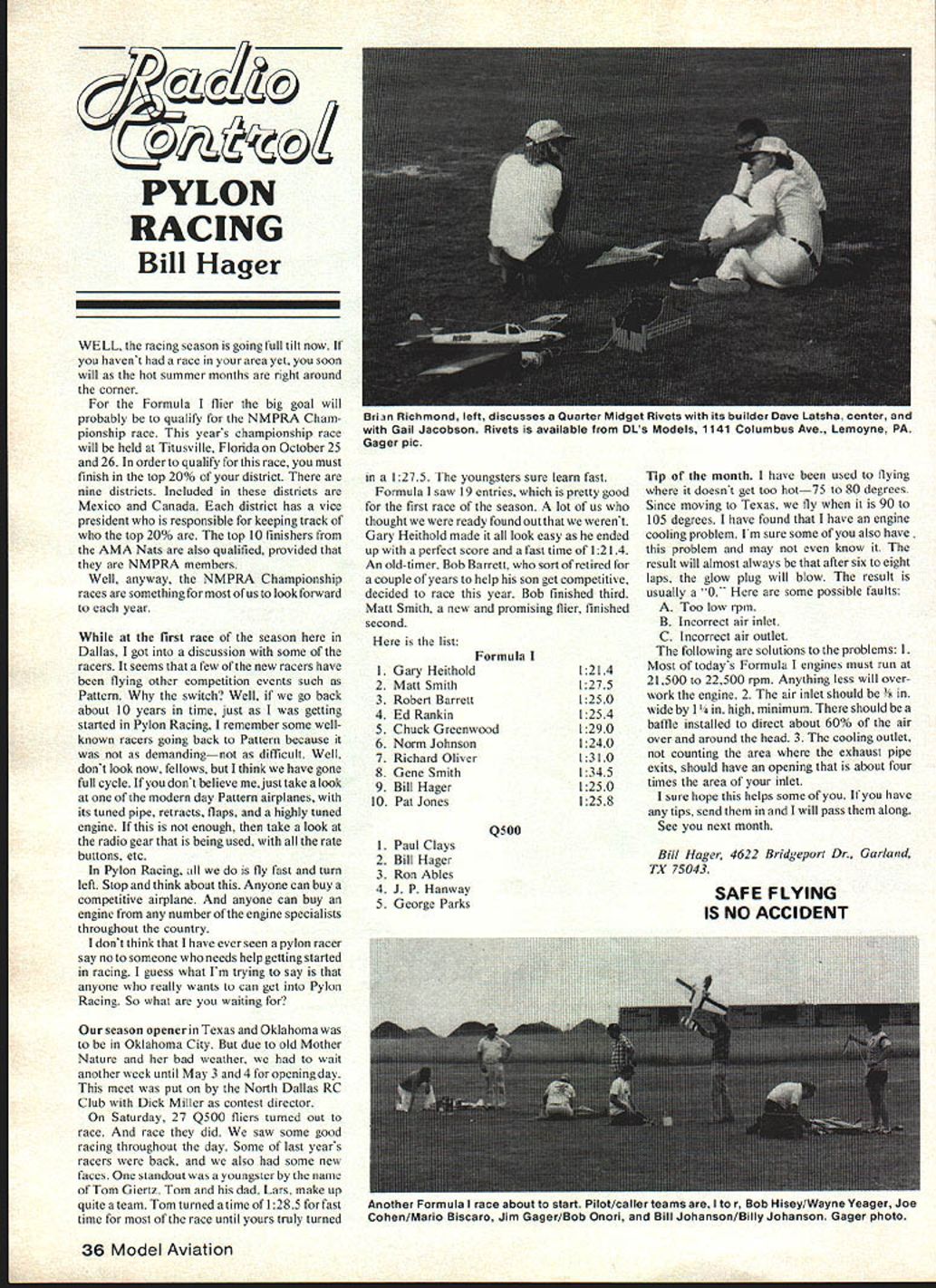 C PYLON RACING Bill Hager WE LL racing season going foil tilt now havent race area yet soon will hot summer months right around corner Formula flier big goal will probably qualify NMPRA Cham pionship race years championship race will held Titusville Florida October25 26 order qualify race must finish top 20% district nine districts Included districts Mexico Canada district has vice president responsible keeping track top 20% top 10 finishers AMA Nats also qualified provided NMPRA members Well anyway NMPRA Championship races something us look forward year first race season Dallas got discussion some racers seems few new racers have flying other competition events such Pattern switch Well go back about 10 years time just getting started Pylon Racing remember some wellknown racers going back Pattern because demandingnot difficult Well dont look now fellows think have gone full cycle dont believe mejust take look modern day Pattern airplanes its tuned pipe retracts flaps highly tuned engine enough take look radio gear being used rate buttons etc Pylon Racing fly fast turn left Stop think about Anyone can buy competitive airplane anyone can buy enginc number engine specialists throughout country dont think have ever seen pylon racer say no someone needs help getting started racing guess what Im trying say anyone really wants can get Pylon Racing So what waiting season opener Texas Oklahoma Oklahoma City due old Mother Nature bad weather wait another week until May 3 4 opening day meet put North Dallas RC Club Dick Miller contest director Saturday 27 Q500 fliers tumed Out race race did saw some good racing throughout day Some last years racers back also some new faces standout youngster name Tom Giertz Tom dad Lars makeup quite team Tom turned time 1285 fast time race until yours truly turned 1275 youngsters sure learn fast Formula saw 19 entries pretty good first race season lot us thought ready found out werent Gary Heithold made look easy ended up perfect score fast time 1214 An old-timer Bob Barrett sort retired couple years help son get competitive decided race year Bob finished third Matt Smith new promising flier finished second list Formula 1 Gary 1-leithold 2 Matt Smith 3 Robert Barrett 4 Ed Rankin 5 Chuck Greenwood 6 Norm Johnson 7 Richard Oliver 8 Gene Smith 9 Bill Hager 10 Pat Jones 1 Paul Clays 2 Bill Hager 3 Ron Ables 4 J P Hanway 5 George Parks 12 14 1275 12 50 1254 1290 1240 13 10 1345 1250 1258 Q500 Tip month have used flying doesnt get too hot75 80 degrees Since moving Texas fly 90 105 degrees have found have engine cooling problem Im sure some also have problem may know result will almost always after six eight laps glow plug will blow result usually 0 some possible faults A Too low rpm B Incorrect air inlet C Incorrect air outlet following solutions problems Most todays Formula engines must run 21500 22500 rpm Anything less will over work engine 2 air inlet should s wide 1 4 high minimum should baffle installed direct about 60% air over around head 3 cooling outlet counting area exhaust pipe exits should have opening about four times area inlet sure hope helps some you have tips send will pass along See next month Bill Hager 4622 Bridgeport Dr Garland TX 75043 36 Model Aviation url3n lllcnmono en aiscusses uuarter ioger ijivess wHin its uiiaer uave Laisna center ano Gail Jacobson Rivets available DLs Models 1141 Columbus Ave Lemoyne PA Gager pic SAFE FLYING IS NO ACCIDENT Anotner 1-ormula race about start Pilot/caller teams Ito r Bob Hisey/Wayne Yeager Joe Cohen/Mario Biscaro Jim Gager/Bob Onori Bill Johanson/Billy Johanson Gager photo