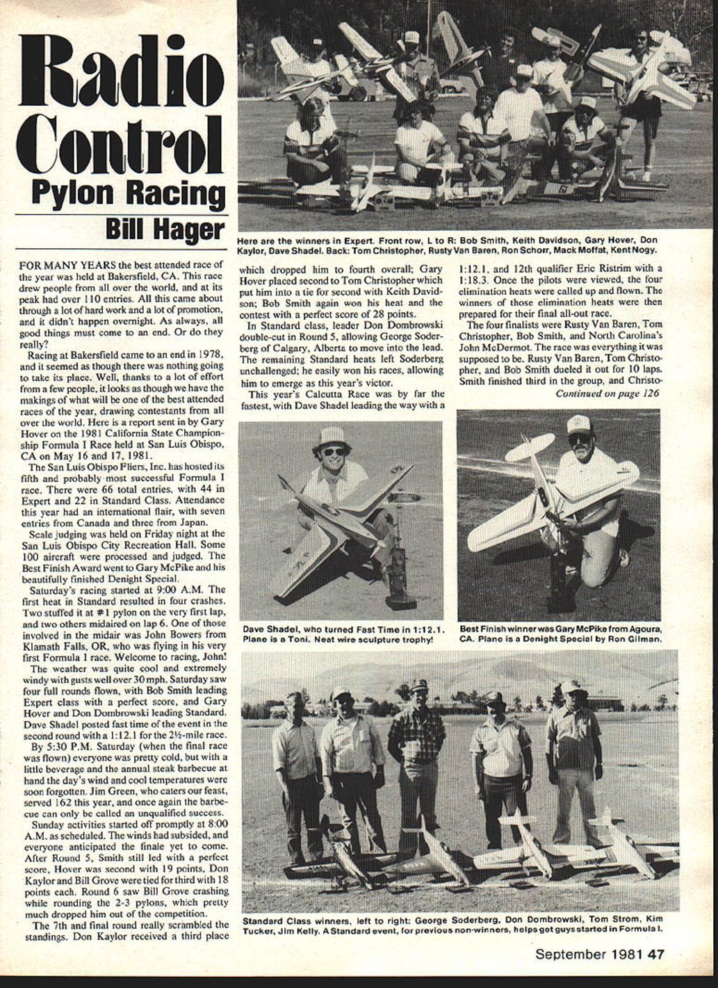 Radio Control Pylon Racing Bill Hager FOR MANY YEARS best attended race year held Bakersfield CA race drew people over world its peak over 110 entries came about through lot hard work lot promotion didnt happen overnight As always good things must come end really Racing Bakersfield came end 1978 seemed though nothing going take its place Well thanks lot effort few people looks though have makings what will best attended races year drawing contestants over world report sent Gary Hover 1981 California State Champion ship Formula Race held San Luis Obispo CA May 16 17 1981 San Luis Obispo Fliers Inc has hosted its fifth probably successful Formula race 66 total entries 44 Expert 22 Standard Class Attendance year international flair seven entries Canada three Japan Scale judging held Friday night San Luis Obispo City Recreation Hall Some 100 aircraft processed judged Best Finish Award went Gary McPike beautifully finished Denight Special Saturdays racing started 900 AM first heat Standard resulted four crashes Two stuffed #1 pylon very first lap two others midaired lap 6 involved midair John Bowers Klamath Falls OR flying very first Formula race Welcome racing John weather quite cool extremely windy gusts well over 30mph Saturday saw four full rounds flown Bob Smith leading Expert class perfect score Gary Hover Don Dombrowski leading Standard Dave Shadel posted fast time event second roundwitha 1121 forthe 2-mile race 530 PM Saturday final race flown everyone pretty cold little beverage annual steak barbecue hand days wind cool temperatures soon forgotten Jim Green caters feast served 162 year once again barbe cue can called unqualified success Sunday activities started off promptly 800 AM scheduled winds subsided everyone anticipated finale yet come After Round 5 Smith still led perfect score Hover second 19 points Don Kaylor Bill Grove tied third 18 points Round 6 saw Bill Grove crashing rounding 2-3 pylons pretty much dropped him out competition 7th final round really scrambled standings Don Kaylor received third place dropped him fourth overall Gary Hover placed second Tom Christopher put him tie second Keith David son Bob Smith again won heat contest perfect score 28 points Standard class leader Don Dombrowski double-cut Round 5 allowing George Soder berg Calgary Alberta move lead remaining Standard heats left Soderberg unchallenged easily won races allowing him emerge years victor years Calcutta Race far fastest Dave Shadel leading way 1121 12th qualifier Eric Ristrim 1183 Once pilots viewed four elimination heats called up flown winners elimination heats prepared final all-out race four finalists Rusty Van Baren Tom Christopher Bob Smith North Carolinas John McDermot race everything supposed Rusty Van Baren Tom Christo pher Bob Smith dueled out 10 laps Smith finished third group Christo Continued page 126 September 1981 47 winners Expert Front row L R Bob Smith Keith Davidson Gary Hover Don Kaylor Dave Shadel Back Tom Christopher Rusty Van Baren Ron Schorr Mack Moffat Kent Nogy uave naaeI turned Fast Time 1121 uesTI-Inlsnwlnnerwasuarymcl-IKerromRgoura Plane Toni Neat wire sculpture trophy CA Plane Denight Special Ron Gilman tanoara class winners en no rigni Leorge Soderberg Don Dombrowaki Tom Strom Kim Tucker Jim Kelly Standard event previous non-winners helps get guys started Formula PBY-5 Catalina$40000 See Dealer Mr Gs Products & Supply 1010 Gratiot Marysville MI 48040 areas corrections helpful tips newsletter nice touch particularly beginners visiting friend out town UPS arrived package American RC new plastic side frames modifications friends Mantis Mantis available since loan South Carolina plastic parts look good probably superior plywood construction least regard building time modification available under $2000 believe Mantis needs face lift could ticket also received information Watson dustries regarding new gyro com pany has developed electronic device duplicates function old electro mechanical rate gyro Im looking forward trying soon can Ill try out new Schlueter SX8 1 Helicopter photo beginnings SX8 1 next Heliboy might lead wonder Dieter didnt name latter Lowboy center gravity higher 5X8 1 Heliboy promises better rolling character istics fuselage very scale-like fact someone familiar full-scale Helicopters might think SX8 lisa scaled-down version latest attack Helicopter time permits hope have SX8 1 completed featured next month Meanwhile since Heliboy doesnt fly itself think Ill try hand Good flying See next month Dave Chesney Rt 9 Box 621A Greensboro NC 27409 RC Pylon Racing/Hager Continued page 47 pher cut last pylon rendered Rusty ultimate winner time 1123 sponsor caller Jerry Boyce walked away $58050 eachnot bad weekend races 44 Expert contestants 22 broke 120 says something clean air Cali fornias central coast lot people made race total success starter Len Ledson Club President Tom Wiggen everyone pitched helped look forward next year Race #6 will better ever final results Expert 1 Bob Smith 2 Keith Davidson 3 Gary Hover 1146 1175 1178 4 Dave Kaylor 5 Dave Shadel 6 Tom Christopher 7 Rusty Van Baren 8 Ron Schorr 9 Mack Moffat 10 Kent Nogy Results Standard 1 George Soderberg 2 Don Dombrowski 3 Tom Strom 4 Kim Tucker 5 Jim Kelly Formula fliers should put contest calendar years Nationals will Seguin TX August 2 thru 9 Its going good have plenty room weather should great Ill looking forward seeing Bill Hager 706 Glen Haven Dr Conroe TX 77302 FF Champs/Meuser Continued page 53 modern Schnuerle-ported nitro-methane-buming 30000 rpm engines Some gas jobs run over field before taking off ever just like good old days 1935 1940 get airborne sight behold sight makes some modern modelers wonder went wrong good old days new twist As Ed Lidgard put half way through winding up modern version Bugs Buzz rubber power model Yeh good old days didnt have decent rubber decent winders winding tubes prevent models getting destroyed rubber motor broke de thermalizers help us get models back 