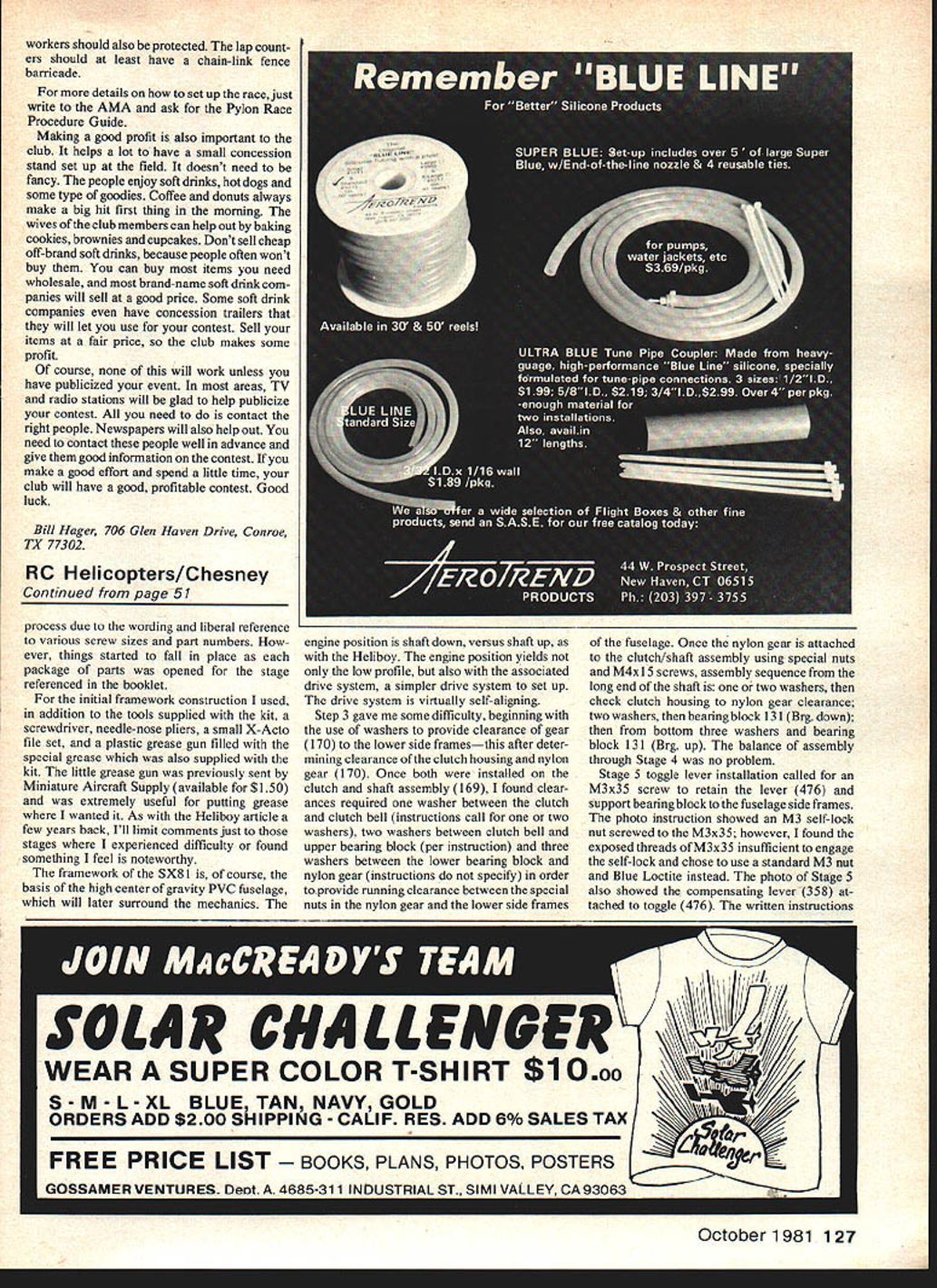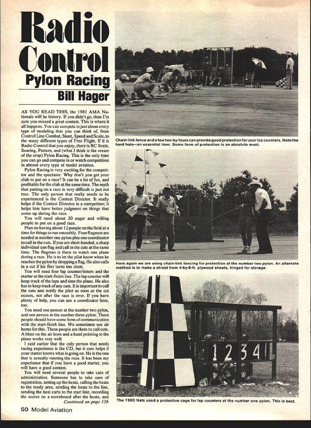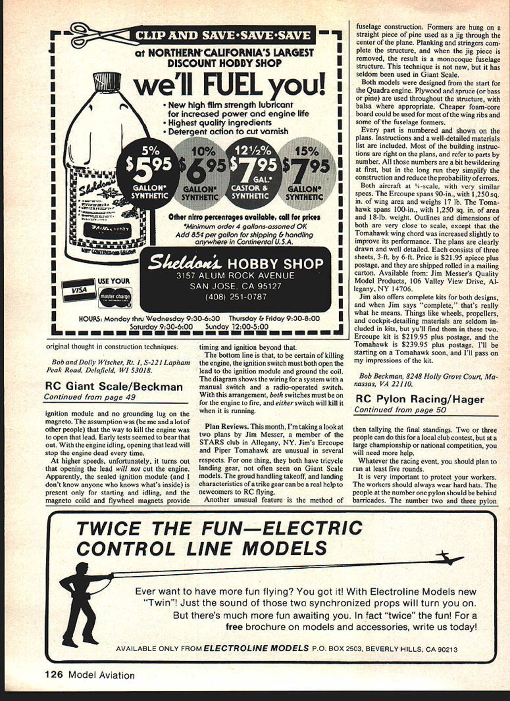 Control Pylon Racing Bill Hager AS YOU READ THIS 1981 AMA Na tionals will history didnt go Im sure missed great contest happens can compete just about type modeling can think Control Line Combat Stunt Speed Scale different types Free Flight Radio Control enjoy RC Scale Soaring Pattern what think cream crop Pylon Racing time can go compete watch competition almost type model aviation Pylon Racing very exciting competi tor spectator dont get club put race can lot fun profitable club same time myth putting race very difficult just true person really needs experienced Contest Director really helps Contest Director competitor helps him have better judgment things come up during race will need about 20 eager willing people put good race Plan having about 12 people field time things run smoothly Four flagmen needed number pylon plus coordinator call cuts short-handed sharp individual can flag call cuts same time flagman watch plane during race let pilot know reaches pylon dropping flag also calls cut flier turns too short will need four lap counter/timers starter start-finish line lap counter will keep track laps time plane also has keep track cuts important call cuts notify pilot soon cut occurs after race over have plenty help can use coordinator too need person number two pylon person number three pylon people should have some form communication start-finish line sometimes use alr horns people call cuts blast air horn hand pointing plane works very well said earlier person needs racing experience CD sure helps starter knows what going actually running race has experience have good starter will have good contest will need several people take care administration Someone has take care registration setting up heats calling heats ready area sending heats line sending heat carts start line recording scores scoreboard after heats Continued page 126 50 Model Aviation Chain-link fence fewtwo-by-fours can provide good protection foryour lap counters Notethe hard hatsan essential item Some form protection absolute must tilS Il1 lur jJ[uLetlIorl dl miumoer two pyion Mil aiiername method make shield 4-by-8-ft plywood sheets hinged storage 1980 Nats used protective cage ror ap counters tne number pylon best El NORTHER# CALIFORNIAS LARGEST DISCOUNT HOBBY SHOPI well FUELyouI New high film strength lubricantI increased power engine lifeI Highest qualily ingredientsI Deternnt action rut varnish II II II II II II II II I II IHOURS Monday thru weanesoayv ju-o u inursacy Ci ridoy VjU-6UUI L hmininuminm riginal thought construction techniques Bob Dolly Wischer Rt 1 S-221 Lapham Peak Road Delafield WI 53018 RC Giant Scale/Beckman Continued page 49 ignition module no grounding lug magneto assumption lot other people way kill engine open lead Early tests seemed bear Out engine idling opening lead will stop engine dead time higher speeds unfortunately turns out opening lead will cut engine Apparently sealed ignition module dont know anyone knows whats inside present starting idling magneto coild flywheel magnets provide r timing ignition beyond bottom line certain killing engine ignition switch must both open lead ignition module ground coil diagram shows wiring system manual switch radio-operated switch arrangement both switches must engine fire either switch will kill running Plan Reviews month Im taking look two plans Jim Messer member STARS club Allegany NY Jims Ercoupe Piper Tomahawk unusual several respects thing both have tricycle landing gear often seen Giant Scale models groud handling takeoff landing characteristics trike gear can real help newcomers RC flying Another unusual feature method fuselage construction Formers hung straight piece pine used jig through center plane Planking stringers com plete structure jig piece removed result monocoque fuselage structure technique new has seldom used Giant Scale Both models designed start Quadra engine Plywood spruce bass pine used throughout structure balsa appropriate Cheaper foam-core board could used wing ribs some fuselage formers part numbered shown plans Instructions well-detailed materials list included Most building instruc tions right plans refer parts number numbers bit bewildering first long run simplify construction reduce probability errors Both aircraft -scale very similar specs Ercoupe spans 90-in 1250 sq wing area weighs 17 lb Toma hawk spans 100-in 1250 sq area 18-lb weight Outlines dimensions both very close scale except Tomahawk wing chord increased slightly improve its performance plans clearly drawn well detailed consists three sheets 3-ft 6-ft Price $2195 apiece plus postage shipped rolled mailing carton Available Jim Messers Quality Model Products 106 Valley View Drive Al legany NY 14706 Jim also offers complete kits both designs Jim says complete thats really what means Things like wheels propellers cockpit-detailing materials seldom cluded kits yull find two Ercoupe kit $21995 plus postage Tomahawk $23995 plus postage Ill starting Tomahawk soon Ill pass impressions kit Bob Beckman 8248 Holly Grove Court Ma nassas VA 22110 RC Pylon Racing/Hager Continued page 50 tallying final standings Two three people can local club contest large championship national competition will need help Whatever racing event should plan run least five rounds very important protect workers workers should always wear hard hats people number pylon should behind barricades number two three pylon 1 26 Model Aviation TWICE THE FUNELECTRIC CONTROL LINE MODELS Ever want have fun flying got Electroline Models new Twin Just sound two synchronized props will turn theres much fun awaiting fact twice fun free brochure models accessories write us today AVAILABLE ONLY FROM ELECTROLINE MODELS PO BOX 2503 BEVERLY HILLS CA 90213 workers should also protected lap count ers should least have chain-link fence barricade details set up race just write AMA ask Pylon Race Procedure Guide Making good profit also important club helps lot have small concession stand set up field doesnt nee