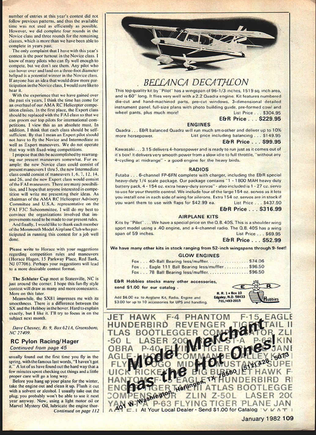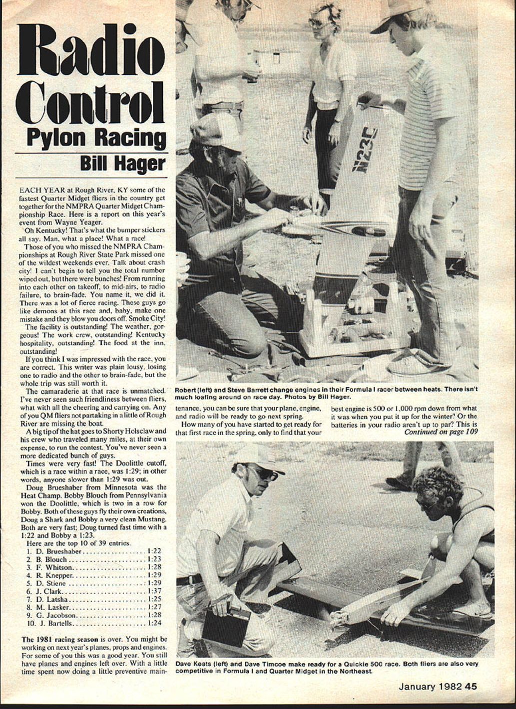 Radio ConE rot Pylon Racing Bill Hager EACH YEAR Rough River KY some fastest Quarter Midget fliers country get together NMPRA Quarter Midget C ham pionship Race report years event Wayne Yeager Oh Kentucky Thats what bumper stickers say Man what place What race missed NMPRA C ham pionships Rough River State Park missed wildest weekends ever Talk about crash city cant begin tell total number wiped out bunches running other takeoff mid-airs radio failure brain-fade name did lot fierce racing guys go like demons race baby make mistake blow doors off Smoke City facility outstanding weather gor geous work crew outstanding Kentucky hospitality outstanding food inn outstanding think impressed race correct writer plain lousy losing radio other brain-fade whole trip still worth camaraderie race unmatched Ive never seen such friendliness between fliers what cheering carrying Any QM fliers partaking little Rough River missing boat big tip hat goes Shorty Holsclaw crew traveled miles own expense run contest Youve never seen dedicated bunch guys Times very fast Doolittle cutoff race within race 129 other words anyone slower 129 out Doug Brueshaber Minnesota Heat Champ Bobby Blouch Pennsylvania won Doolittle two row Bobby Both guys fly own creations Doug Shark Bobby very clean Mustang Both very fast Doug turned fast time 122 Bobby 123 top 10 39 entries 1D Brueshaber122 2B Blouch123 3F Whitson128 4R Knepper129 5D Stiene129 61 Clark137 7D Latsha125 8M Lasker127 9G Jacobson128 10 J Bartells124 1981 racing season over might working next years planes props engines some good year still have planes engines left over little time spent now doing little preventive maintenance can sure plane engine best engine 500 1000 rpm down what radio will ready go next spring put up winter have started get ready batteries radio arent up par first race spring find Continued page 109 January 1982 45 Robert left Steve Barrett change engines Formula racer between heats isnt much loafing around race day Photos Bill Hager Dave Keats left Dave Timcoe make ready Quickie 500 race Both fliers aiso very competitive Formula Quarter Midget Northeast number entries years contest did follow previous patterns thus available time used efficiently possible However did complete four rounds Novice class three rounds remaining classes have able complete years past complaint have years contest poor turnout Novice class know pilots can fly well enough compete dont see Any pilot can hover over land three-foot diameter helipad potential winner Novice class anyone has idea would draw par ticipation Novice class would sure like hear experience have gained over past six years think time has come overhaul AMA RC Helicopter compe tition classes first place Expert class should replaced FAI class can groom top pilots international com petitions view absolute must addition think class should self suflicient mean Expert pilot should have fly Novice Intermediate well Expert maneuvers operate way fixed-wing competitions propose accomplished rearrang ing present maneuvers somewhat ex ample new Novice class could consist present maneuvers thru 5 new Intermediate class could consist maneuvers 1 6 7 12 14 26 new Expert class would consist FAI maneuvers possibili ties hope anyone interested compe tition will write presenting ideas As chairman AMA RC Helicopter Advisory Committee USA representative FAI F3C Subcommittee will best convince organizations involved im provements need made present rules finally would like thank member Monmouth Model Airplane Club par ticipated running contest job well done Please write Horace suggestions regarding competition rules maneuvers Horace Hagen 15 Parkway Place Red Bank NJ 07706 Perhaps suggestions will cad desirable contest format Schluter Cup meet Statesville NC just around corner hope fun-fly style contest will draw contestants later Meanwhile 5X8 1 impresses its smoothness difference between SX Heliboy hover Hard explain exactly like Ill try focus subject next month Date Chesnev Rt 9 Box 62 IA Greensboro NC 27409 RC Pylon Racing/Hager Continued page 45 usually found Out first time fly spring famous last words havent got lot us have found out hard way few minutes spent checking out things little proper care will go long way Before hang up plane winter take engine out clean up Flush out solvent alcohol usually take Out plug probably wont able use next year anyway Now using light motor oil Marvel Mystery Oil lubricate engine thorContinued page 112 BFJ2L4JVC/I DECAThLCON top quality kit Pilot has wingspan 96-1/3 inches 1 519 sq inch area 60 long flies very well 22 Quadra engine Kit features numbered die-cut hand-machined parts pre-cut windows 3-dimensional detailed instrument panel full-size plans photo building guide pre-formed cowl wheel pants p1us much moreList Price 0495 E&R Price. $22995 ENGINES Quadra R balanced Quadra will run much am oother deliver up 10% horsepowerList price including balancing 4995 E&R Price. $9995 Kawasaki delivers 4-horsepower ready run lust comes out its box delivers very smooth powerfrom slow idle tofull throttlewithout 4-cycling midrange good engine heavy birds RADIOS Futaba channel FP-6FN complete charger including E&R special heavy-duty 1/4 scale package package contains 1 1 800 MAH heavy duty battery pack 4- 154 oz extra heavy-duty servos also included 1 -27 oz servo use throttle control include four large 154oz servos lets install side wing ailerons Extra 154 oz servos stock want use flaps $4299 ea List Price 3790 E&R Price 699 AIRPLANE KITS Kits Pilot have special price 0 B 40S isa shoulderwing sport model using 40 engine 4-channel radio OR 405 has wing span 59 inchesList Price 995 E&R Price. $5299 have other kits stock ranging 52-inch wingapans through 9-feet GLOW ENGINES Fox -Ball Bearing less/muffler$7406 Fox gle 111 Ball Bearing less/muffler$9650 Fox Ball Bearing less/muffler$9650 EEtR Hobbies stocks other accessories send $100 catalog Add $600 ea Airplane Kit Radio Engine $300 up 10 acce