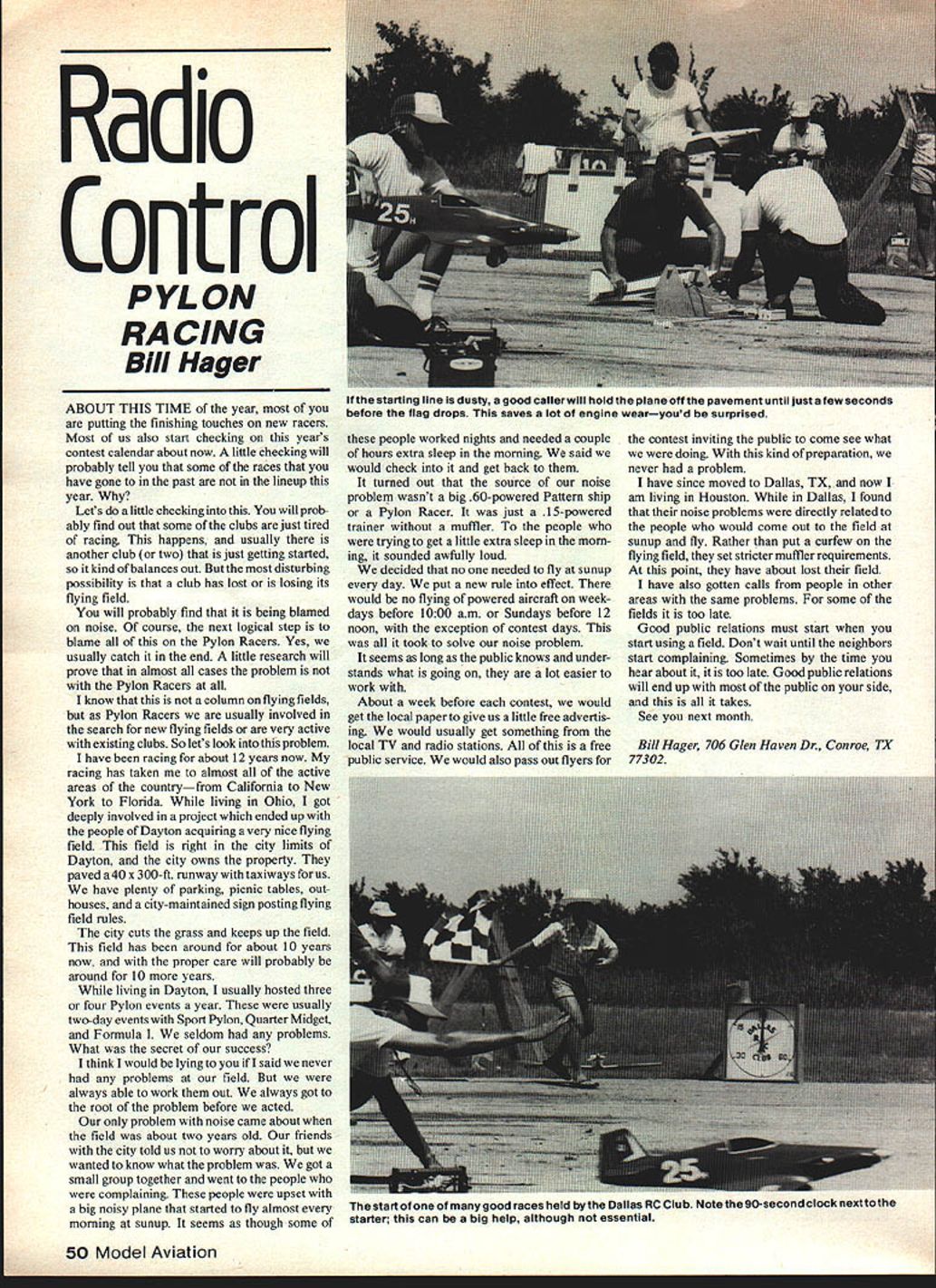 Radio Control PYLON RACING Bill Hager ABOUT THIS TIME year putting finishing touches new racers Most us also start checking years contest calendar about now little checking will probably tell some races have gone past lineup year Lets little checking will proW ably find out some clubs just tired racing happens usually another club two just getting started kind balances out disturbing possibility club has lost losing its flying field will probably find being blamed noise course next logical step blame Pylon Racers Yes usually catch end little research will prove almost cases problem Pylon Racers know column flying fields Pylon Racers usually involved search new flying fields very active existing clubs So lets look problem have racing about 12 years now racing has taken almost active areas countryfrom California New York Florida living Ohio got deeply involved project ended up people Dayton acquiring very nice flying field field right city limits Dayton city owns property paved 40 x 300-ft runway taxiways us have plenty parking picnic tables outhouses city-maintained sign posting flying field rules city cuts grass keeps up field field has around about 10 years now proper care will probably around 10 years living Dayton usually hosted three four Pylon events year usually two-day events Sport Pylon Quarter Midget Formula seldom problems What secret success think would lying said never problems field always able work out always got root problem before acted problem noise came about field about two years old friends city told us worry about wanted know what problem got small group together went people complaining people upset big noisy plane started fly almost morning sunup seems though some people worked nights needed couple hours extra sleep morning said would check get back turned out source noise problem wasnt big 60-powered Pattern ship Pylon Racer just 15-powered trainer muffler people trying get little extra sleep morn ing sounded awfully loud decided no needed fly sunup day put new rule effect would no flying powered aircraft week days before 1000 am Sundays before 12 noon exception contest days took solve noise problem seems long public knows under stands what going lot easier work About week before contest would get local paper give us little free advertis ing would usually get something local TV radio stations free public service would also pass out flyers contest inviting public come see what doing kind preparation never problem have since moved Dallas TX now am living Houston Dallas found noise problems directly related people would come out field sunup fly Rather put curfew flying field set stricter muffler requirements point have about lost field have also gotten calls people other areas same problems some fields too late Good public relations must start start using field Dont wait until neighbors start complaining Sometimes time hear about it too late Good public relations will end up public side takes See next month 50 Model Aviation starting line dusty good callerwill hold plane off pavement until just few seconds before flag drops saves lot engine wearyoud surprised Bill Hager 706 Glen Haven Dr Con roe TX 77302 start good races held Dallas RC Club Note 90-second clock nexttothe starter can big help although essential