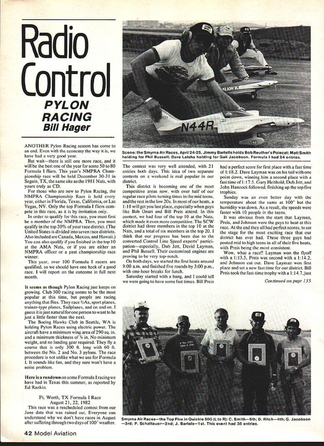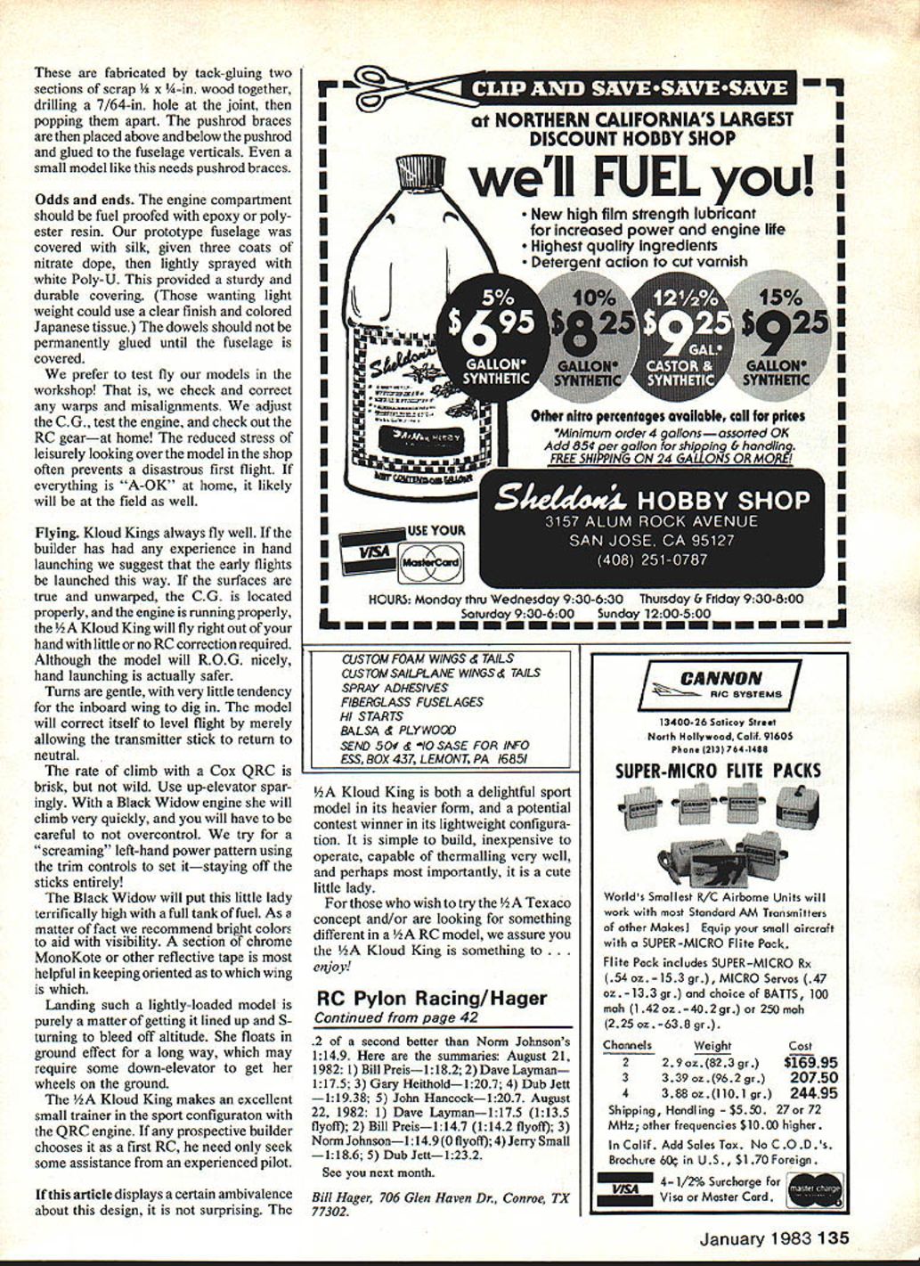 Radio Control PYLON RA CING Bill Hager ANOTHER Pylon Racing season has come end economy way have very good year waitthere still race will best year some 50 80 Formula fliers years NMPRA Cham pionship race will held December 30-3 1 Seguin TX same site 1981 Nats yours truly CD new Pylon Racing NMPRA Championship Race held year either Florida Texas California Las Vegas NV Only top Formula fliers com pete race invitation order qualify race must first member NMPRA must qualify top 20% race district United States divided seven race districts Also included Canada Mexico Hawaii can also qualify finished top 10 AMA Nats either NMPRA officer past championship race winner year over 100 Formula racers qualified should have heck good race will report outcome full next month seems though Pylon Racing just keeps growing Club 500 racing seems popular time people racing anything flies race As sport planes trainer-type planes Sailplanes on guess just natural person want just little faster next Boeing Hawks Club Seattle WA holding Pylon Races using electric power aircraft have minimum wing area 290 sq minimum thickness 7/ No minimum weight no landing gear required fly course 300 ft long 60 ft between No 2 No 3 pylons race procedure unlike what use Formula sounds like fun sure wont have noise problem rundown some Formula racing have Texas summer reported Ed Rankin Ft Worth TX Formula Race August 21 22 1982 race rescheduled contest June date rained out Everyone can understand dont have races August after suffering through two days 1000 weather contest very well attended 21 entries both days idea two separate contests weekend real popular district district becoming competitive areas now over half regular race pilots tuming times mid teens rest low 20s Inmost heats 118 will get last place especially guys like Bob Onari Bill Preis attend contest four top 10 Nats made competitive SCW district three members top 10 Nats total six members top 20 think progress has due converted Control Line Speed experts partici pationespecially Dub Jett David Layman Phil Bussell customized engines proving very top-notch both days started first heats around 900 am finished five rounds 300 pm one-hour breaks lunch Saturday started bang could tell going have some fast times Bill Preis perfect score first place fast time 1182 Dave Layman tail point down winning him second place fast time 1175 Gary Heithold Dub Jett John Hancock followed finishing up top five trophies Sunday better day temperature about same 1000 humidity down As result speeds faster 10 people teens obvious start Layman Preis Johnson guys beat race end perfect scores set stage exciting race district has ever three guys posted mid high teens five heats Preis being consistent Wow what race! Layman won flyoff 1135 Preis second 1142 Johnson cut out Dave Layman won first place set new fast time district Bill Preis took fast-time trophy 11 47just Continued page 135 42 Model Aviation Scene Smyrna Air Races April 24-25 Jimmy Bartells holds Bob Reuthers Polecat Mast Smith holding Phil Bussell Dave Latsha holding Gail Jacobson Formula 24 entries Smyrna Air Racesthe Top Five Quickie 500 L R C SmithSth D Ritch4th G Jacobson 3rd P Schattauer2nd J Bartels1 st event 35 entries fabricated tack-gluing two sections scrap 4-jn wood together drilling 7/64-in hole joint popping apart pushrod braces placed above below pushrod glued fuselage verticals small model like needs pushrod braces Odds ends englne compartment should fuel proofed epoxy poly ester resin prototype fuselage covered silk given three coats nitrate dope lightly sprayed white Poly-U provided sturdy durable covering wanting light weight could use clear finish colored Japanese tissue dowels should permanently glued until fuselage covered prefer test fly models workshop check correct warps misalignments adjust CG test engine check out RC gearat home reduced stress leisurely looking over model shop often prevents disastrous first flight everything A-OK home likely will field well Flying Kloud Kings always fly well builder has experience hand launching suggest early flights launched way surfaces true unwarped C G located properly engine running properly Kloud King will fly right out hand little no RC correction required Although model will ROG nicely hand launching actually safer Turns gentle very little tendency inboard wing dig model will correct itself level flight merely allowing transmitter stick return neutral rate climb Cox QRC brisk wild Use up-elevator spar ingly Black Widow engine will climb very quickly will have careful overcontrol try screaming left-hand power pattern using trim controls set itstaying off sticks entirely Black Widow will put little lady terrifically high full tank fuel As matter fact recommend bright colort aid visibility section chrome MonoKote other reflective tape helpful keeping oriented wing Landing such lightly-loaded model purely matter getting lined up 5turning bleed off altitude floats ground effect long way may require some down-elevator get wheels ground Kloud King makes excellent small trainer sport configuraton QRC engine prospective builder chooses first RC need seek some assistance experienced pilot article displays certain ambivalence about design surprising NORTHERN CALIFORNIAS LARGESTU DISCOUNT HOBBY SHOPI well FUELyou New high film strength lubricantU increased oower engine lifeI Highest ingredients Deter cut varnish I J II II II II II II II II II II II IHOURS Monday thru weonescay Y3u-OJu inursaoy C rrioay YU-OUu3 L m - m Saturdoy9306OO nday 12OOOO - AA Kloud King both delightful sport model its heavier form potential contest winner its lightweight configura tion simple build inexpensive operate capable thermalling very well perhaps importantly cute little lady wish try AA Texaco concept and/or looking something different RC model assure Kloud King something enjoy RC Pylon Racing/Hager Continued page 42 2 second better Nonn Johnsons 1149 summaries August 21 19821 Bill Preis 1182 2