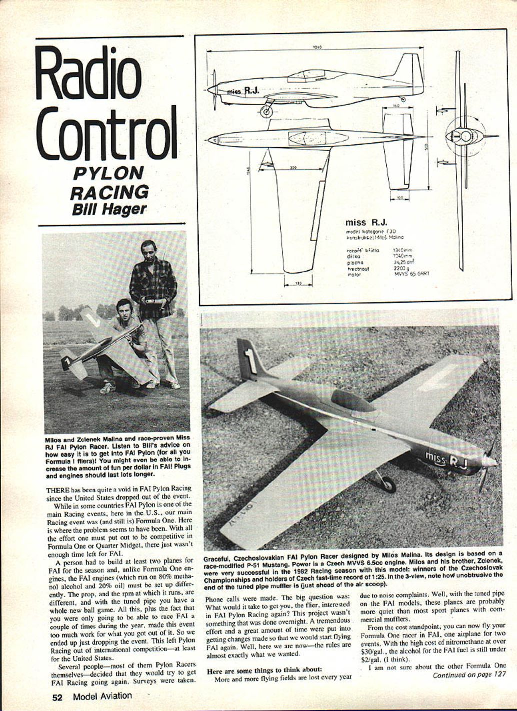 Radio Control PYLON RA CING Dill Hager THERE has quite void FM Pylon Racing since United States dropped Out event tome countries FAL Pylon main Racing events US main Racing event still Formula problem seems have effort must put out competitive Formula Quarter Midget just wasnt enough time left FAI person build least two planes FAI season unlike Formula en gines FAI engines run 80% metha nol alcohol 20% oil must set up differ ently prop rpm runs different tuned pipe have whole new ball game plus fact going able race FAI couple times during year made event too much work what got out So ended up just dropping event left Pylon Racing out international competitionat least United States Several peoplemost Pylon Racers themselvesdecided would try get FAI Racing going again Surveys taken Phone calls made big question What would take getyou flier interested FAI Pylon Racing again project wasnt something done overnight tremendous effort great amount time put getting changes made would start flying FAI again Well arc nowthe rules almost exactly what wanted some things think about flying fields lost year due noise complaints Well tuned pipe FAI models planes probably quiet sport planes com mercial mufflers cost standpoint can now fly Formula racer FAI airplane two events high cost nitromethane over $30/gal alcohol FAI fuel still under $2/gal think am sure about other Formula Continued page 127 52 Model Aviation go miss RJ model kate5oj fl30 koosfrjkce 01o2 MOIoa rozpt kdta1340 ore 1340ror, plocho3420 hrnotrost2200 motorMVVS 50 GRRT Milos Zclenek Maims race-proven Miss RJ PAl Pylon Racer Listen Bills advice easy get FAI Pylon Formula tllersI might able crease amount fun per dollar FAIl Plugs engines should last lots longer ii Graceful Czechoslovaklan PAl Pylon Racer designed Milos Maims Its design based race-modified P-Si Mustang Power Czech MVVS 65cc engine Milos brother Zclanek very successful 1982 Racing season model winners Czechoslovak Championships holders Czech fast-time record 125 3-view note ho unobtrusive end tuned pipe muffler just ahead air scoop Enon OH Alden Shipp WB9WAJ Quincy IL Dan Pruss 131 E Penningion Ln Plainfield IL 60544 RC Giant Scale/Beckman Continued page 49 didnt say assume will have Toledo Hobbypoxy scale colors Last June 1 got letter Bob Pettit Pettit Paint Company Inc people make Hobbypoxy wrote tell about project under way provide paint-mixing formulas help Scale modelers re produce accurate color schemes Since museumscale accuracy prime concern Giant Scale modeling other items kept pushing down list things tell about program has reported detail Scale columns various magazines will just outline What boils down Hobbypoxy has researched colors used various aircraft lets say example WW II RAF colors labs have determined exact mixture standard Hobbypoxy colors needed match show works formula Dark Green colors used upper surfaces Hurricanes Spitfires during Battle Britain 6 parts 1166 Dark Red 2 parts H33 Stinson Green part 1149 Cub Yellow part H81 Black part 1110 White Mix together mix Flat Hardener thing sure would never have thought produce shade green starting lots dark red month get another note two three color formulas So far have WW Ilor latercoiors program continues wont long before almost color need will have figured out assume writing Hobbypoxy will let find out have colors need will probably put list future Im hoping get work out colors need Sparrowhawk Super SunRay plans Super SunRay semi-scale model patterned after small biplane racer called Sorceress original Ron Mangums model incorporate several unusual features including reverse stagger inverted gull lower wing no struts kind upper wing mounted shoulder position fuselage inverted gull dihedral lower wing provides proper wing gap same time allows use very short landing gear legs unusual quite practi cal design upper wingspan 6 ft 4 14-in chord lower wing somewhat smaller fuselage over 6-ft long 5-in wide 10Y2-in deep Rons original powered Quadra flies very well dont know what weighs plans 1 would estimate 18 20 lb plans drawn Calvin Clark con sist two sheets approximately 3 ft 7 ft first impression didnt have much detail two reasons construc tion really quite simple Ron Calvin must have assumed very experienced modelers would using plans examle dowels shown leading edge wing anchors trailing edges simply note about using nylon screws hold wing no detail shown no detail engine radio installation things wont bother experienced builder could Nor~ AVIONIUS J&AcH INC ACCUETACH 1 LCITALqMoMITOR DIR~TER GE TACHof CHARto get G& Determ ne state d Makes t possIble Select idle thIiJof yoUf N9 accuratecharge5 wsafely J5 Jtd adjUStmebatter~pack nflharg scale r 100 cycle Ch~bat watChI~~ig nals dUa1ox x out bi1t pfeCI terY combo5ffl charge 5jQfl electronics ORDER YOURS NOW 79id Send check money order no 000s NorCal AVIONICS Inc PO Box 70956 yvale CA 94086California residents add 6% tax Add $300 shipping outside continental USADealer inquiries invited real stumbling blocks beginner construction really quite straightforward simple using common sport RC techniques Except spars hardwood plywood balsa lots Some substitutions cheaper materials could save lot money example -in sheet balsa fuselage sides could replaced door-skin ply backed up -in sq spruce longerons balsa formers ribs could cut foam core board dont mean criticism design just hints accomplish same thing having mortgage farm Super SunRay uncommon design very good flier wont see sitting next field plans available Ron Mangum PO Box 8244 Greensboro NC 27410 Waco UPF-7 plans UPF-7 opencockpit biplane similar contemporary PT-17 have soft spot heart aircraft because first open biplane ever flew got private ticket late Forties small field near Portsmouth VA field like era now covered houses Anyway owner field addition Aeronca Champs used training two airplanes really intrigued clipped-wing Monocoupe restoring other operational UPF-7 owner really wrapped up Monocoupe built di