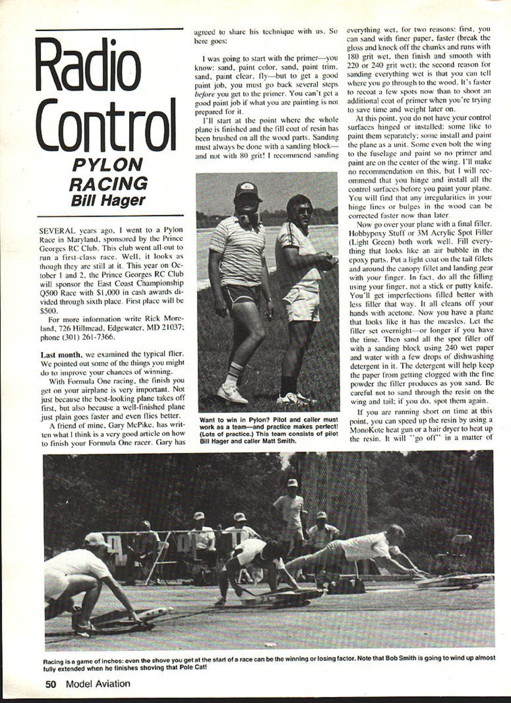 Radio Control PYLON RACING Bill Hager SEVERAL years ago went Pylon Race Maryland sponsored Prince Georges RC Club club went all-out run first-class race Well looks though still year Oc tober 1 2 Prince Georges RC Club will sponsor East Coast Championship Q500 Race $1 000 cash awards di vided through sixth place First place will $500 information write Rick land 726 Hillmead Edgewater MD 21037 phone 301 261-7366 Last month examined typical flier pointed out some things might improve chances winning Formula racing finish get airplane very important just because best-looking plane takes off first also because well-finished plane just plain goes faster flies better friend Gary McPike has writ ten what think very good article finish Formula racer Gary has agreed share technique us So goes going start primeryou know sand paint color sand paint trim sand paint clear flybut get good paint job must go back several steps before get primer cant get good paint job what painting prepared Ill start point whole plane finished fill coat resin has brushed wood parts Sanding must always done sanding blockand 80 rit recommend sanding everything wet two reasons first can sand finer paper faster break gloss knock off chunks runs ISO grit wet finish smooth 220 240 grit wet second reason sanding everything wet can tell go through wood Its faster recoat few spots now shoot additional coat primer youre trying save time weieht later point have control surfaces hinged installed some like paint separately some install paint plane unit Some bolt wing fuselage paint no primer paint center wing Ill make no recommendation will rec ommend hinge install control surfaces before paint plane will find irregularities hinge lines bulges wood can corrected faster now later Now go over plane final filler Hobbypoxy Stuff 3M Acrylic Spot Filler Light Green both work well Fill thing looks like air bubble epoxy parts Put light coat tail fillets around canopy fillet landing gear finger fact filling using finger stick putty knife Youll get imperfections filled better less filler way cleans off hands acetone Now have plane looks like has measles Let filler set overnightor longer have time sand spot filler off sanding block using 240 wet paper water few drops dishwashing detergent detergent will help keep paper getting clogged fine powder filler produces sand careful sand through resin wing tail spot again running short time point can speed up resin using MonoKote heat gun hair dryer heat up resin will 'go off matter 50 Model Aviation Want win Pylon Pilot caller must work teamand practice makes perfect Lots practice team consists pilot Bill Hager caller Man Smith Racing game inches shove get start race can winning losing factor Note Bob Smith going wind up almost fully extended finishes shoving Pole Cat minutes careful get too hot may cause warps wood melt foam under wood wing Now should have whole plane sanded minor nooks crannies filled sanded flat smooth critical part painting model plane preparation plane smooth paint oes smooth paint will show imperfections under good light paint job about 012 thick So have much play painting Im going get painting jigs should have some way hold ing parts plane paint Mask off canopy recommend Scotch 33 trical tape Its flexible leaves good clean paint line Clean plane alcoholnot ace tone alcohol Rubbing alcohol can found drug store Methanol works better since does leave resi due Clean parts least twice Dont forget hinge lines inside elevators next fuselage use about four paper towels wing about same fuselage After plane its parts clean ready primer recommend K&B primer Its easy find hobby store fuel-proof first coat primer should thinned least 50% will fill pin holes shoot spray 25 30 lb pressure light coat will dodont put heavy coat After have sprayed go over surface finger work primer larger pinholes filled spraying cant get pinholes dont worry well get later Let first coat tack about 20 minutes second coat should shot about 35 lb air add some talcum powder primer help build up better sand faster second coat should heavy can get plane Youll prob ably get some small runs Dont worry gong sand off anyway should have shot mixed primer onto plane Take what left put freezer wife will let will keep about two weeks can used later get dings plane Let primer dry indoors out sun least 36 hours Now get out trusty sanding block water dish sand off planning painting K&B Superpoxy 400 paper should used going use acrylic enamels urethane paints use 360 paper can found auto paint stores Sand much primer off can primed airplane should pick up 1 1 oz weight between finished-ready-for-paint primer-sandedready-for-color will make differ ence between light very light airplane believe Some builders go back over airplane very light coat primer after first Continued page 140 Compact Versatile Durable Hauls 2 planes plus gear equipment will need field customize inside hangers tool box etc meet need Send $100 information August 1983 51 rlease seno me byron uriginals catalogs $500 Catalog price will credited towards initial purchase Name -- ____ -_____ Phone--____ Street RFD . ___ Apt# ____ City___ .StateZip - _____ have enclosed check money order 5 Please charge MC__ Exp VISAS. Eap -Iowa Residents Add 3% Sales Tan Prices Subject Change Without Notice Send BYRON ORIGINALS PO Boa 279 Ida Grove Iowa 51445 Ph 712-364-3165 RIC MODEL TRANSPORTER$570 plus shipping X-HAUL ER PO Box 185 Box Size 4xlOx30HighConstantine Maintenance Free Aluminum ExteriorMI 4904 Wood Box ConstructionCall 616 4356905 Steel Running Gear RC Giant Scale/Beckman Continued page 137 handling plans shipped rolled mailing tubes An SASE above ad dress will get complete list plans Grumman F-7-F Tigercat first Bob Campbells Giant Scale multiengine aircraft Since Tigercat has built famous B-29 now new C-130 Hercules planes like aren t everybody certainly fas cinating Bobs Tigercat weighs 65 lb spans 9 ft powered two Q-35 Quadras two Quadras available now have differ