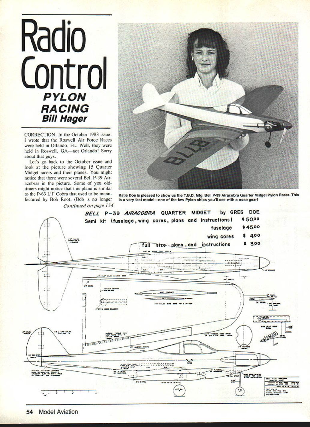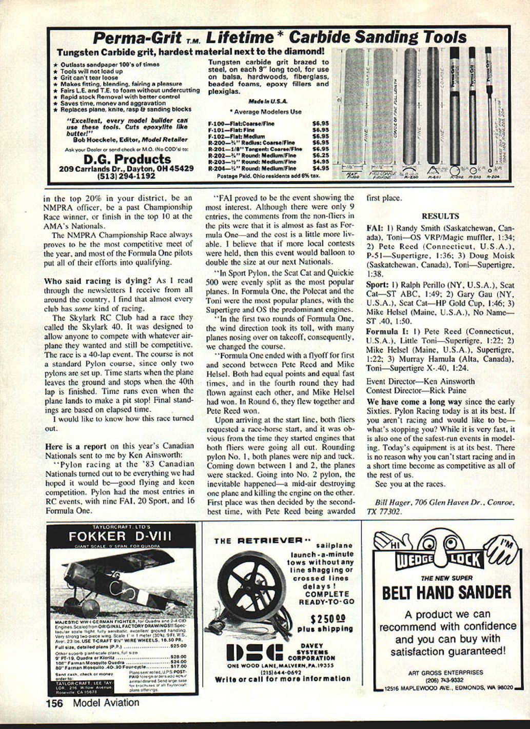 Radio Control PYLON RA CING Bill Hager CORRECTION October 1983 issue wrote Roswell Air Force Races held Orlando FL Well held Roswell GAnot Orlando Sorry about guys Lets go back October issue look picture showing 15 Quarter Midget racers planes might notice several Bell P-39 Air acobras picture Some oldtimers might notice plane similar P-63 Lil Cobra used manu factured Bob Root Bob no longer Continued page 154 BELL P39 AIRACOBRA QUARTER MIDGET GREG DOE Semi kit fuselage wing cores plans instructions $ 5000 fuselage$4500 wing cores$ 400 TTlTsiz~pI9ns i structions 300 /~ 54 Model Aviation Katie Doe pleased show us TBD Mfg Bell P-39 Airacobra Quarter Midget Pylon Racer very fast modelone few Pylon ships youll see nose gearl bust first pilot produced /3-scale 12-in tall sitting position weighs 15 oz civilian type open-necked shin trousers belt shoes New figures follow 1983 -scale civilian A-scale civilian A-scale WW II Navy Price A-scale pilot kit $1995 plus $2 shipping William M Hawke 7148 Lasting Light Way Columbia MD 21045 Bob Dolly Wiseher S-22 Lapham Peak Rd Delafield WI 53018 RC Soaring/Pruss Continued paae 53 16-in neck screw secures nose cover place whole unit joints waterproof Two five servos actuate flap erons another used rudder flap erons coupled will rudder used flaps set three tasks horizontal stabilizer automatically trimmed compensate initial center-of-lift changes thewing fourth servo horizontal stab fifth both spoilers re leasable towline Instead tow-ring RaIf uses steel ball attached cable ball about /4-in diameter locked up inside fuselage plungertype device during tow Linkages adjusted tow release occurs spoilers still remain closed ball/ socket device fuselage perfectly clean bottom next photo shows cutaway one-piece wing made twopiece molda top half bottom half method construction includes three degrees dihedral wing Note carbon fiber main spar ward spar fiberglass ballast tube Also note exactness fit tubular leading edge flaperon tube hard aluminum used making arrow shafts Hinging means Robart-type pin hinge bottom skin surface top skin surface made up two skins fiberglass sandwiched around material called Rohacell similar skin construc tion Spartakus sandwiched glass around balsa wing no structural spars styrofoam keep top bottom halves separate added carbon fiber Rohacell Ralfs plane give wing calculated strength 40 Gs plane weight 35 kilogramsor wing can withstand over 300-pound load RaIf doesnt seem too concerned about wing flex anymore last photo shows spoilers actu ated ballast tubes loaded threaded retainers knurled knobs used secure ballast slugs finishing touch werent really expecting quarterin square spruce crammed now internal S-shaped piece forward spar pre molded fiberglass piece acting stiffener two holes close wing centerline allow access actuator arms spoil ers flaperon horns inside fuse lage Conventional flap construction hinging wouldnt allow operation twisting flap under heavy airloads type wing construction carried out flaperons During contest York Dieter Pfef ferkorn book Deckers Model volume about -in thick documented calculations used design plane Included construc tion techniques photos construction drawings detailed linkages fit tings book open anyone interested model Whoever said nice guys finish last didnt know Raif Decker continue refer exquisite cre ation RaIfs ModeL like calling Mona Lisa Leonardos Painting Maybe can suggest appropriate name Ill happy pass Good lift Dan Pruss 131 E Pennington Ln Plainfield IL 60544 RC Pylon Racing/Hager Continued oaae 54 manufacturing plane However Bell P-39 Airacobra ing produced limited-production basis TBD Manufacturing Company Rt No 4 166 Pony Drive Smyrna TN 37167 phone 615-459-6845 limited supply Pylon Racing engines planes market always glad see someone else get manufacturing new product Formula fliers years NMPRA Championship Race going held October 22-23 San Luis Obispo CA new Formula Onein order qualify NMPRA Cham pionship Race must first NMPRA member addition must either finish Continued page 156 154 Model Aviation FULL LINE METAL SPECIALISTS Magic Dragon Trainer Fir Fox Pro-Built Price $9995 Engine 25 cu Pro-Built Price $12495 Engine 40 cv Wing Span 55 Radio 3 4 Channels ng Span 52 Radio 4 Channels belsa consttuction Reedy fine send end coverAll balsa construction Reedy tine send cover Control surf aces hinged Hoflco landing geer 5/32 noseControl surfaces hinged Has bolt-on wing end Hoilco Inn gear strut Fitted canopy Instruction booklet end hardding gear ADS wheel pants mounted axels instelled includedFitted canopy Instruction booklet herdwero included RO Send check MO Credit Cards accepted Add $850 UPS shipping 350P51 carton FL ron odd 5% tax ADEALER INQUIRIES INVITED6 Other ModelsSend Free Brochure ECH A/C 3850 US Hwy 19 No. Palm Harbor Florida 33563813 938-3266 Perma-Grit TM Lifetime * Tungsten Carbide grit hardest material next diamond * Outlasts sandpaper 100s times * Tools will load up * Grit cant tear loose * Makes fitting blending fairing pleasure * Fairs LE TE foam undercutting * Rapid stock Removal better control * Saves time money aggravation * Replaces plane knite rasp ing blocks Excellent model builder call use tools Cuts epoxylite like butter Bob Hoeckele Editor Model Retailer Ask Dealer send check MD No CODs DG Products 209 Carrlands Dr Dayton OH 45429 513 294-1192 Tungsten carbide grit brazed steel 9 long tool use balsa hardwoods fiberglass beaded foams epoxy fillers plexiglas Made Ia USA * Average Modelers Use F-100FlatCoarselFle$895 F-101Flat FIne$695 F-102Flat MedIum$695 R-200 Radkms CoarselFlne$695 R-2011I5 Tangeet CoarsetFlne$695 R-202 Round MadumlFlee$625 R-203 Round MedlumlFlne$495 R-204 Round Medum/FIne$495 Postage Paid Ohio residents add 6% tas top 20% district NMPRA officer past Championship Race winner finish top 10 AMAs Nationals NMPRA Championship Race always proves competitive meet year Formula pilots put efforts qualifying said racing dying As read through newsle