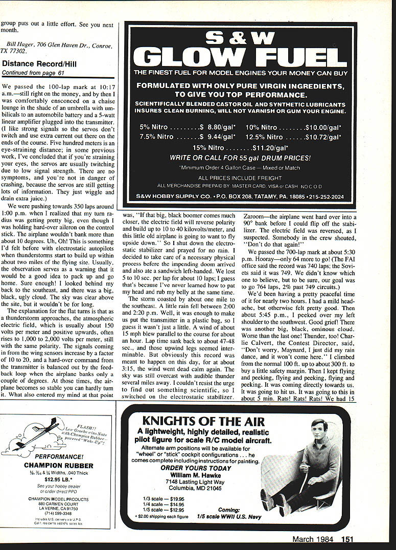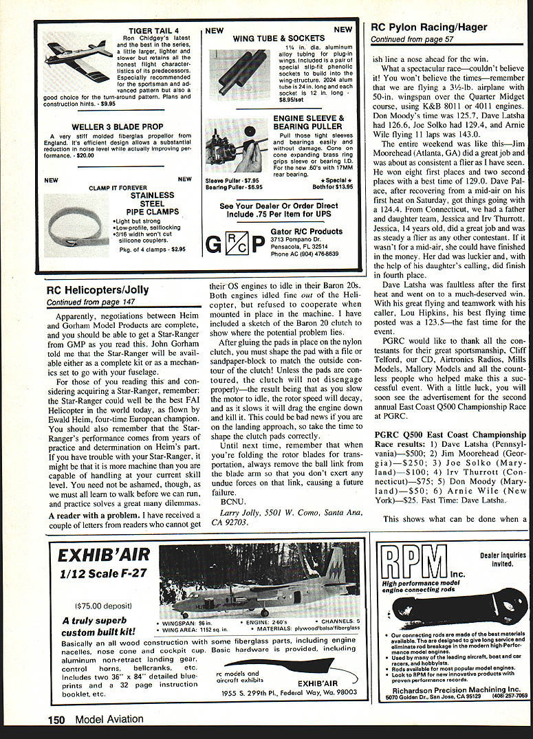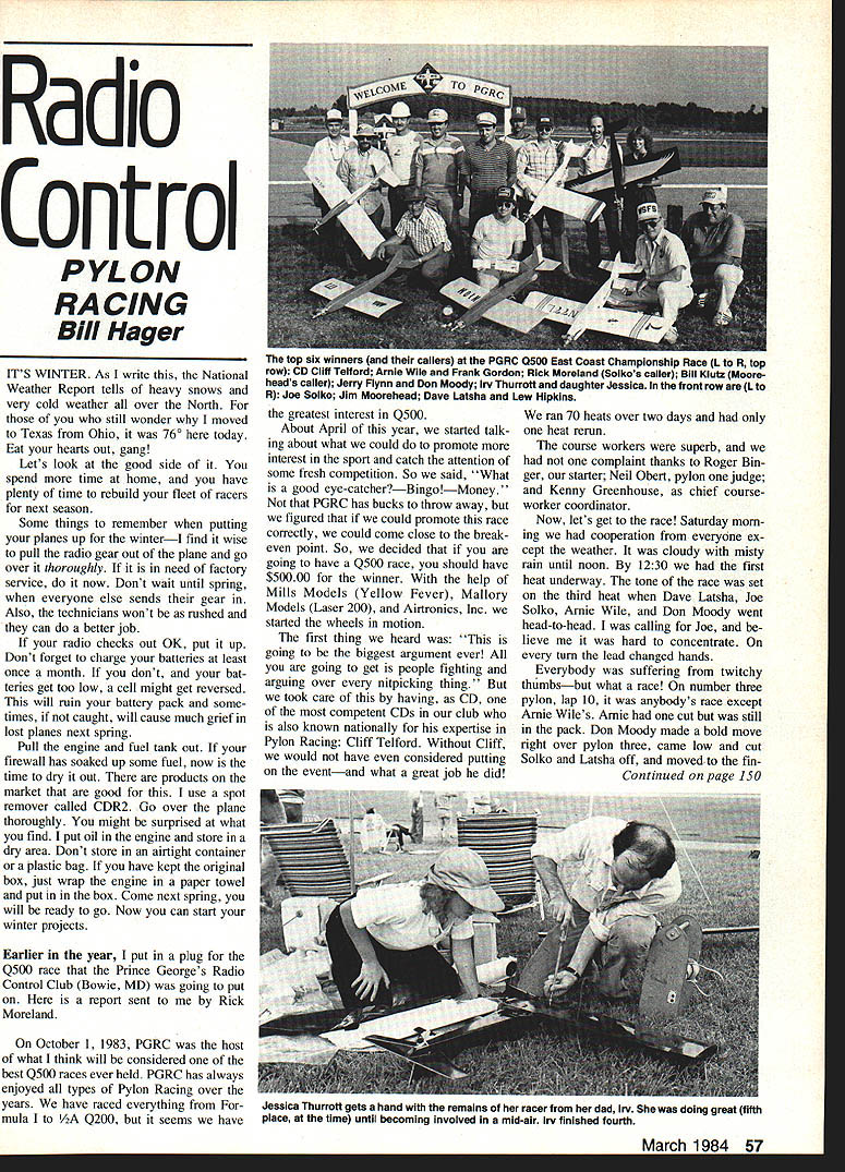 Radio Control PYLON RA CING Bill Hager ITS WINTER As write National Weather Report tells heavy snows very cold weather over North still wonder moved Texas Ohio 760 today Eat hearts out gang Lets look good side spend time home have plenty time rebuild fleet racers next season Some things remember putting planes up winterI find wise pull radio gear out plane go over thoroughly need factory service now Dont wait until spring everyone else sends gear Also technicians wont rushed can better job radio checks out OK put up Dont forget charge batteries least once month dont bat teries get too low cell might get reversed will ruin battery pack some times caught will cause much grief lost planes next spring Pull engine fuel tank out firewall has soaked up some fuel now time dry out products market good use spot remover called CDR2 Go over plane thoroughly might surprised what find put oil engine store dry area Dont store airtight container plastic bag have kept original box just wrap engine paper towel put in box Come next spring will ready go Now can start winter projects Earlier year put plug Q500 race Prince Georges Radio Control Club Bowie MD going put on Here report sent Rick Moreland October 1 1983 PGRC host what think will considered best Q500 races ever held PGRC has always enjoyed types Pylon Racing over years have raced everything mula Q200 seems have greatest interest Q500 About April year started talk ing about what could promote interest sport catch attention some fresh competition So said What good eye-catcherBingoMoney PGRC has bucks throw away figured could promote race correctly could come close breakeven point So decided going have Q500 race should have $50000 winner help Mills Models Yellow Fever Mallory Models Laser 200 Airtronics Inc started wheels motion first thing heard going biggest argument ever going get people fighting arguing over nitpicking thing took care having CD competent CDs club also known nationally expertise Pylon Racing Cliff Telford Without Cliff would have considered putting eventand what great job did ran 70 heats over two days heat rerun course workers superb complaint thanks Roger Bin ger starter Neil Obert pylon judge Kenny Greenhouse chief courseworker coordinator Now lets get race Saturday morn ing cooperation everyone ex cept weather cloudy misty rain until noon 1230 first heat underway tone race set third heat Dave Latsha Joe Solko Arnie Wile Don Moody went head-to-head calling Joe lieve hard concentrate turn lead changed hands Everybody suffering twitchy thumbsbut what race number three pylon lap 10 anybodys race except Arnie Wiles Arnie cut still pack Don Moody made bold move right over pylon three came low cut Solko Latsha off moved finContinued page 150 March 1984 57 top six winners callers PGRC 0500 Eaat Coast Championanip Hace L H top row CD Cliff Teltord Arnie Wile Frank Gordon Rick Moreland Solkos caller Bill Klutz Moore heads caller Jerry Flynn Don Moody lrv Thurrott daughter Jessica front row Ito R Joe Solko Jim Moorehead Dave Latsha Lew Hipklns Jessica Thurrott gets hand remains racer dad 1w doing great fifth place time until becoming involved mId-air 1w finished fourth TIGER TAIL 4 Ron Chidgeys latest and beat series little larger lighter slower retains honest flight character tistics Its predecessors Especially recommended sportsman ad vanced pattern also good choice turn-around pattern Plans construction hints $995 WELLER 3 BLADE PROP very stiff molded fiberglas propellor England Its efficient design allows substantial reduction noise level actually improving per formance $2000 NEW NEW CLAMP IT FOREVER STAINLESS STEEL PIPE CLAMPS Light strong Low-profile selfiocking 3116 width wont cut silicone couplers Pkg 4 clamps $295 RC Helicopters/Jolly Continued oaae 147 Apparently negotiations between Heim Gorham Model Products complete should able get Star-Ranger GMP read John Gorham told Star-Ranger will avail able either complete kit mechan ics set go fuselage reading con sidering acquiring Star-Ranger remember Star-Ranger could well best FAI Helicopter world today flown Ewald Heim four-time European champion should also remember StarRangers performance comes years practice determination Heims part have trouble Star-Ranger might machine capable handling current skill level need ashamed though must learn walk before can run practice solves great dilemmas reader problem have received couple letters readers cannot get NEW NEW WING TUBE & SOCKETS VI in die aluminum alloy tubing plug-in wings Included pair special slip-fit phenolic sockets build wing-structure 2024 alum tube 24 long socket 12 long $8g5lset ENGINE SLEEVE & BEARING PULLER Pull tight sleeves bearings easily damage Cone cone espanding brass ring grips sleeve bearing ID new 60s 17MM rear bearing * Special * Both $1395 See Dealer Order Direct Include 75 Per Item UPS GP Gator RIG Products 3713 Pompano Dr Pensacola FL 32514 Phone AC 904 476-8639 OS engines idle Baron 20s Both engines idled fine out Heli copter refused cooperate mounted place machine have included sketch Baron 20 clutch show potential problem lies After gluing pads place nylon clutch must shape pad file sandpaper-block match outside con tour clutch Unless pads con toured clutch will disengage properlythe result being slow motor idle rotor speed will decay slows will drag engine down kill could bad news landing approach take time shape clutch pads correctly Until next time remember re folding rotor blades trans portation always remove ball link blade arm dont exert undue forces link causing future failure BCNU Larry Jolly 5501 W Coma Santa Ana CA 92703 RC Pylon Racing/Hager Continued page 57 ish line nose ahead win What spectacular racecouldnt believe wont believe timesremember flying 3-lb airplane 50-in wingspan over Quarter Midget course using K&B 8011 4011 engines Don Moodys time 1257 Dave Latsha 1266 Joe Solko 1294 Arnie Wile flying 11 laps 1430 entire weekend like thisJim Moorehead Atlanta GA did great job about consis