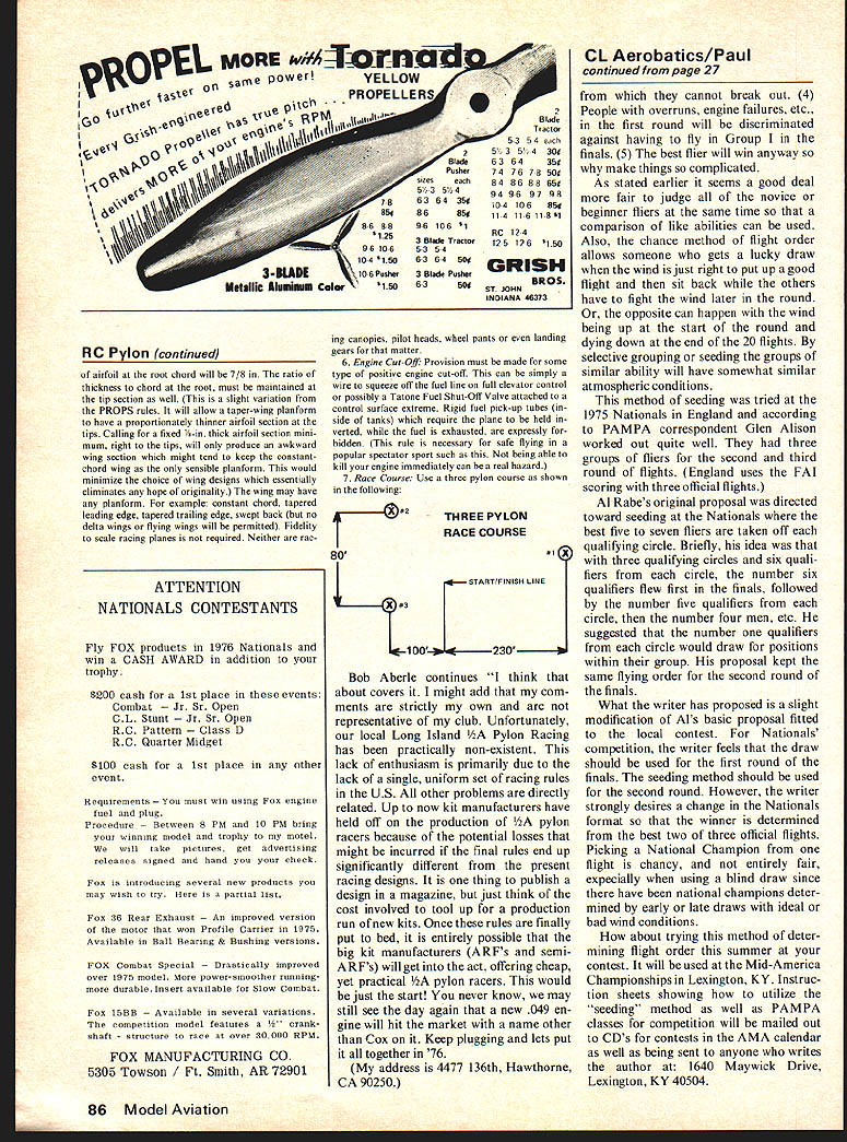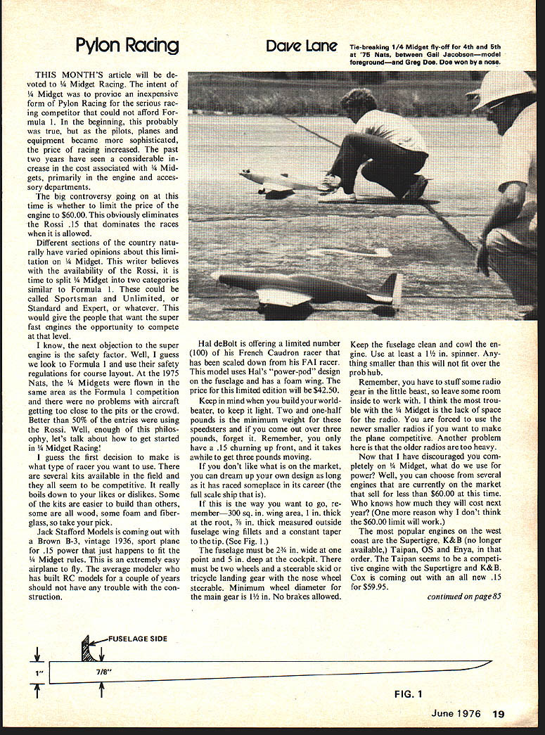 Pylon Racing THIS MONTHS article will de voted et Racing intent Midget provioe inexpensive form Pylon Racing serious rac ing competitor could afford mula 1 beginning probably true pilots planes equipment became sophisticated price racing increased past two years have seen considerable crease cost associated gets primarily engine acces sory departments big controversy going time whether limit price engine $6000 obviously eliminates Rossi 15 dominates races allowed Different sections country natu rally have varied opinions about limi tation et writer believes availability Rossi time split et two categories similar Formula 1 could called Sportsman Unlimited Standard Expert whatever would give people want super fast engines opportunity compete level know next objection super engine safety factor Well guess look Formula 1 use safety regulations course layout 1975 Nats ets flown same area Formula 1 competition no problems aircraft getting too close pits crowd Better 50% entries using Rossi Well enough philos ophy lets talk about get started et Racing guess first decision make what type racer want use several kits available field seem competitive really boils down likes dislikes Some kits easier build others some wood some foam fiber glass take pick Jack Stafford Models coming out Brown B-3 vintage 1936 sport plane 15 power just happens fit Midget rules extremely easy airplane fly average modeler has built RC models couple years should have trouble con struction Dave Lane Hal deBolt offering limited number 100 French Caudron racer has scaled down FAI racer model uses Hals power-pod design fuselage has foam wing price limited edition will $4250 Keep mind build worldbeater keep light Two one-half pounds minimum weight speedsters come out over three pounds forget Remember have 15 churning up front takes awhile get three pounds moving dont like what market can dream up own design long has raced someplace its career full scale ship way want go re member300 sq wing area 1 thick root k measured outside fuselage wing fillets constant taper tip See Fig 1 fuselage must 2 wide point 5 deep cockpit must two wheels steerable skid tricycle landing gear nose wheel steerable Minimum wheel diameter main gear 1 No brakes allowed Tie-breaking 1/4 Midget fly-off 4th 5th 75 Nats between Gail Jacobsonmodel foregroundand Greg Doe Doe won nose Keep fuselage clean cowl en gine Use least 1 spinner Any thing smaller will fit over prob hub Remember have stuff some radio gear little beast leave some room inside work think trou ble et lack space radio forced use newer smaller radios want make plane competitive Another problem older radios too heavy Now have discouraged com pletely et what use power Well can choose several engines currently market sell less $6000 time knows much will cost next year reason dont think $6000 limit will work popular engines west coast Supertigre K&B no longer available Taipan OS Enya order Taipan seems competi tive engine Supertigre K&B Cox coming out new 15 $5995 continued page 85 FUSELAGE SIDE June1976 19 17/8 TFIG 1 improved Digital Commander 1-8 Receiver Kit features flat pack single board design space age CMOS IC decoder gives eight channel capability will operate either three four wire neg ative positive pulse servos Minimum drain 7 ma maximum noise immunity obtained CMOS ICs receiver will work modern digital trans mitter same frequency no matter what brand cause build yourself learn good deal about operation system troubleshoot Receiver kit less connectors switch batteries Available 27 53 72/75 MHz frequencies jection molded case measures 13/16 X 1 3/8 X 2 7/16 Weight 175 oz case connectors Get 76 catalog complete listing Digital Commander flite pak system kits 12G18 Digital Commander CMOS Single Deck Receiver Kit $3795 Add $500 72 MHz Please send complete catalog Enclosed $100 refunded first order Add $ 50 1st class mail return Name Address BOX 511 E HIGGINSVILLE MO 64037city State Zip RC Pylon/Lane continued page 19 rules state engine must stock use muffler carburetor must designed specific engine leaves glow plug play legally After install engine take care setting idle plane must stand rest idling help caller Usually means idle must below 4000 rpm other stickler engine must running until plane lands wheels touch runway plane quits flying cannot get away high-speed touch bounce land next coun ty get points landing engine running land dead stick lose point heat Some CDs will state contest flier will idle check before during after race prepared advantage idle rule keeps guys reasonably honest far engine concerned Unfortunately Rossi goes like h--- idles too Another rule makes conversa tion fact propeller must stock can sand blade back side balance manufacturers trade mark size must readable front blade Sneaky huh Top Flite 7-SN racing prop works well K&Bs Supertigres Rossi likes 7-5 Rev-up racing prop Some guys also have good luck 7-6 7-5 wide blade Top Flite props thing experiment until find works best Mufflers other bug-a-boo have master have good luck Du-Bro muffler uses series plates spaced washers secret use plates muf flers have about least amount drag light use rear exhaust port engine good luck other alterna tive race mufflers required has much criticism between NMPRA Y4 Midget fraternity over past year Now George Zink has brave enough step ward take job representing et group within NMPRA should see some improvement relations hope out Midget land will support George Zink have problems sugges tions sure contact him let him know views way can further great sport Pylon Racing received following set proposed Pylon rules Bob Aberle Haup pauge NY has touch PROPS Pylon Racers Puget Sound Bob supporting rules uniform standard country Any comments guys out land might have concerning rules would appreciated Pylon Racing Rules I General AMA FCC regulations covering flier aircraft equipment shall applicable event Simultaneous hand launch shall made participants race contestants partic ular ra