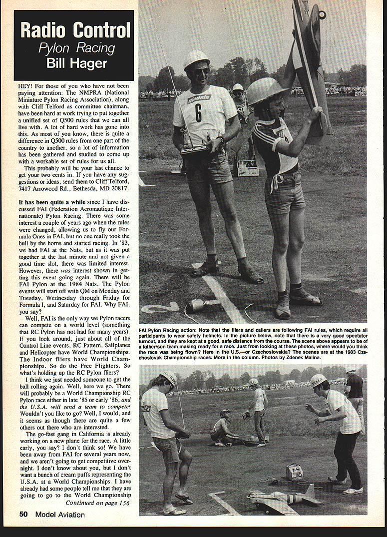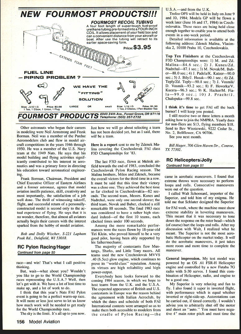 HEY have neen paying attention NMPRA National Miniature Pylon Racing Association along Cliff Telford committee chairman have hard work trying put together unified set Q500 rules can live lot hard work has gone As know quite difference Q500 rules part country another lot information has gathered studied come up workable set rules us probably will last chance get two cents have sug gestions ideas send Cliff Telford 7417 Arrowood Rd Bethesda MD 20817 has quite since have dis cussed FAI Federation Aeronautique Inter nationale Pylon Racing some interest couple years ago rules changed allowing us fly mula Ones FAI no really took bull horns started racing 83 FAT Nats put together last minute given good time slot limited interest However interest shown get ting event going again will FAT Pylon 1984 Nats Pylon events will start off QM Monday Tuesday Wednesday through Friday Formula Saturday FAT FAI say Well FAI way Pylon racers can compete world level something RC Pylon has years look around just about Control Line events RC Pattern Sailplanes Helicopter have World Championships Indoor fliers have World Cham pionships So Free Flighters So whats holding up RC Pylon fliers think just needed someone get ball rolling again Well go will probably World Championship RC Pylon race either late 85 early 86 USA will send team compete Wouldnt like go Well would seems though quite few others out interested go-fast gang California already working new plane race little early say dont think have away FAI several years now arent going get competitive over night dont know about dont want bunch cream puffs representing USA World Championships have already some people tell going go World Championship Continued page 156 50 Model Aviation FAI Pylon Racing action Note fliers callers following FAI rules require participants wear safety helmets picture below note very good spectator turnout kept good safe distance course scene above appears father/son team making ready race Just looking photos would think race being flown USor Czechoslovakia scenes 1983 Cze choslovak Championship races column Photos Zdenek Mailna NEW FOURMOST PRODUCTS! FOURMOST RECOIL TUBING four foot length super-tough fuel-proof urethanetubing pre-formed intoa FOUR-INCH COIL allows placement yourfield box can convenient distance aircraft boat After use tubing will retract its earlier space-saving form Price$395 Lr / WE HAVE THE FITTING SOLUTION ORsmallSize 1/16 IDPrice $150 1 Tee 2 Elbows Pen Bladder Tee IO1 CTs 4040 24th Ave. Forest Grove OR 97116 PROD U F URM Telephone 503 357-2732 Other astronauts began careers modeling Neil Armstrong Frank Borman Neil member Purdue Aeromodelers club flew model air craft competitions years 1946 through 1950 member US Navy team 1949 Nats says model building flying activities signif icantly contributed interest aero nautics primary force directing education toward aeronautical engineer ing Frank Borman Chairman President Chief Executive Officer Eastern Airlines former astronaut agrees model aviation instills patience skill creativity importantly satisfaction job well done thrill witnessing takeoff flight successful return personallyconstructed model second ac tual experience flying says no wonder therefore almost aviators actually begin careers interest sparked hobby model aviation Bob Dolly Wischer S-221 Lapham Peak Rd Delafleld WI 53018 RC Pylon Racing/Hager Continued Daae 50 raceand win Thats what call positive thinking waitwhat about Wouldnt like go World Championship races representing USA Well lets get have lot lost time make up lot work think years Nats FAI Pylon event going perfect warm-up race will less just serve let us know much work will needed get ready World Championship race sky limit Its up now Just will go about selecting team has decided yet said will team report sent Zdenek Ma lina covering Czechoslovak FAI class F3D Championships 83 last F3D race flown Melnik air field towards end 1983 concluded Czechoslovak Pylon Racing season Malina brothers Milos Zdenek became overall victors third time row must said time victory close achieved best time far clocked Czechoslovakia82 sec onds second team Messrs Kunes Nadrchal second slower third team Novak Buber clocked still remarkable 88 seconds final 1983 race considered have rather high stan dard indeedof first 10 teams clocked times under 100 seconds Among remarkable perfor mances races flown 18-year-old Tiri Klein proved himself very good pilot having ably supported father/mechanic majority contestants flew Mus tangs Sharks Little Tony racers teams used new Czechoslovak MVVS 40 65cc glow engine continues prove its world-class reputation Among its virtues high reliability high power-output Everybody looks forward coming 1984 season hope host teams UK USA expected appearance British US contestants Europe reason behind agreement Italian Aeroclub dates schedule both FAI International contests arranged make both accessible modelers cradle Pylon Racingthe USAand UK Trofeo OPS will held Italy June 9 10 1984 Modela GP will flown week later June 16 17 1984 Czech oslovakia races being held close enough together enable attend both events one-week period Detailed information available following address Zdenek Malina Vlasim ska 210100 Praha 10 Czechoslovakia Top Ten Finishers Czechoslovak F3D Championships M Zd Malina846 sec 2 1 Kunes/Zd Nadrchal87 1 sec 3 M NovaklM Bub er880 sec 41 Padela/K Katzer900 sec 5 J Bily/J Husak90 sec 6 Zd Teply/Zd Teply908 sec 71 Vosmik D Vosmik932 sec 8 F l-lovorka/V Kucera963 sec 9 K Hacker/M Fia la990 sec 10 J Prachr/J Chalopuka998 sec think its time get FAI off back burner will keep posted still receive two three letters month asking join NMPRA Yearly dues non-fliers $13 flying members $18 Send Bev Wisniewski 9222 Cedar St No 2 Bellfiower CA 90706 See next month Bill Hager 706 Glen Haven Dr Conroe IX 77302 RC Helicopters/Jolly Continued page 51 came aerobatic maneuvers found extreme throws necessary perform loops rolls Consecutive maneuve