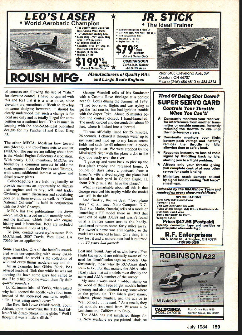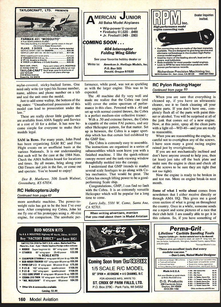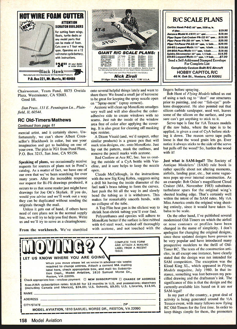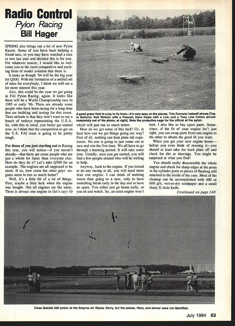 Radio Control Pylon Racing Bill Hager SPRING also brings out lot new Pylon Racers Some have helping friend race may have watched race two last year decided whatever reason would like wel come competitive excit ing form model aviation looks though 84 will big year Q500 formation unified set rules everybody think will see lot interest year Also could year get going FAI Pylon Racing again looks like will World Championship race 1985 early 86 already some people have racing long time building testing event attitude dont want see bunch turkeys representing USA So mind better get started now think competition get US FAI team going pretty rough just starting out Racing year will noticeif havent alreadythat some people just whole lot faster everyone else Lets take Q500 example engines supposed stock come other guys en gines seem run much better Well its little bit lot things First maybe little luck engine bought engines same always engine lets say 10 will just run much better get some luck least can get things going way First nothing can beat plain old expe rience No going just come out race win first time have go through learning period will take some time Usually once get started will find few people around will willing help Anyway back engine intend racing will need engine can think nothing worse going race have something break early day have no spare either just go home early sit watch So extra engine wont hurt also like buy spare parts Some times fit engine isnt just right can swap parts engine other obtain good fit want get new engine home before think running ityou should least take back plate off check dirt shavings might surprised what find should really disassemble whole engine check sharp edges posts cylinder ports pieces flashing still attached inside case Most cleanup can accomzilished 400 600 grit wet-or-dry sandpaper small sharp X-Acto knife July 1984 63 good grass field isa joy fly fromIts very easy planes Formula takeoff shows Top Bottom Nell Watson wIth Polecat Dave Keats LrIa Tony Joe Cohen almost completely out photo right Note protectIve cage offIcial pylon Continued page 160 Close Quickie 500 action Smyrna Air Races Sorry planes fliers winner identified Chairwoman Team Fund 8875 Oveida Plaza Westminster CA 92683 Good lift Dan Pruss 131 E Pennington Ln Plainfield IL 60544 RC Old-Timers/Mathews Continued naqe 61 mercial artist certainly shows Un fortunately cant show Albert Coun sellors Blackhawk color use imagination get building own plan 7G1 Pond Plans PO Box 3215 San Jose CA 95156 Speaking plans occasionally receive requests sources plans Ponds catalog As matter fact have own weve searching over years After incredible response request Bi-Fli drawings produced occurs us some reader just might have drawings Joe Otts Skylark would advise well work out way can duplicated sending originals through mail Unless gets out hand others have need rare plans normal supply line will try help find Write us well try serve clearinghouse workbench Weve stumbled onto several helpful things lately want share found small jar kerosene great keeping spray nozzle open Spray-ment spray cement Acetone will clean up MonoKote smudges very well will also dissolve coloradhesive side create windows no seams Just rub inside window area free color after applying cover ing also great cleaning off masking tape residue Dixon Visaid wed suspect other similar products grease pen will mark trim designs etc onto MonoKote Just lay out pattern mask outlines remove pencil marks acetone Red Costlow Ace RC Inc has us coat ing outside CyA bottle Vas eline sure helps keep nozzle open Claude McCullough instructions new Sig King Kobra suggests using drill bit having inside diameter fuel tanks brass tubing form curves Just push bit way slowly bend tubing withdrawn makes remarkably smooth bends no collapse tube Top Flite heat gun slickest way shrink heat-shrink tubing youll ever find Polyurethanes epoxies will adhere MonoKote better surface first rubbed 6-0 steel wool washed off thoroughly acetone touched COMPLETE THIS FORM AND AFfACH MAILING LABEL FROM RECENT SSU E LET US KNOW WHERE YOU ARE GOIN move please let us know advanceSIX weeks required change address Attach current MA mailing label check appropriate box mail Subscrip tion Dept Model Aviation 1810 Samuel Morse Dr Reston VA 22090 Check appropriate boxenciose payment C NEW SUBSCRIPTION 0 cHANGE OF ADDRESS Non-AMA subscription rates $1800 12 months US possessions elsewhere including Canada Mexico $2400 US Schools $900 US Libraries $1350 NAME ADDRESS CITY/STATE 71P fingers before spraying Bob Hunt Flying Models talked us out using tack rag dust structures prior painting fish-eye prob lems disappeared also pointed out silicon carbide sandpaper used wet leaves some silicon surface sure cant get anything stick Servo tape fine Texaco models tf raw balsa tape applied given coat CyA before stick ing down reason servo tape pulls loose wood grain lets go Ever notice always sticks side servo pulls off wood So harden wood Just what SAM-legal Society Antique Modelers SAM rule book rather specific about altering moments airfoils landing gear etc some vague ness pops up over internal construction As example Bob Oslans magnificent Cloud Cruiser MA November 1983 substitutes turbulator spars original wings sheeted leading edge Thats certainly well within intent SAM rules /2A Miss America omits original wing sheet ing entirely since would have taken VM balsa scale other hand Ive published several modernized Old-Timers airfoil nose contours profiles have changed name simplicity dont apologize changing original designs since updated designs have proven very popular have introduced prospective modelers thrill OldTimer RC texts construction arti cles except instance have clearly stated design intended SAM competition exception Kloud King XL appeared Flying Models magazine July 1980 stance something lost between pen cilled drawing draftsmans ink significance design currently-available kits