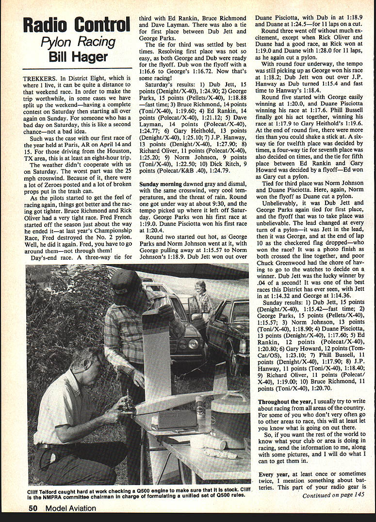 Radio Contml Pylon Racing Bill Hager TREKKERS District Eight live can quite distance weekend race order make trip worthwhile some cases have split up weekendhaving complete contest Saturday starting over again Sunday someone has bad day Saturday like second chancenot bad idea Such case first race year held Paris AR April 14 15 driving Houston TX area least eight-hour trip weather didnt cooperate us Saturday worst part 25 mph crosswind Because lot Zeroes posted lot broken props put trash can As pilots started get feel racing again things got better rac ing got tighter Bruce Richmond Rick Oliver very tight race Fred French started off season just about way ended itat last years Championship Race Fred destroyed No 2 pylon Well did again Fred have go around themnot through Days-end race three-way tie third Ed Rankin Bruce Richmond Dave Layman also tie first place between Dub Jett George Parks tie third settled best times Resolving first place easy both George Dub ready flyoff Dub won flyoff 1166 Georges 11672 Now thats some racing Saturdays results 1 Dub Jett 15 points Denight/X-40 12490 2 George Parks 15 points Pellets/X-40 11888 fast time 3 Bruce Richmond 14 points Toni/X-40 11960 4 Ed Rankin 14 points Polecat/X-40 12112 5 Dave Layman 14 points Polecat/X-40 12477 6 Gary Heithold 13 points Denight/X-40 12510 7 JP Hanway 13 points Denight/X-40 12790 8 Richard Oliver 11 points Polecat/X-40 12520 9 Norm Johnson 9 points Toni/X-40 12250 10 Dick Ritch 9 points Polecat/K&B 40 12479 Sunday morning dawned gray dismal same crosswind very cool tem peratures threat rain Round got under way about 930 tempo picked up left off Satur day George Parks won first race 1190 Duane Pisciotta won first race 1204 Round two started out hot George Parks Norm Johnson went George puffing away 11557 Norm Johnsons 1189 Dub Jett won out over Duane Pisciotta Dub 1189 Duane 1245for 11 laps cut Round three went off much ex citement except Rick Oliver Duane good race Rick won 1190 Duane 1280 11 laps again cut pylon round four underway tempo still picking up George won race 1182 Dub Jett won out over JP Hanway Dub turned 1154 fast time Hanways 1184 Round five started George easily winning 1200 Duane Pisciotta winning race 1176 Phill Bussell finally got act together winning race 1179 Gary Heitholds 1196 end round five ties could shake stick six way tie twelfth place decided times four-way tie seventh place also decided times tie fifth place between Ed Rankin Gary Howard decided flyoffEd won Gary cut pylon Tied third place Norm Johnson Duane Pisciotta again Norm won flyoff Duane cut pylon Unbelievably Dub Jett nd George Parks again tied first place flyoff take place unbelievable lead changed turn pylonit Jett lead George end lap 10 checkered flag droppedwho won race photo finish both crossed line together poor Chuck Greenwood chore hav ing go watches decide winner Dub Jett lucky winner 04 second best races District has ever seen Jett 11432 George 11436 Sunday results 1 Dub Jett 15 points Denight/X-40 11542fast time 2 George Parks 15 points Pellets/X-40 11557 3 Norm Johnson 13 points Toni/X-40 11890 4 Duane Pisciotta 13 points Denight/X-40 11760 5 Ed Rankin 12 points Polecat/X-40 12080 6 Gary Howard 12 points Tom Cat/OS 12310 7 Phill Bussell 11 points Denight/X-40 11790 8 JP Hanway 11 points Toni/X-40 11840 9 Richard Oliver 11 points Polecat X-40 11900 10 Bruce Richmond 11 points Toni/X-40 12070 Throughout year usually try write about racing areas country some dont very often go other areas race will least let know what going out So want rest world know what club area doing racing send information along some pictures will what can get year least once sometimes twice mention something about bat teries part radio gear Continued page 145 50 Model Aviation Cliff Teiford caught hard work checking 0500 engine make sure stock Cliff NMPRA committee chairman charge formuiating unified set 0500 rules good four flights its 70 mAh pack discharged recharged field Well seems terest some folks Im preparing submission MA Good Editor goes youll see way Specifically have very simple homebrew accessory easy low-cost build will safely run small flight packs down point can safely recharge same equipment use motor batter ies sounds good stay tuned what readings really mean expanded information use switches connectors assembling battery packs Remember have ideas along linethings youd like see cludedor how-to things youd like shareplease send em Bob Kopski 25 West End Dr Lans dale PA 19446 Happy landings RC Pylon RacinglHage Continued page 50 OK kept charged did regularly take pack out inspect Well day forward have paid careful attention batteries ways products market help monitoring batteries use Power Pacer personal preference unit will completely cycle Ni-Cd battery pack have bad cells will also know right away sure lot better finding bad cells bench middle race Ive recently opportunity see copy Electric Flight Dave Day book published Great Britain available Motorbooks International 729 Prospect Ave Osceola WI 54020 Sorry dont know cost Its fairly small book about 6 x 8 94 pages lots pictures product de scriptions performance information foreign merchandise may readily available country book includes some basic some how-to information probably useful overview wide range Electric accomplishments source inspiration new ideas As preview some topics covered future RC Electrics include basic elec trical terms meanings applied Electric flight use meters probably its weakest link prob ably neglected itemsand usually put forward part plane vibration worst havent done yet maybe now too late take pack out check thoroughly Check wires plug Repack batteries good soft foam rubber reinstalling pack make sure wedge too tightly About five years ago lost plane flown two full seasons plane probably best plane have ever owned middle race going number pylon couldnt get turn just flew woods guessed itbad batteries three bad cells flight pack batteries over three years 