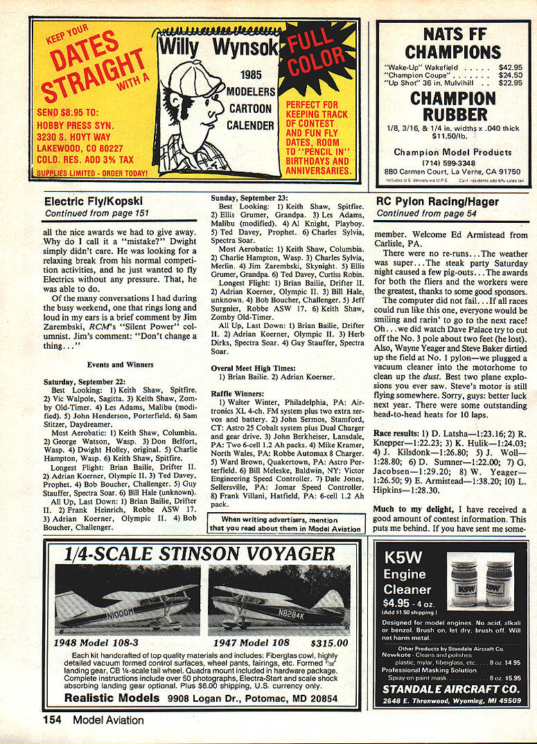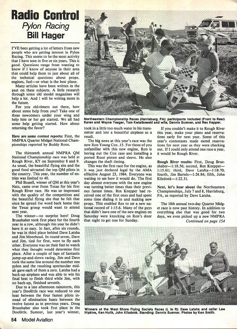 Radio Control Pylon Racing Bill Hager IVE getting lot letters new people getting interest Pylon Racing seems activity have seen five six years good Questions range wanting know know anyone area could help just about technical questions about props engines fuelor what best plane articles have written past subjects little research through some old model magazines will help lot will writing future old-timers out about some help Take newcomers under wing help him get started some help getting started about returning favor some contest reports First NMPRA Quarter Midget National Cham pionships reported Buddy Roos thirteenth annual NMPRA QM National Championship race held Rough River KY September 8 9 As usual beautiful flying site good food attracted top QM pilots country year number en tries limited 40 Phil Russell winner QM years Nats came over Texas first Rough River race impressed quality competition beautiful flying site felt once spread word back home Texas group would want attend next year winnerno surprise Doug Brueshaber took first place fourth year row although year didnt have easy fact after six rounds third place behind Dave Latsha Jim Moorhead round seven Dave Jim tied first fly other Everyone feet watch what thought would determine first place After couple laps fantastic jump-up-and-down racing Jim Dave took same line around number pylon resulting spectacular mid air gave zero Latsha back-up airplane able win final heat finish third Jim no back-up finished seventh Due late afternoon rainstorm years Doolittle race reduced heat between four fastest pilots stead elimination heats between twelve fastest previous years Doug Brueshaber also took first place Doolittle Sumner last years winner took little too much water trans mitter lost beautiful airplane result big news years race new Ron Young Cox 15 unfamiliar new engine Ron boring out Cox case installing ported Rossi piston sleeve also changes shaft timing first race engine just declared legal AMA effective August 23 1984 Everyone waiting see would first day almost everyone new engine turning better times previ ous fastest times Rex Knepper re ceived first ones spent some time dialing making new props enabled Rex set new na tional record 1156 guys didnt have new engines Saturday knocking Rons door night get Sunday couldnt make Rough River year make plans reserva tions early next year Some years contestants made motel reserva tions next year checking out could attend race year would Rough River Rough River results First Doug Brue shaberl 1856 second Rex Knepper 11561 third Dave Latshal1870 fourth Jim Bartelsl2484 fifth John Kilsdonkl 2231 Next lets hear about Northeastern Championships July 7 8 Harrisburg PA reported Dave Latsha 10th annual two-day Quarter Midg et race now past history addition everything else good two days picked up new NMPRA Continued page 154 54 Model Aviation Northeastern Championship Races Harrisburg PA participants included Front Rear Karen Wayne Yeager Tom Kwlatkowski wife Dennis Sumner Rex Kepper Winners West Shore Flying Society Races 1 R Dave Lataha calier Law Hipkins Ken Hulik John Kiladonk Standing Dennis Sumner Photos Ken Smith Electric FIyIKopski Continued page 151 nice awards give away call mistake Dwight simply didnt care looking relaxing break normal competi tion activities just wanted fly Electrics pressure able conversations during busy weekend rings long loud ears brief comment Jim Zarembski RCMs Silent Power col unmist Jims comment Dont change thing. Events Winners Saturday September 22 Best Looking 1 Keith Shaw Spitfire 2 Vic Walpole Sagitta 3 Keith Shaw Zom Old-Timer 4 Les Adams Malibu modi fied 5 John Henderson Porterfield 6 Sam Stitzer Daydreamer Most Acrobatic 1 Keith Shaw Columbia 2 George Watson Wasp 3 Don Belfort Wasp 4 Dwight Holley original 5 Charlie Hampton Wasp 6 Keith Shaw Spitfire Longest Flight Brian Bailie Drifter II 2 Adrian Koerner Olympic II 3 Ted Davey Prophet 4 Bob Boucher Challenger 5 Guy Stauffer Spectra Soar 6 Bill Hale unknown Up Last Down 1 Brian Bailie Drifter II 2 Frank Heinrich Robbe ASW 17 3 Adrian Koerner Olympic II 4 Bob Boucher Challenger Sunday September 23 Best Looking 1 Keith Shaw Spitfire 2 Ellis Grumer Grandpa 3 Les Adams Malibu modified 4 Al Knight Playboy 5 Ted Davey Prophet 6 Charles Sylvia Spectra Soar Most Aerobatic 1 Keith Shaw Columbia 2 Charlie Hampton Wasp 3 Charles Sylvia Merlin 4 Jim Zarembski Skynight 5 Ellis Grunier Grandpa 6 Ted Davey Curtiss Robin Longest Flight 1 Brian Bailie Drifter II 2 Adrian Koerner Olympic II 3 Bill Hale unknown 4 Bob Boucher Challenger 5 Jeff Surgnier Robbe ASW 17 6 Keith Shaw Zomby Old-Timer Up Last Down 1 Brian Bailie Drifter II 2 Adrian Koerner Olympic II 3 Herb Dirks Spectra Soar 4 Guy Stauffer Spectra Soar Overal Meet High Times 1 Brian Bailie 2 Adrian Koerner Raffle Winners 1 Walter Winter Philadelphia PA Air tronics XL 4-ch FM system plus two extra ser vos battery 2 John Sermos Stamford CT Astro 25 Cobalt system plus Dual Charger gear drive 3 John Berkheiser Lansdale PA Two 6-cell 12 Ah packs 4 Mike Kramer North Wales PA Robbe Automax 8 Charger 5 Ward Brown Quakertown PA Astro Por terfield 6 Bill Meleske Baldwin NY Victor Engineering Speed Controller 7 Dale Jones Sellersville PA Jomar Speed Controller 8 Frank Villani Hatfield PA 6-cell 12 Ah pack writing advertisers mention read about Model Aviation RC Pylon RacinglHager Continued page 54 member Welcome Ed Armistead Carlisle PA no re-runs. weather super ak party Saturday night caused few pig-outs. awards both fliers workers greatest thanks some good sponsors computer did fail. s could run like everyone would smiling rarin go next race Oh. did watch Dave Palace try cut off No 3 pole about two feet lost Also Wayne Yeager Steve Baker dirtied up field No 1 pylonwe plugged vacuum cleaner motorhome clean up dust Best two plane explo sions ever saw Steves motor still flying somewhere Sorry guys better luck next year some outstanding head-to-head heats 10 laps Race result